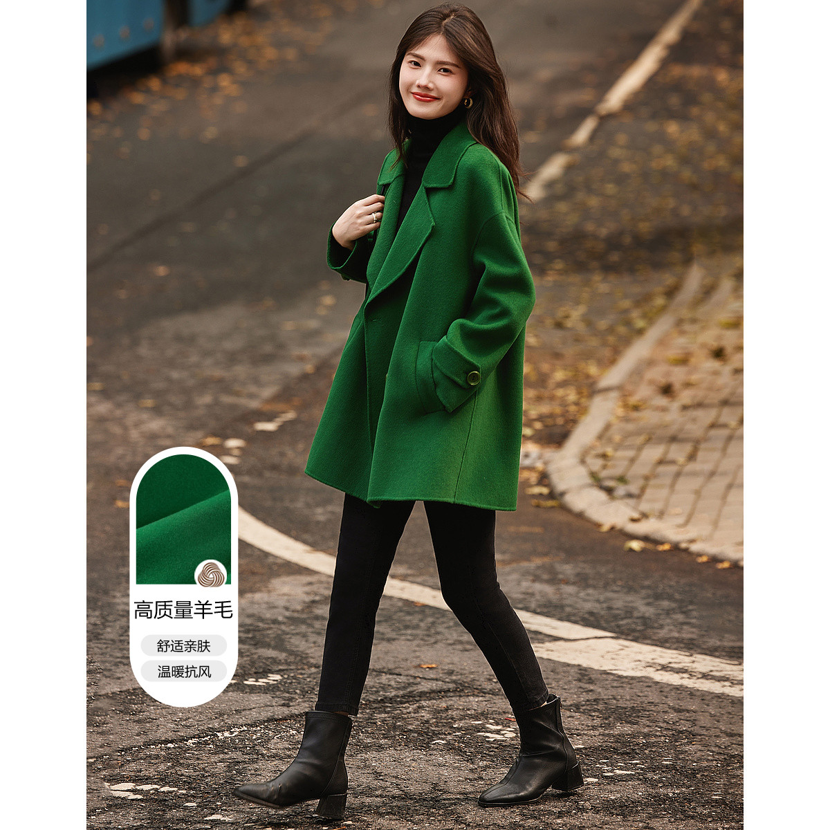 弹性: 无弹 版型: 直筒 衣长: 中长 风格: 都市 适用季节: 秋,冬 领型: 大翻领 衣门襟: 双排扣 袖型: 常规 袖长: 长袖 适用人群: 青年 面料: 羊毛,绵羊毛 肩型: 常规肩 里材质: 涤纶/聚酯纤维 上市年份: 2023 生产/经销/进口厂家: 宁波德玛纳瑞品服饰有限公司 适用性别: 女士 厂家地址: 安徽省芜湖市三山经济开发区保定街道焦弯路3号 洗涤说明: 凡是棉、麻、丝、毛天然面料都会有轻微褪色、变型、起皱、缩水现象,为减少或避免以上情况发生在洗涤保养上需特别小心。洗涤时应选用冷水(30度以下),中性或酸性洗衣手洗(丝、毛面料应选用专业洗衣液),不宜浸泡(2分钟左右),即泡即洗,不可氯漂。为避免染色,清洗与晾晒时,深浅色应分开,不宜拧过干,反面阴干 是否双面可穿: 否 是否连帽可脱卸: 否 详细材质信息: 绿色:材质一:71.8%绵羊毛28.2%聚酯纤维(连接线除外) 材质二:69.6%绵羊毛25.3%聚酯纤维5.1%其他纤维(连接线除外) 黑色:70%绵羊毛24.8%聚酯纤维5.2%其他纤维(连接线除外) 驼色:69.7%绵羊毛26.7%聚酯纤维3.6%其他纤维(连接线除外) 主款式: 直筒大衣 主风格: 极简 执行标准: Q/DMN 002-2016 毛领: 无毛领 是否有毛领: 无毛领 产地: 中国 商品配件: 暂无 商品编码: G538420830401401 收起商品展示IMAGE