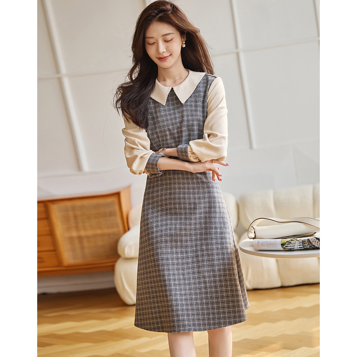 弹性: 无弹 版型: 收腰 裙长: 中裙 厚薄: 厚 详细材质信息: 大身面料:100%聚酯纤维 拼接面料:98.6%聚酯纤维 1.4%氨纶 里料:100%聚酯纤维 风格: 文艺风 流行元素: 腰带 适用季节: 秋,冬 领型: 娃娃领 衣门襟: 拉链 裙型: X版型 袖型: 衬衫袖 袖长: 长袖 腰型: 中腰 适用人群: 青年 面料: 涤纶/聚酯纤维 肩型: 常规肩 款式: 小洋裙 组合形式: 单件 生产/经销/进口厂家: 宁波德玛纳瑞品服饰有限公司 适用性别: 女士 厂家地址: 安徽省芜湖市三山经济开发区保定街道焦弯路3号 洗涤说明: 凡是棉、麻、丝、毛天然面料都会有轻微褪色、变型、起皱、缩水现象,为减少或避免以上情况发生在洗涤保养上需特别小心。洗涤时应选用冷水(30度以下),中性或酸性洗衣手洗(丝、毛面料应选用专业洗衣液),不宜浸泡(2分钟左右),即泡即洗,不可氯漂。为避免染色,清洗与晾晒时,深浅色应分开,不宜拧过干,反面阴干 主风格: 文艺风 执行标准: Q/DMN 016-2018 廓形: X型 主款式: 小洋裙 产地: 中国 商品配件: 暂无 商品编码: G538421520409201 收起商品展示IMAGE