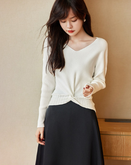 【V领】春秋季款法式浪漫风温柔精致扭结套头长袖针织衫女