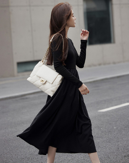 【面料拼接】2023秋季新品肩部镂空设计圆领长款连衣裙