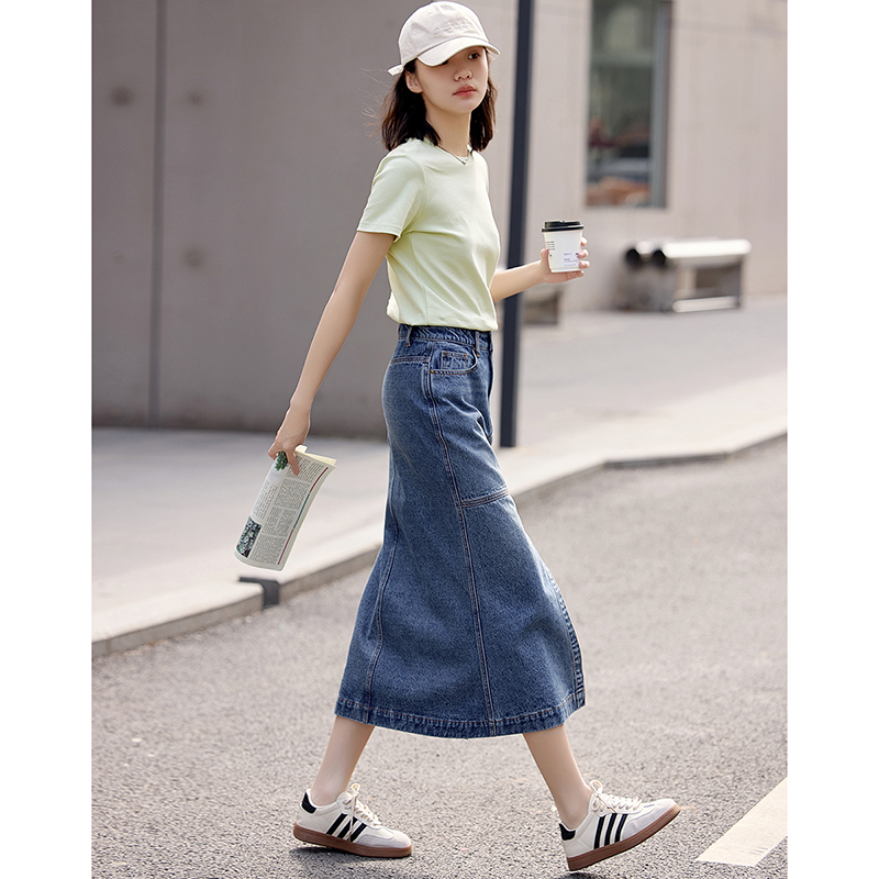 德玛纳蓝色牛仔半身裙女夏季新款中长休闲高腰显高显瘦A字裙