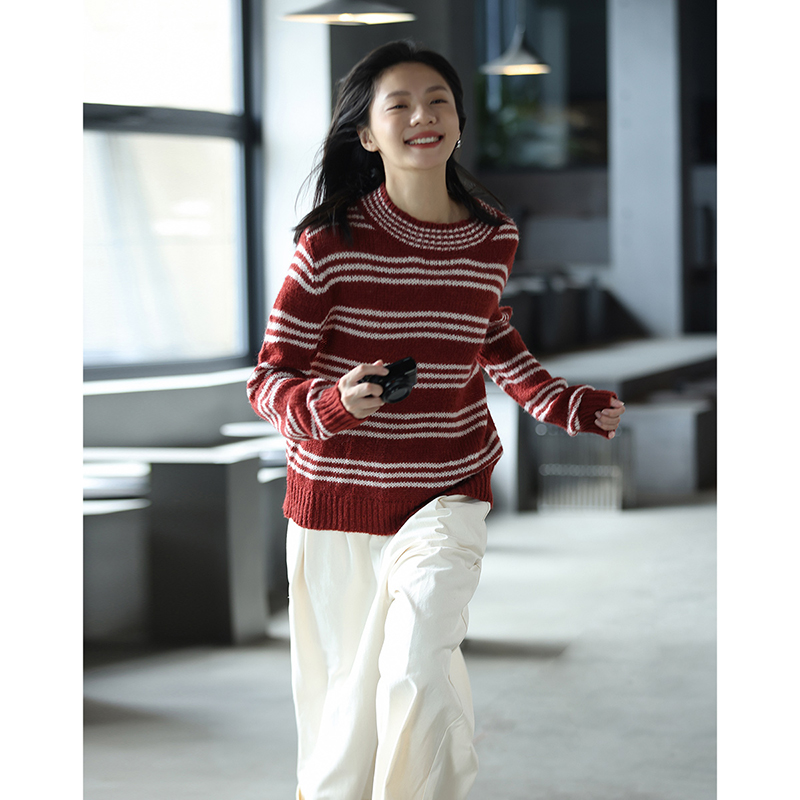 德玛纳复古条纹宽松慵懒风毛衣女秋冬季新款外穿外套针织上衣