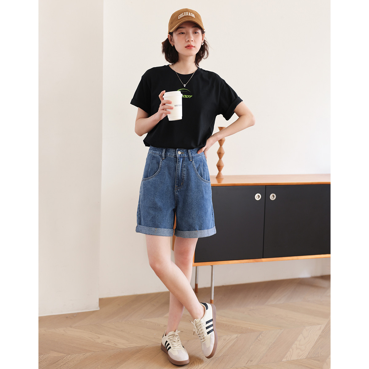 德玛纳夏季新款薄款牛仔短裤女士高腰显瘦小个子直筒阔腿裤子