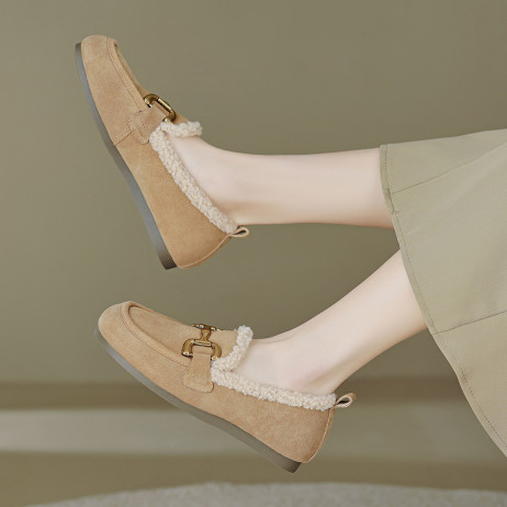 2023年冬季新款日常通勤百搭美拉德色系绒面金属饰扣圆头毛毛鞋