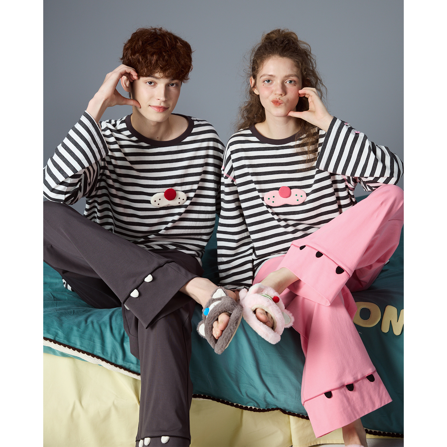 yso【酷猫系列】春秋情侣女圆领条纹套装男可外穿家居服A