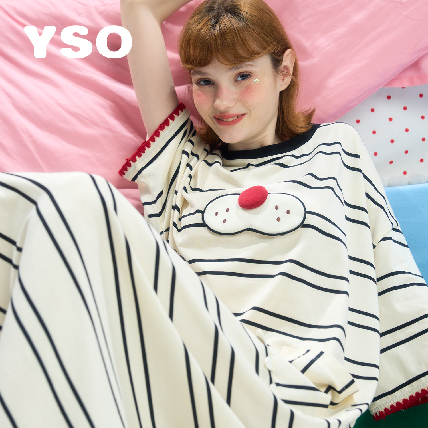 yso【酷猫系列】睡衣女春秋全棉短袖长款睡裙休闲条纹家居服C
