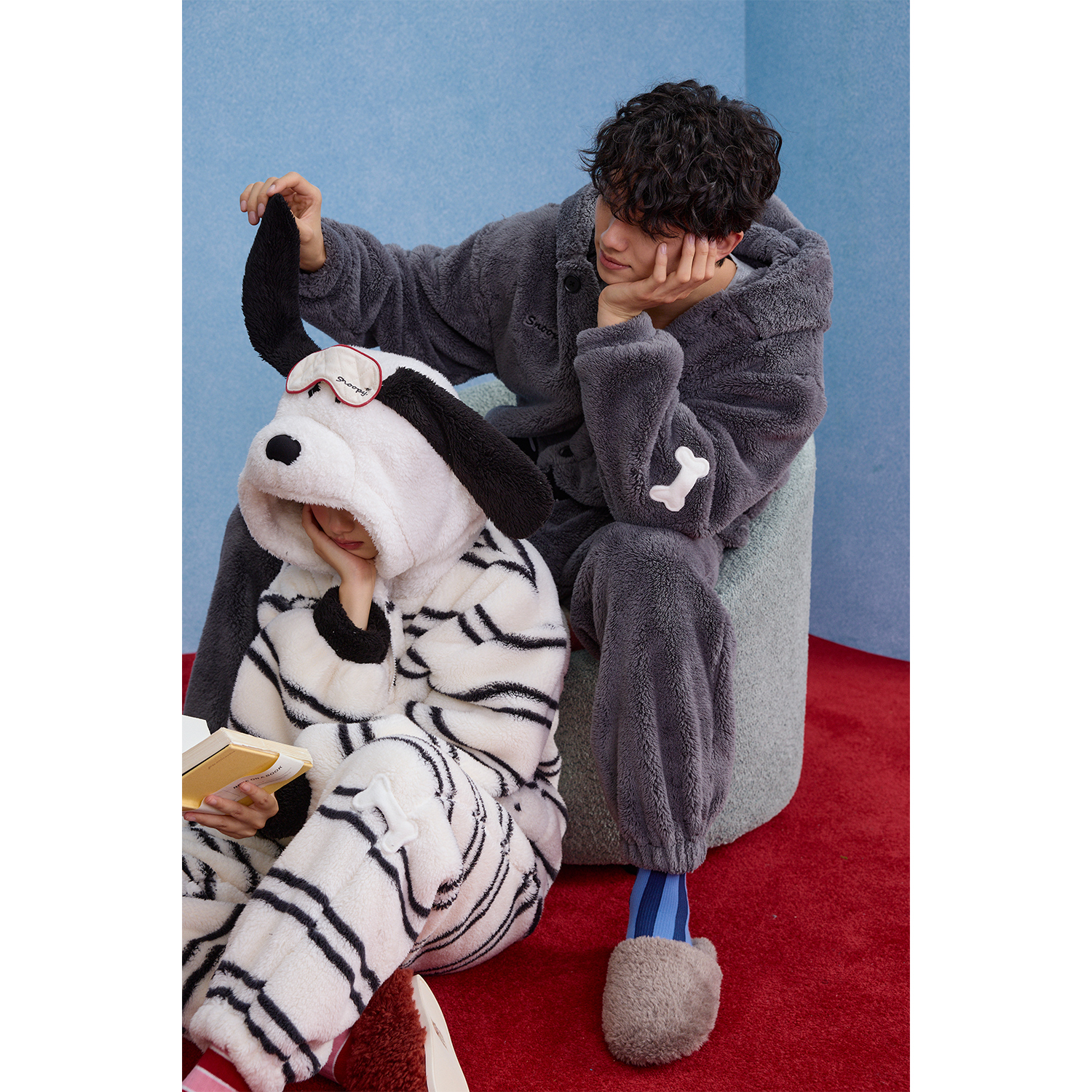 yso【史努比系列】睡衣秋冬情侣款加绒保暖珊瑚连帽冬男女款套装D