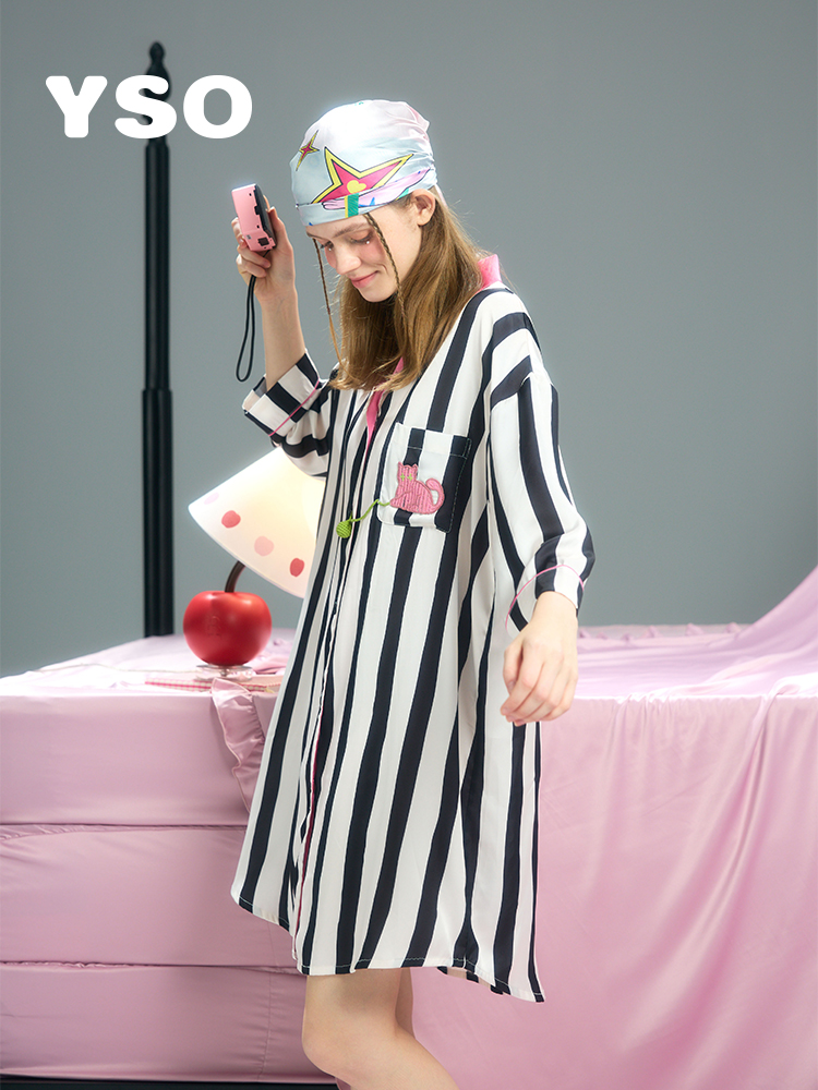 yso【酷猫系列】睡裙女薄款长袖衬衫裙可爱条纹睡衣女春秋家居服