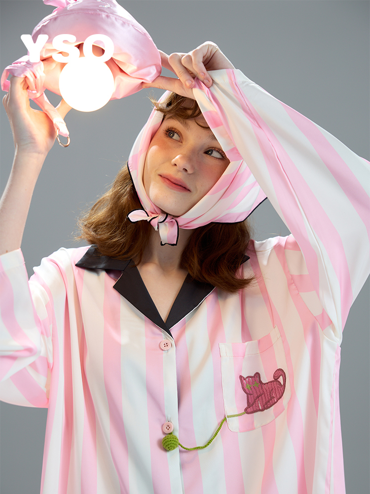 yso【酷猫系列】睡衣女春秋冰丝套装甜美可爱猫咪家居服可外穿A