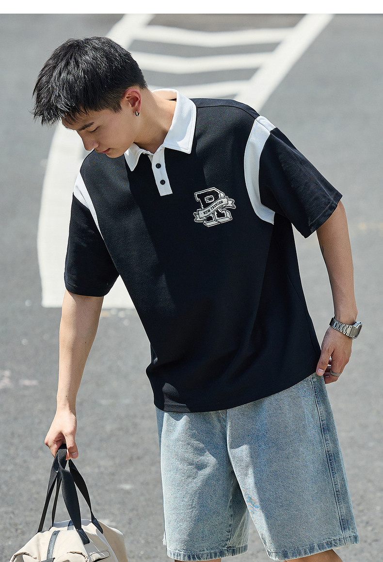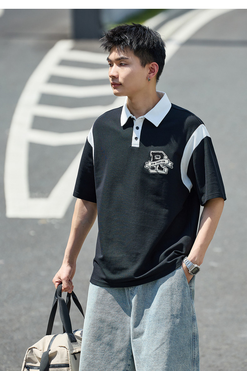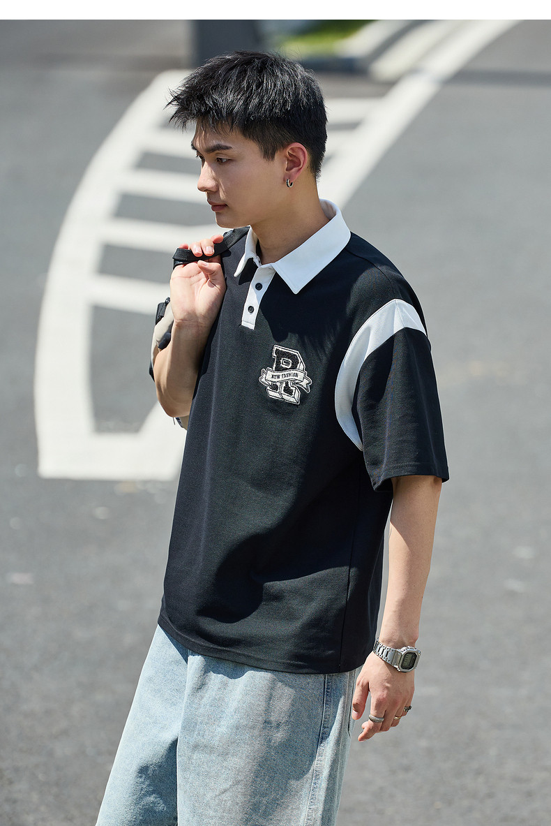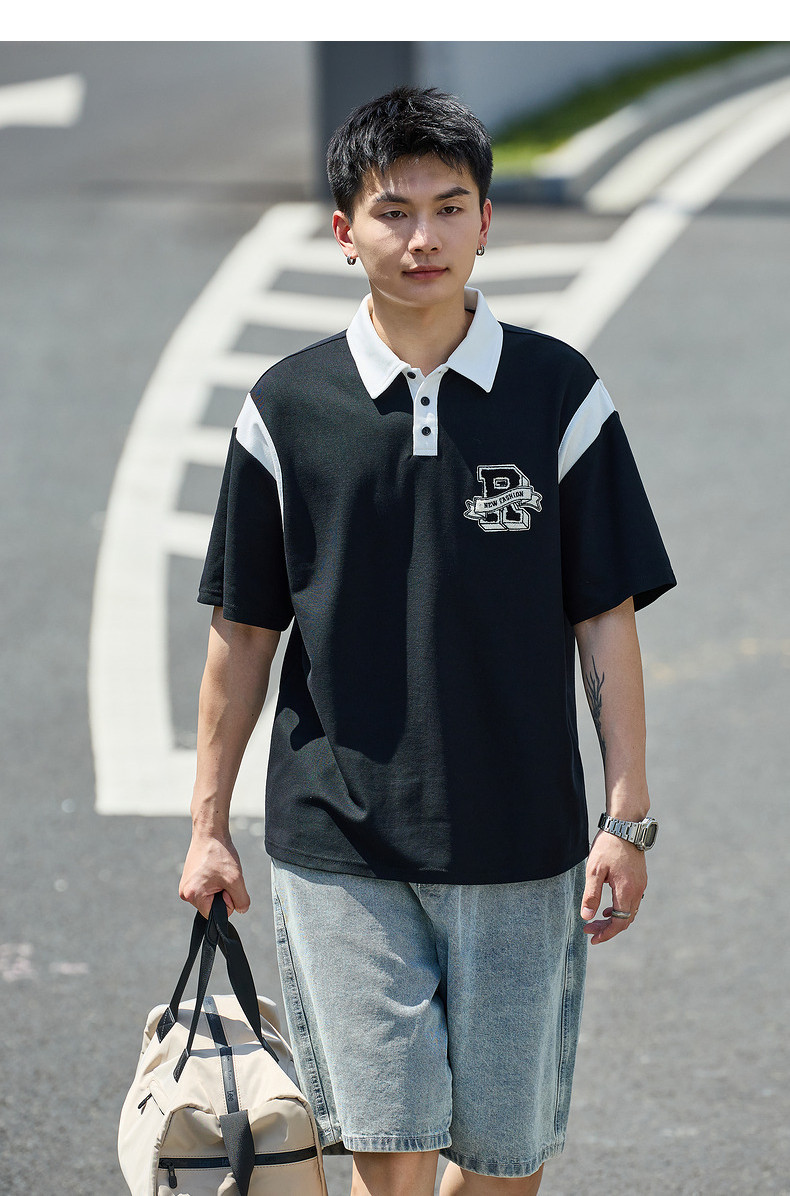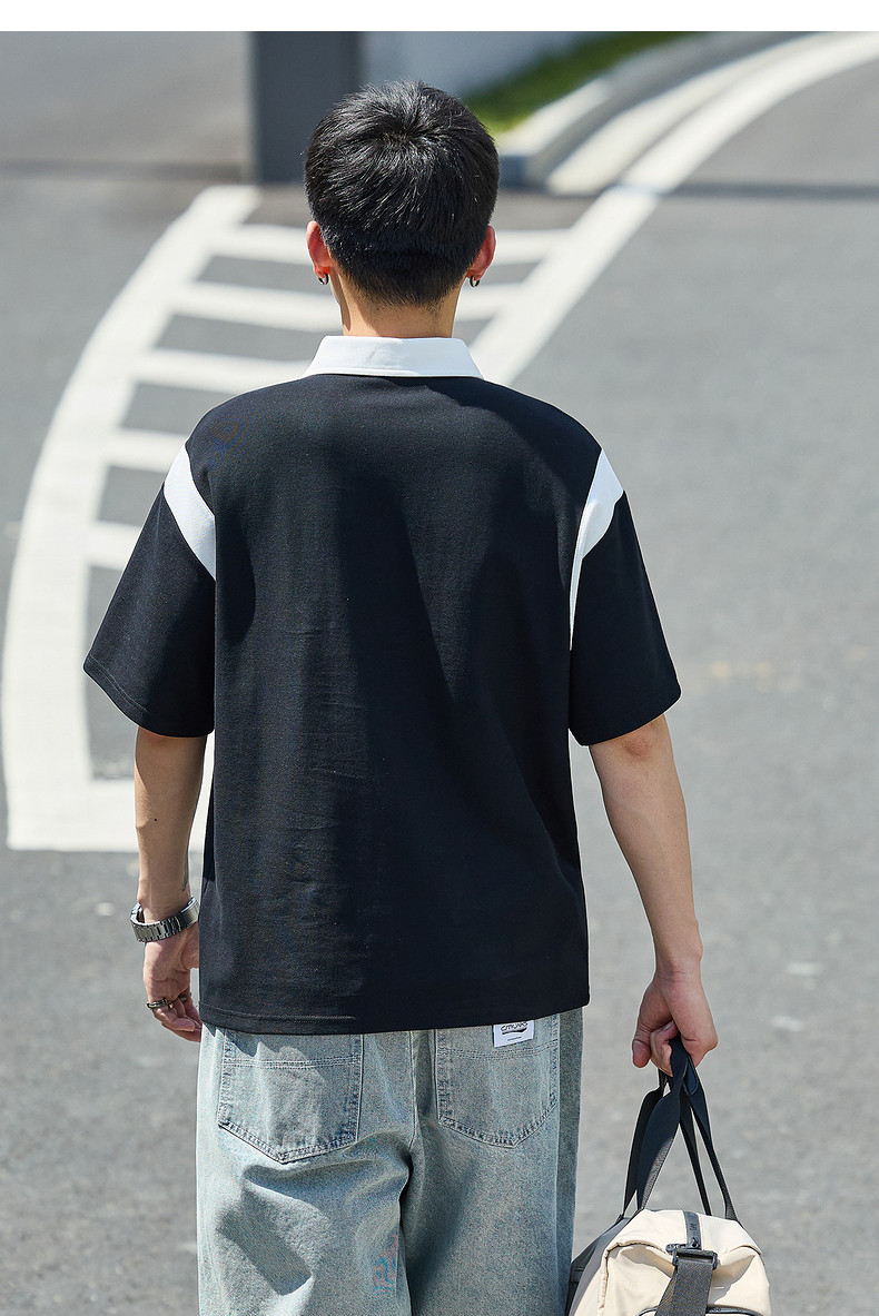 唐狮2024夏季新款短袖polo衫男宽松黑色拼接上衣男带有翻领t恤潮