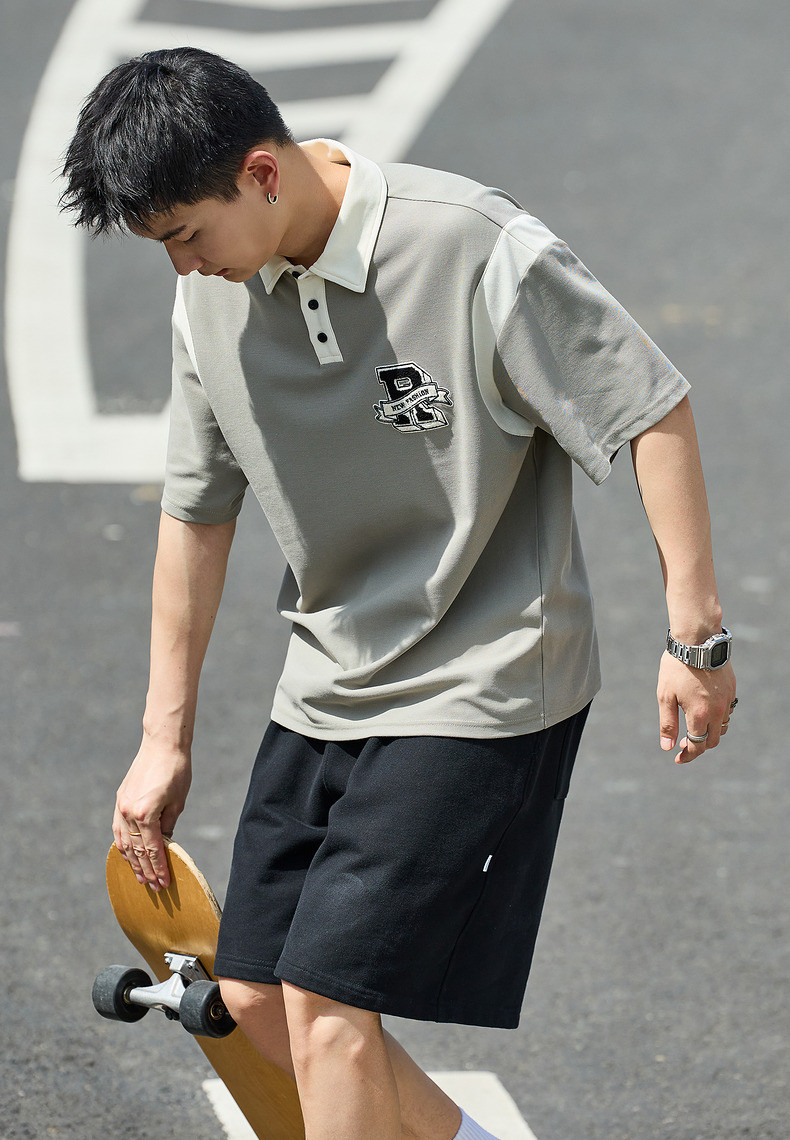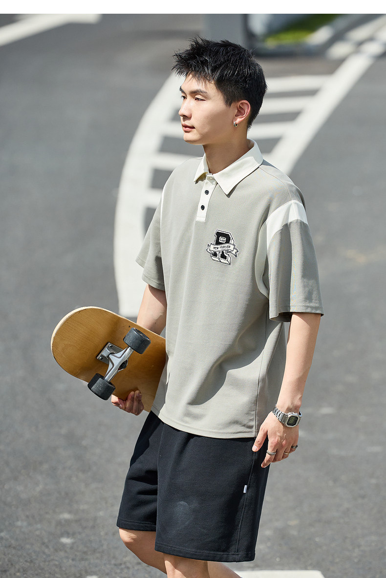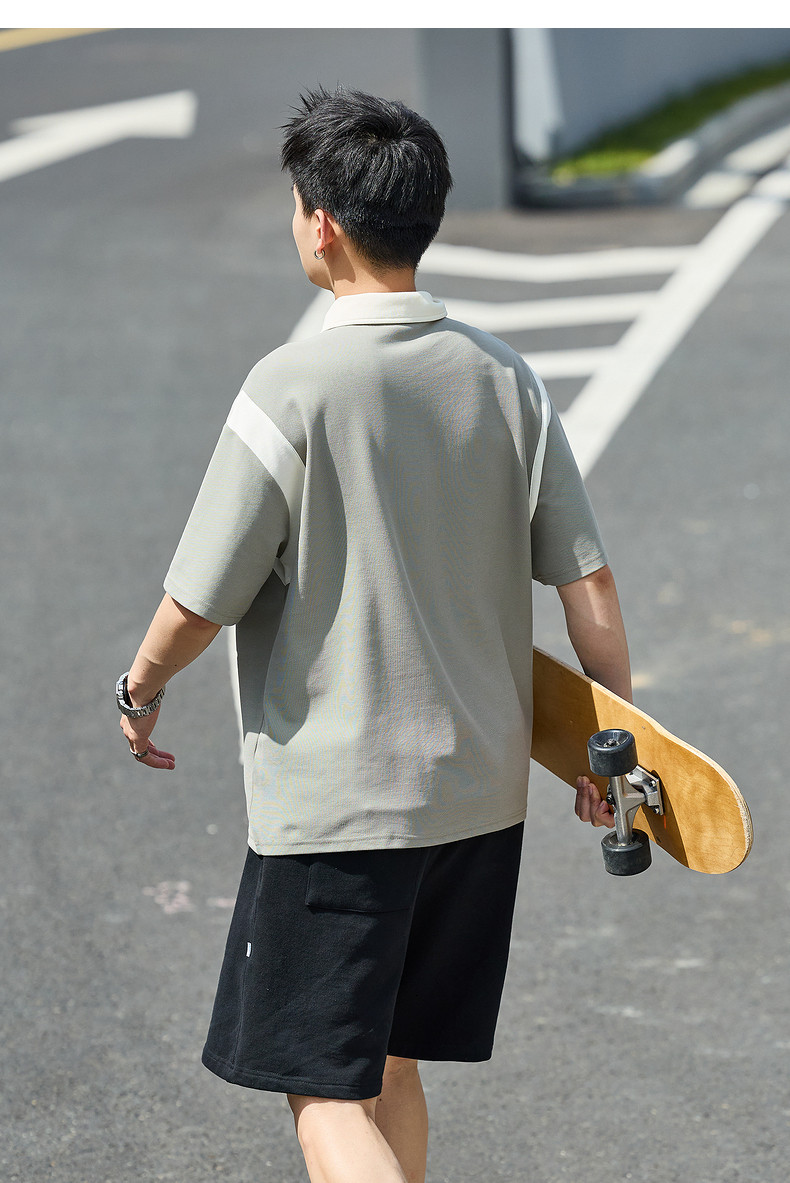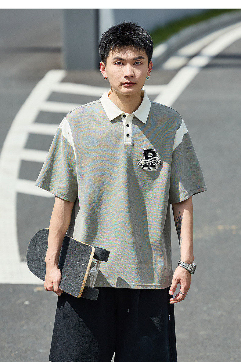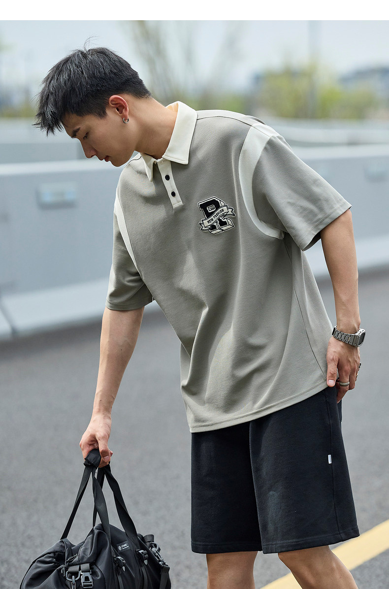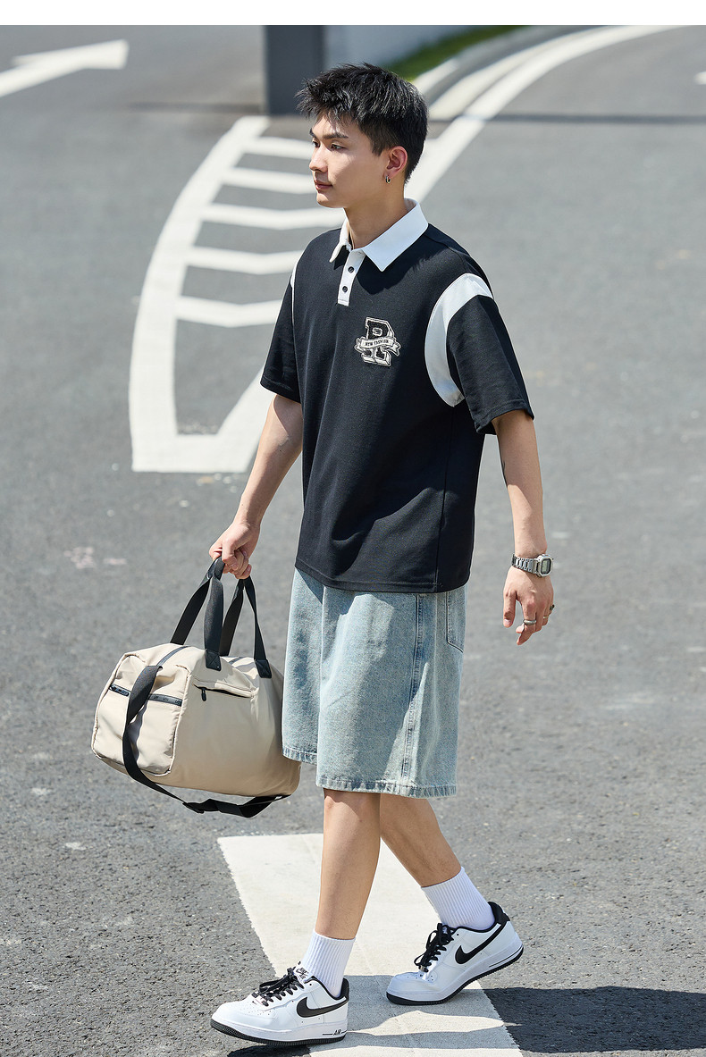 唐狮2024夏季新款短袖polo衫男宽松黑色拼接上衣男带有翻领t恤潮