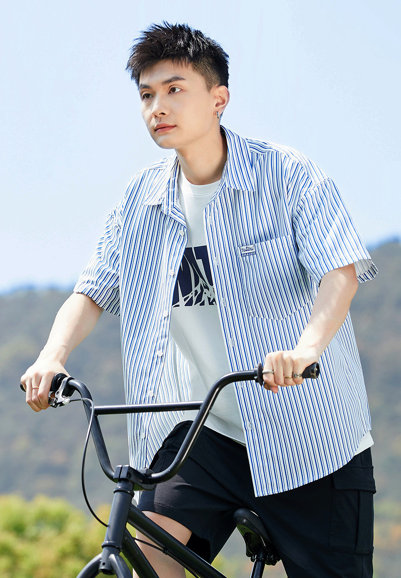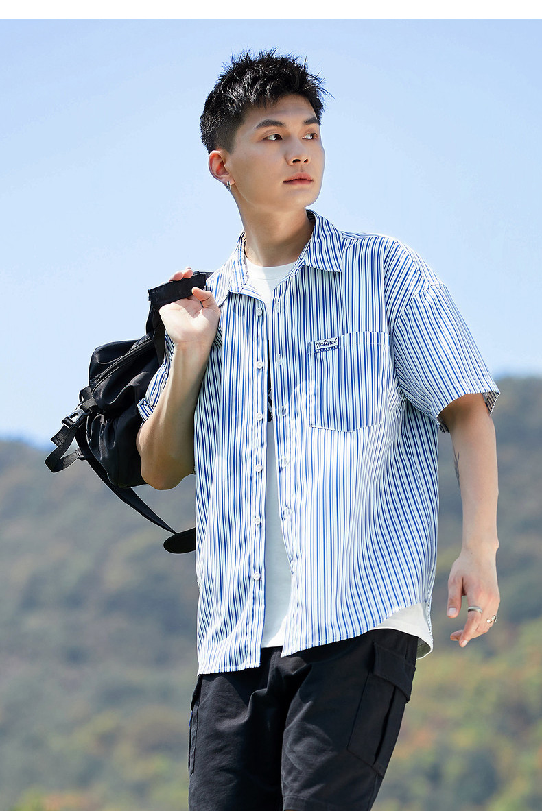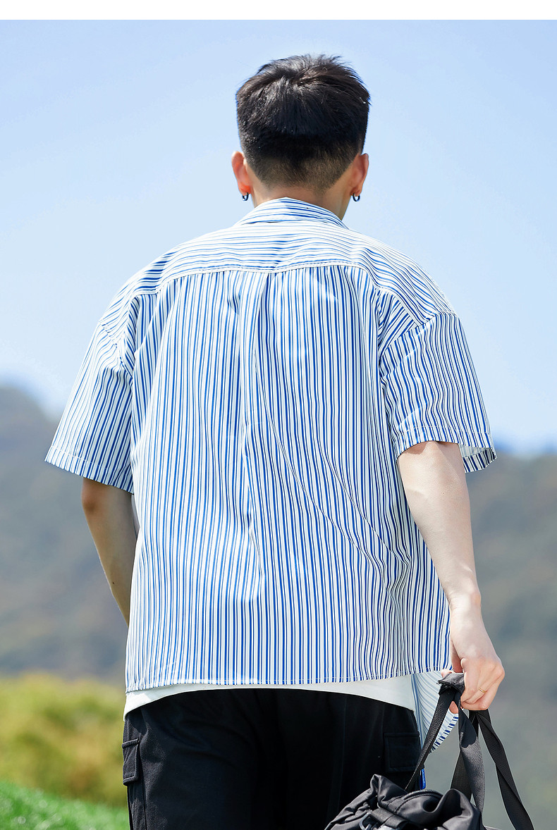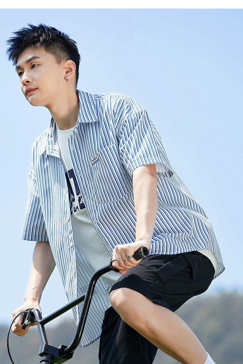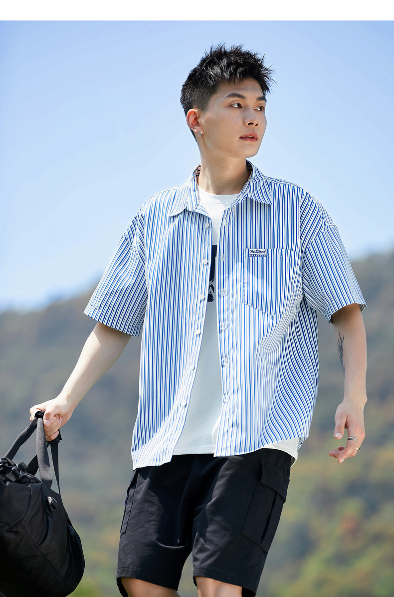 唐狮2024夏季新款条纹短袖衬衫男翻领单口袋小标日系休闲衬衣外套