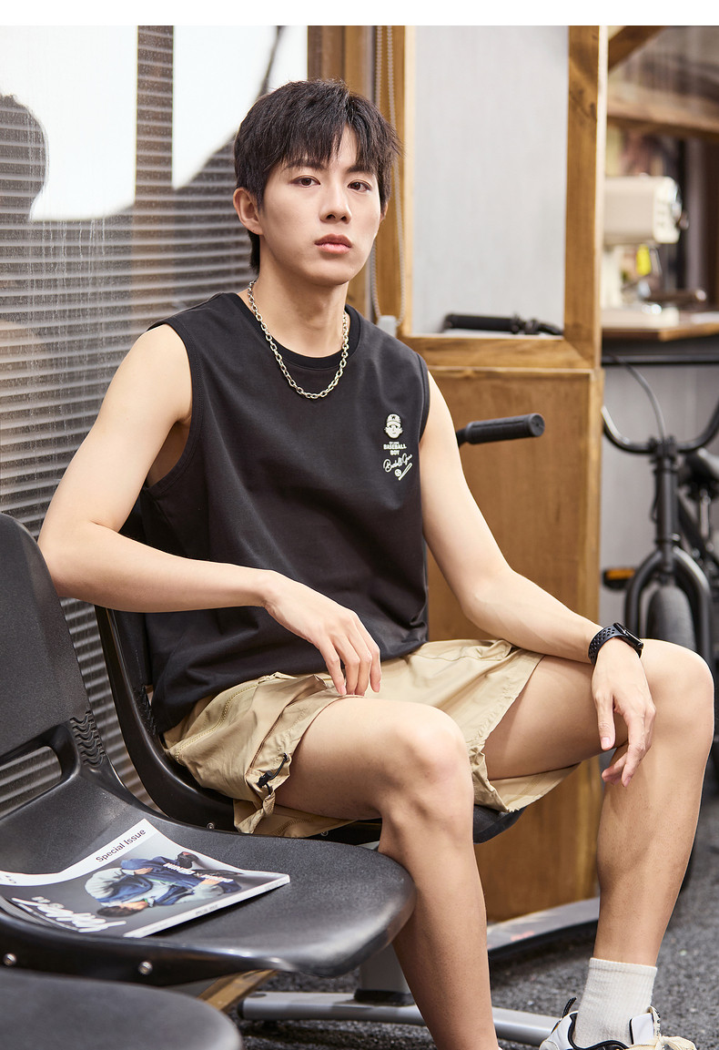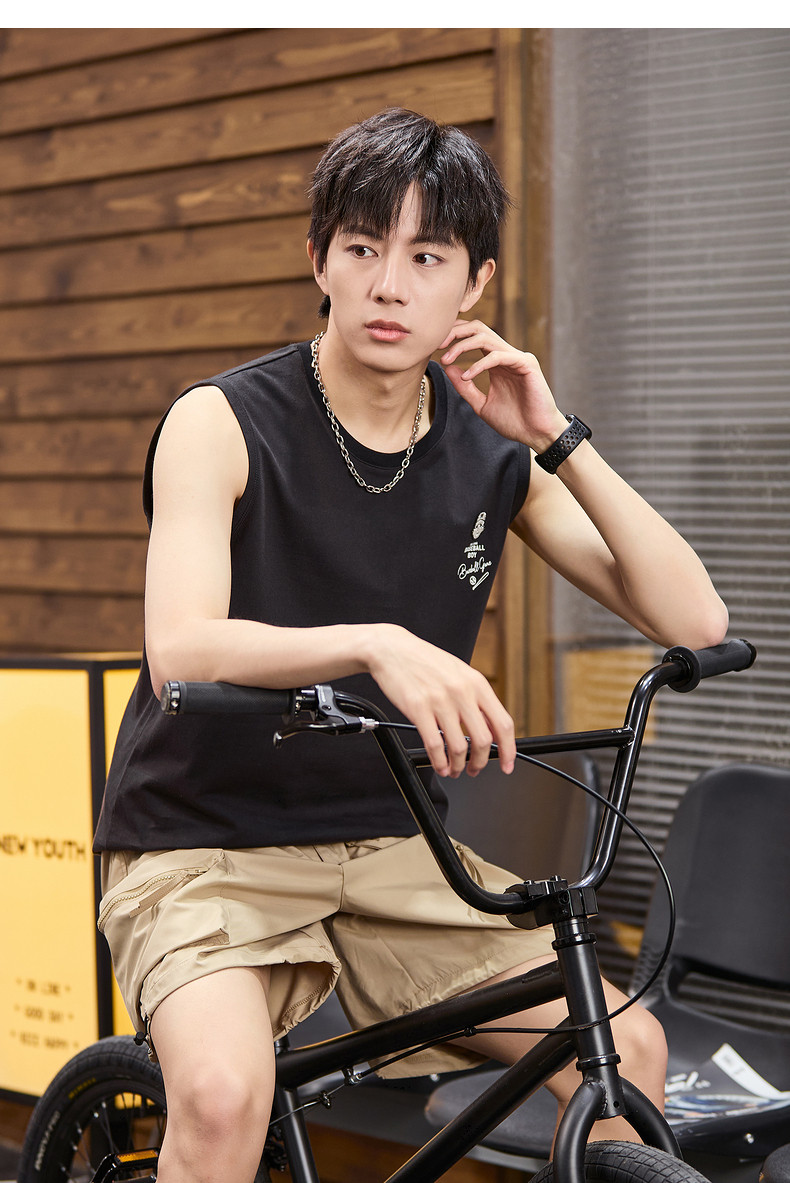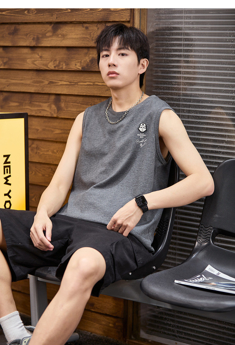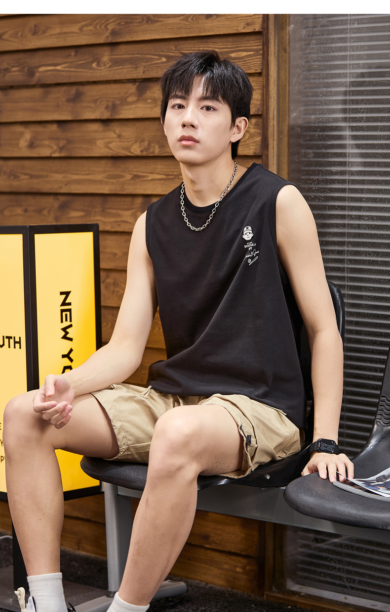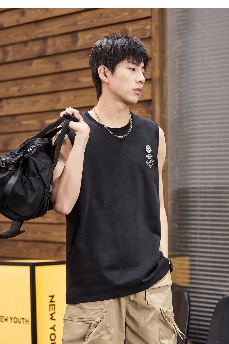 唐狮2024春夏新款男背心坎肩无袖T恤后背印花港风圆领上衣打底衫