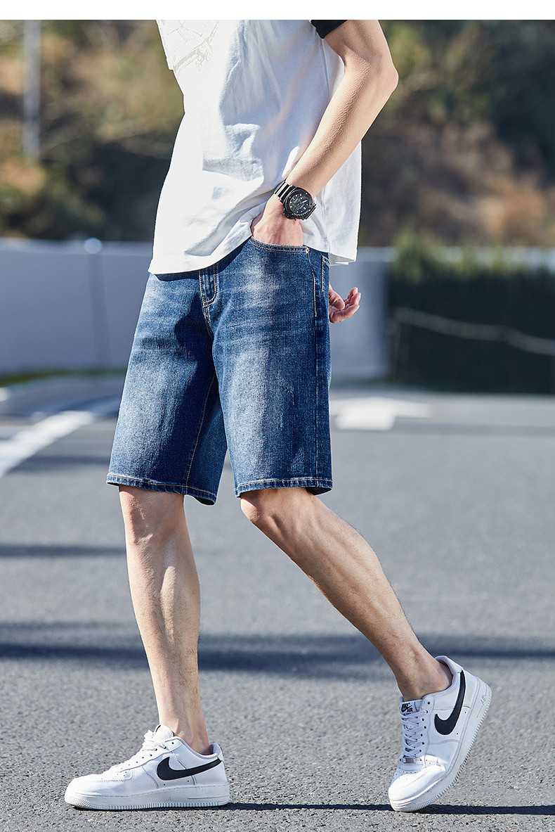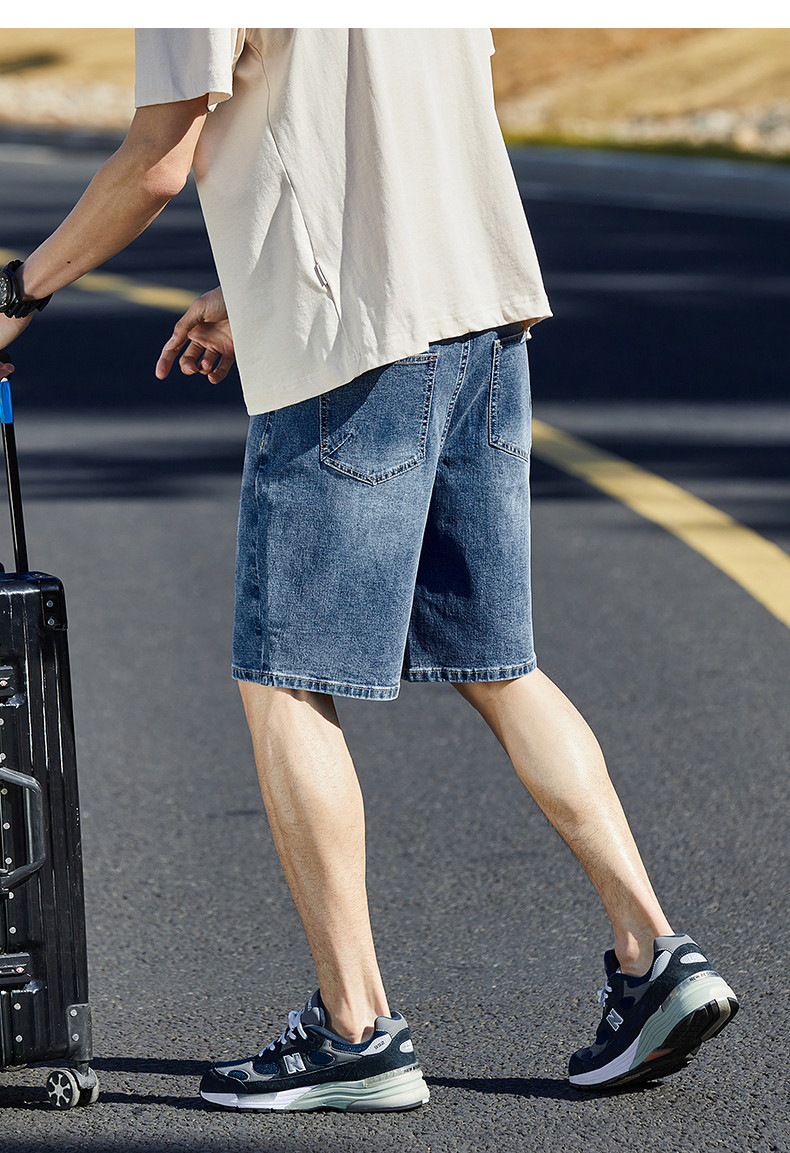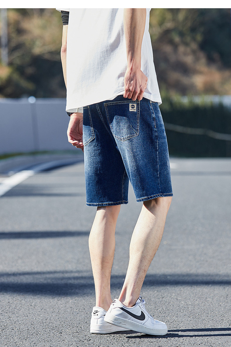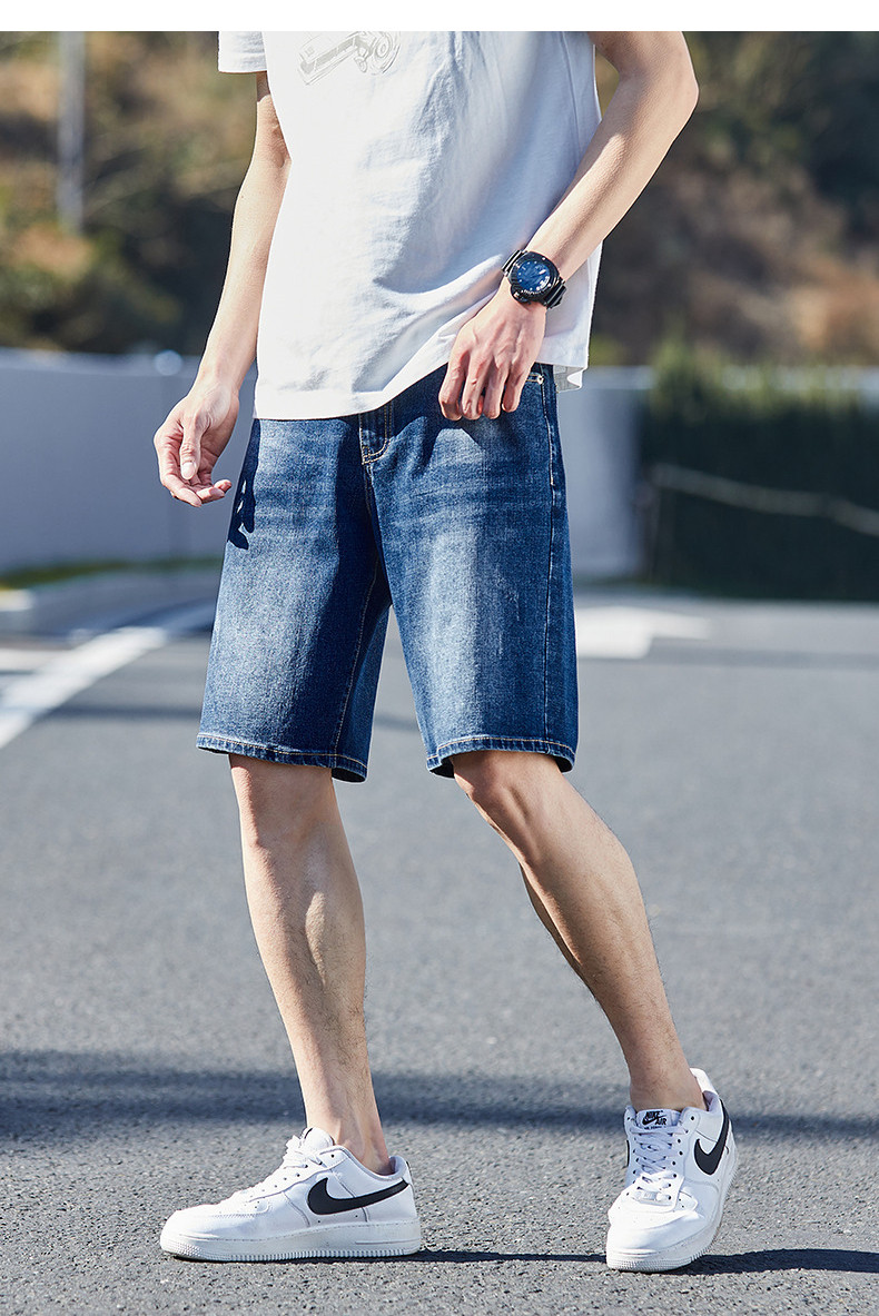 唐狮24夏季新款男牛仔中裤修身弹力潮流绣字直筒经典水洗五分短裤