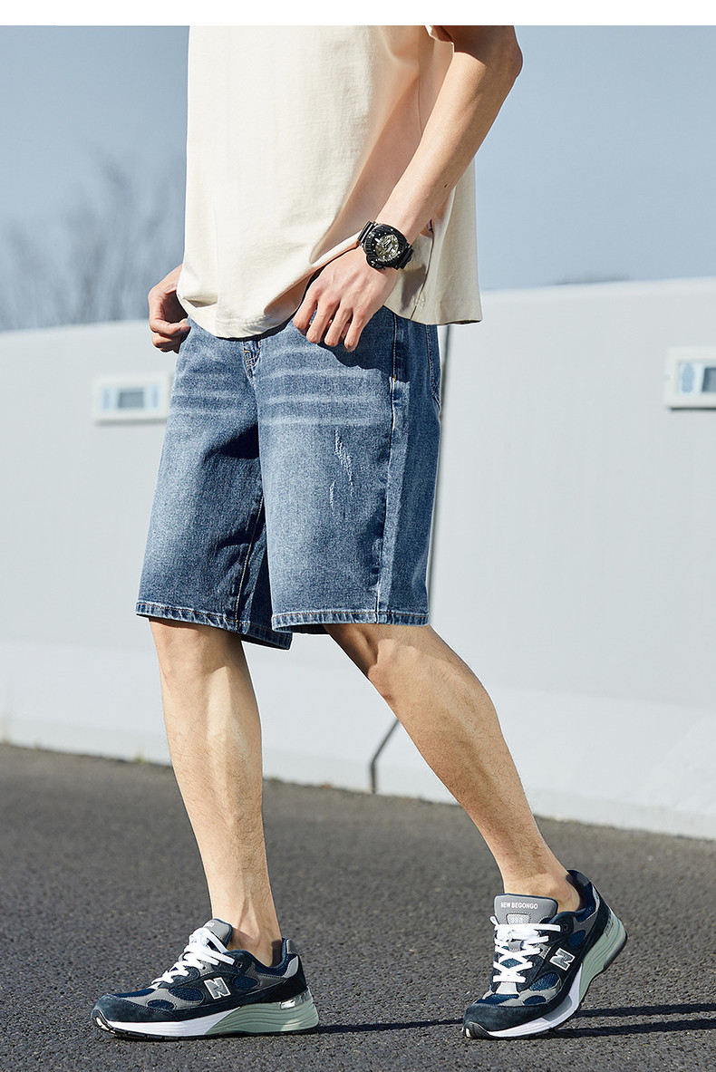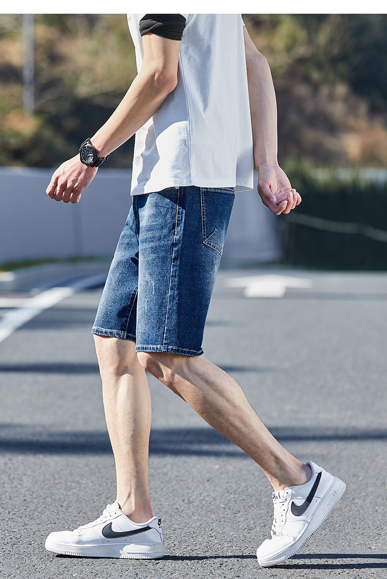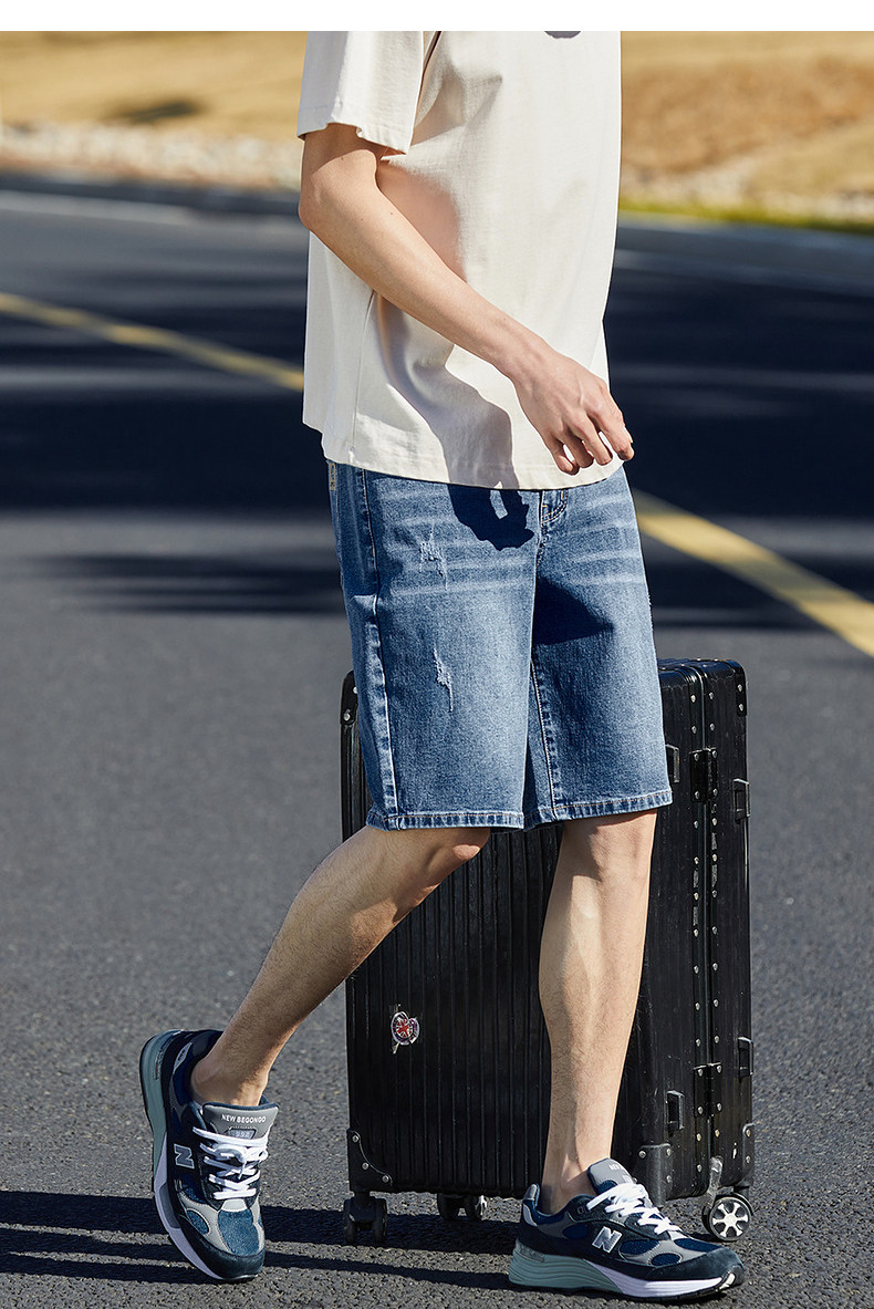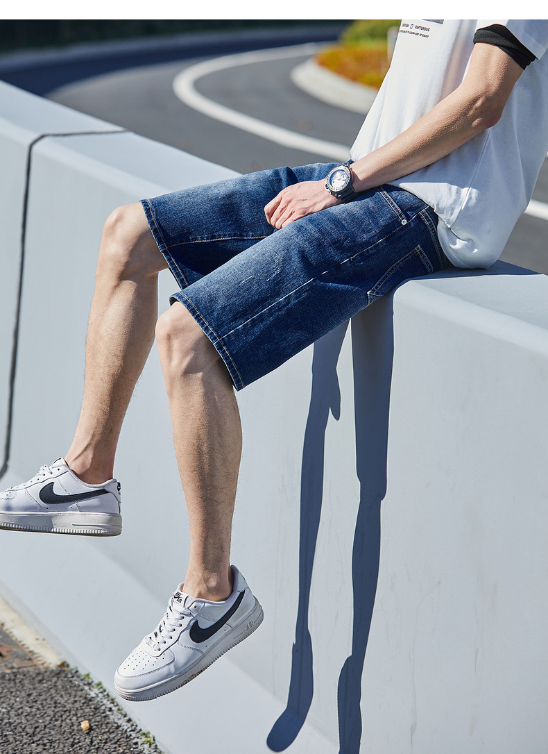 唐狮24夏季新款男牛仔中裤修身弹力潮流绣字直筒经典水洗五分短裤