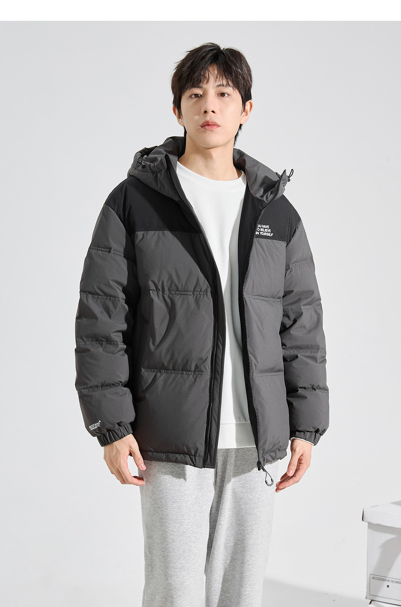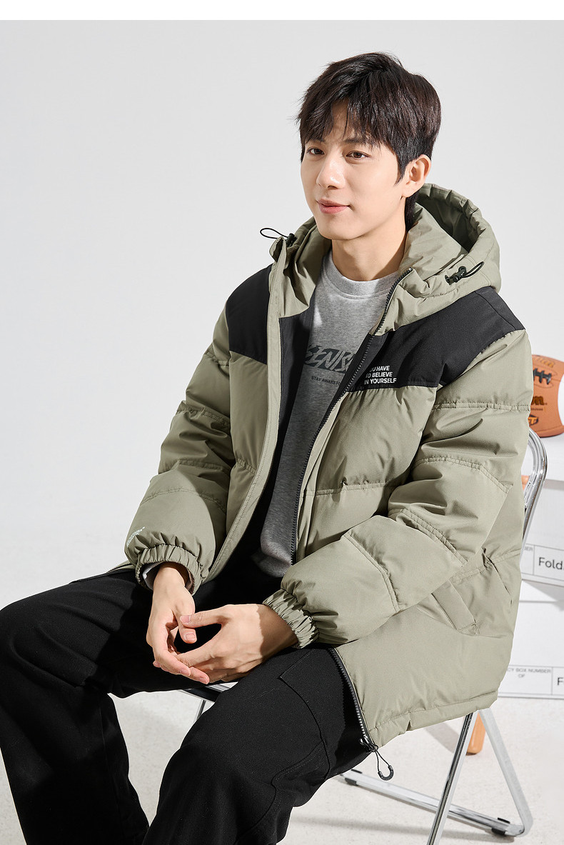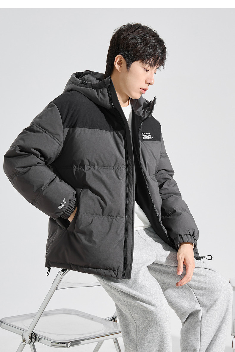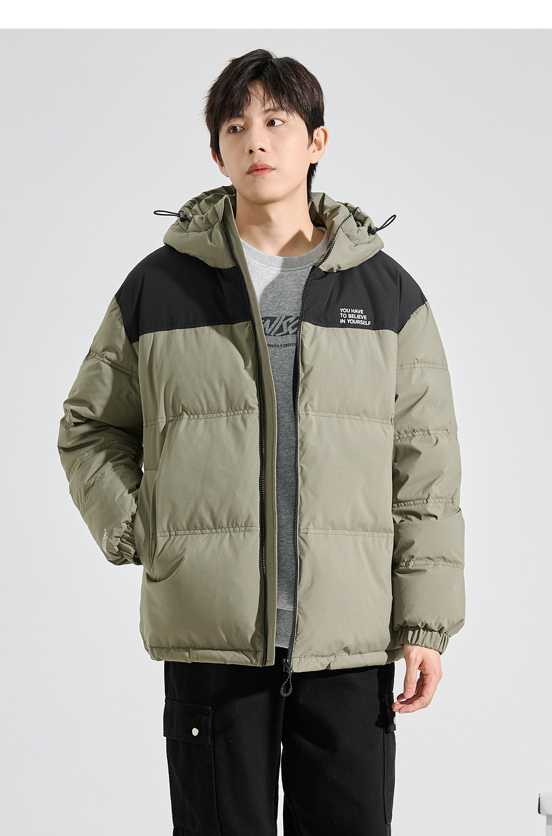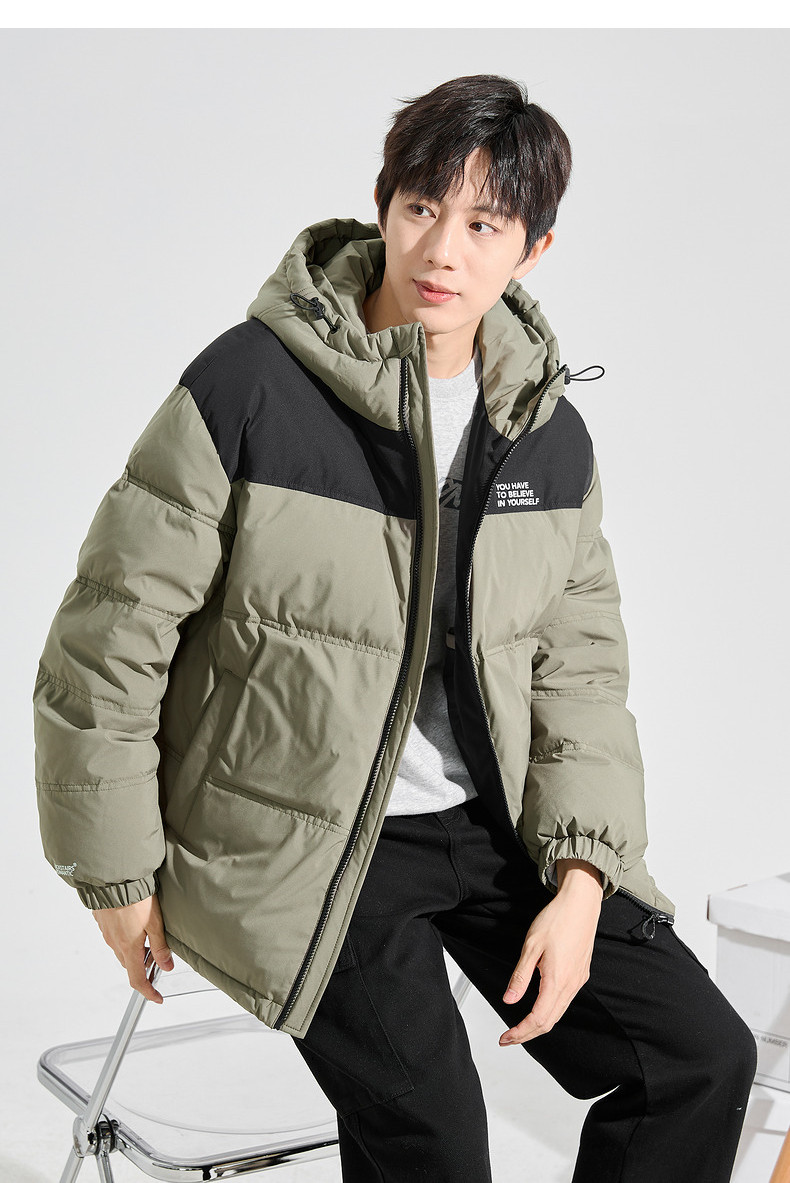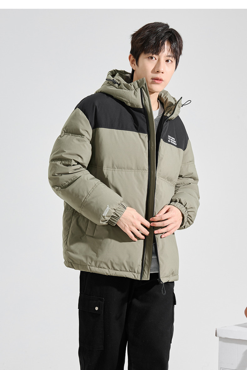 唐狮2024冬季新款男士羽绒服连帽撞色拼接短款面包服拉链款厚外套