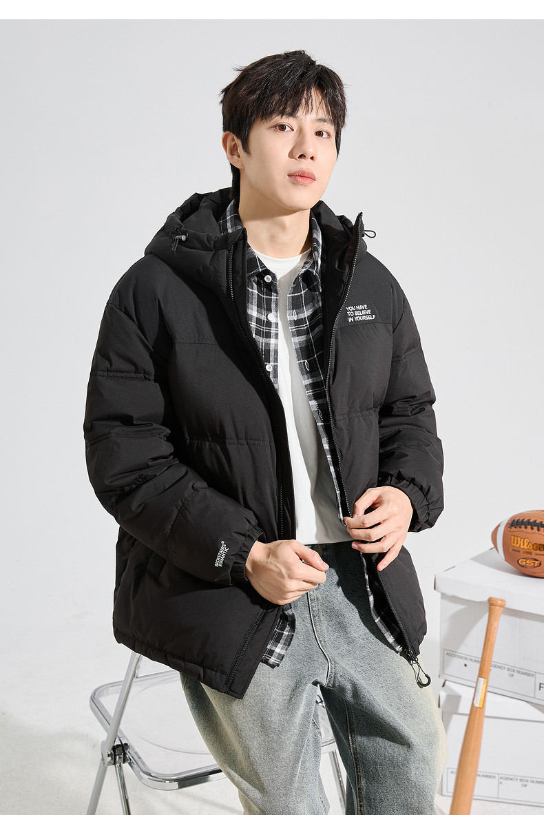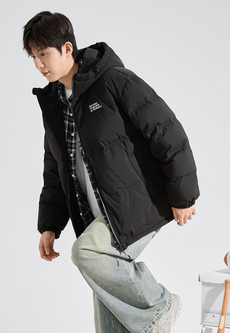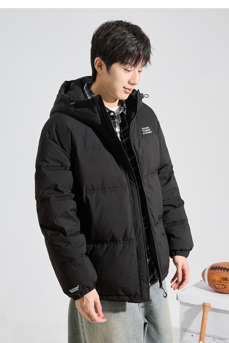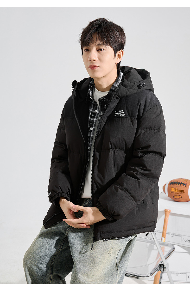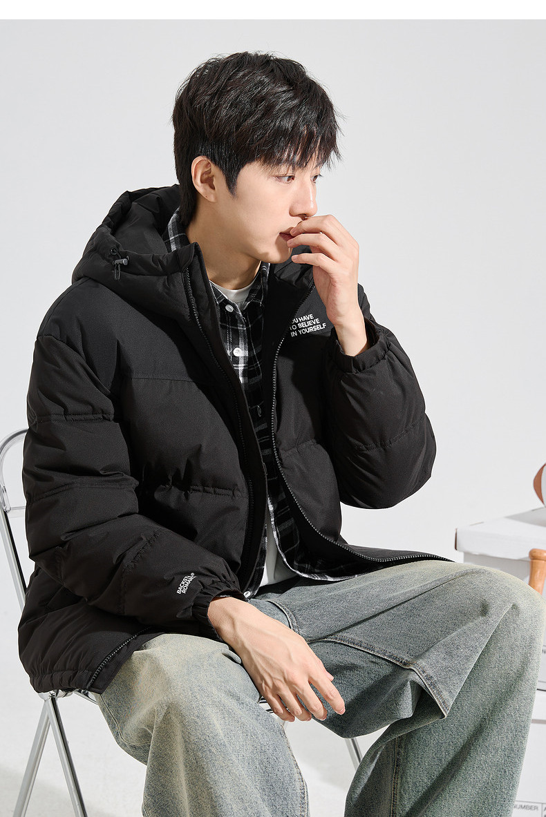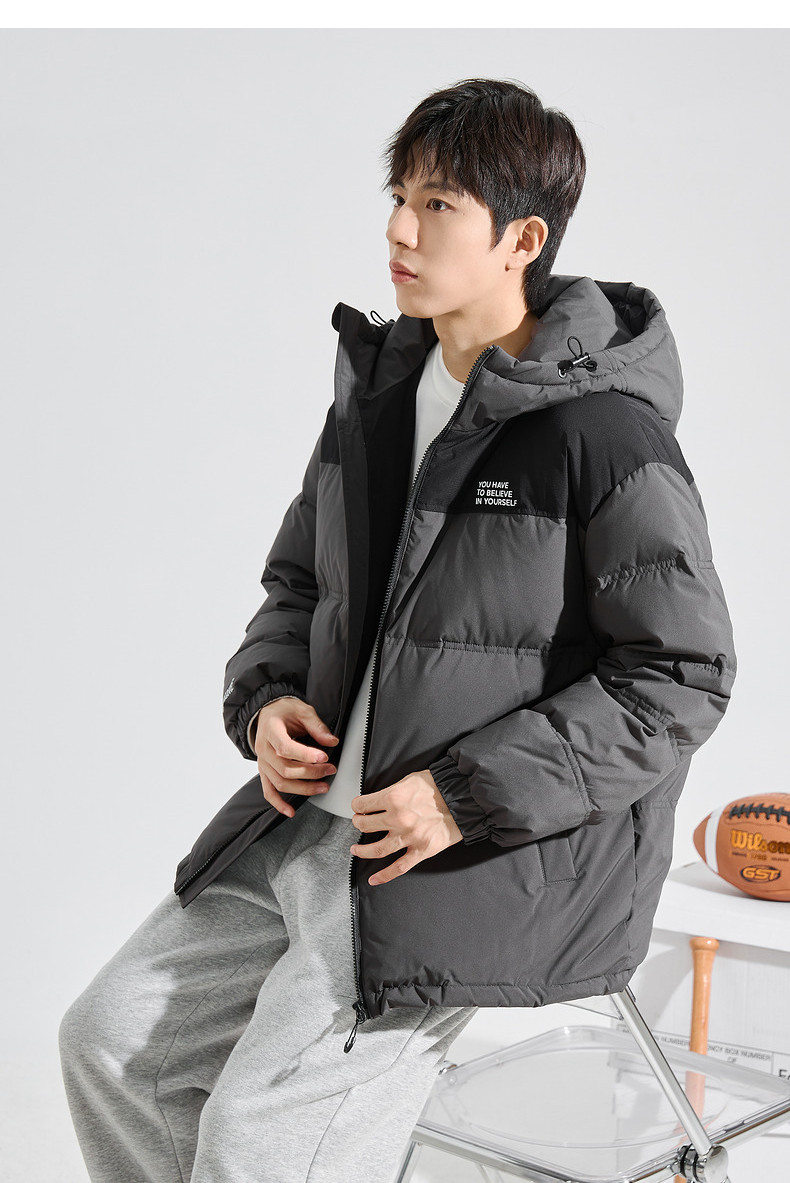 唐狮2024冬季新款男士羽绒服连帽撞色拼接短款面包服拉链款厚外套