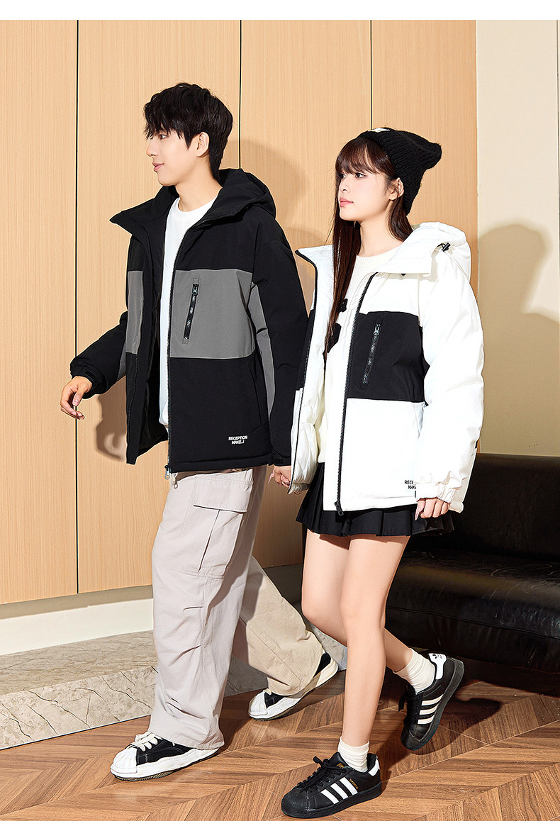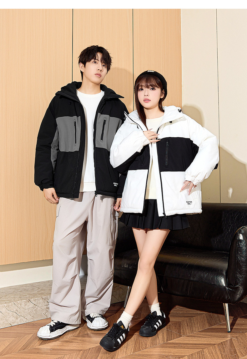 唐狮2024冬季新款情侣连帽印花潮流拼接宽松短款棉衣防水户外棉服