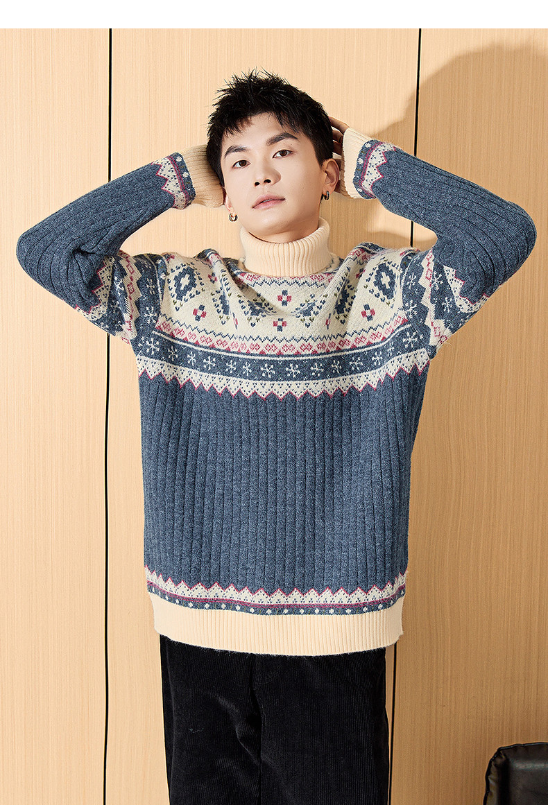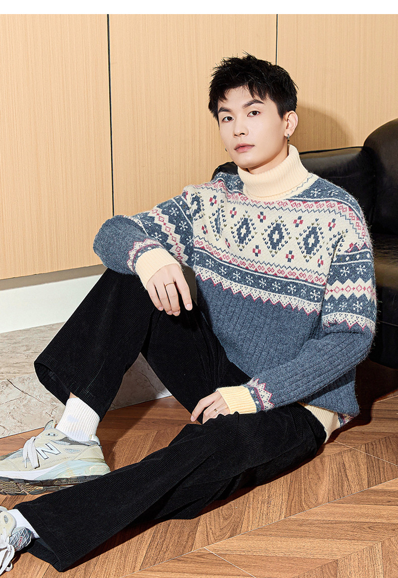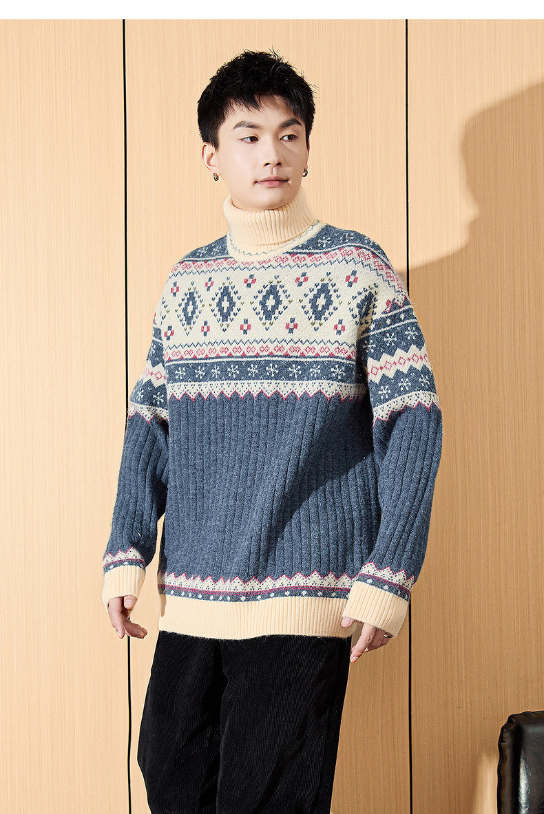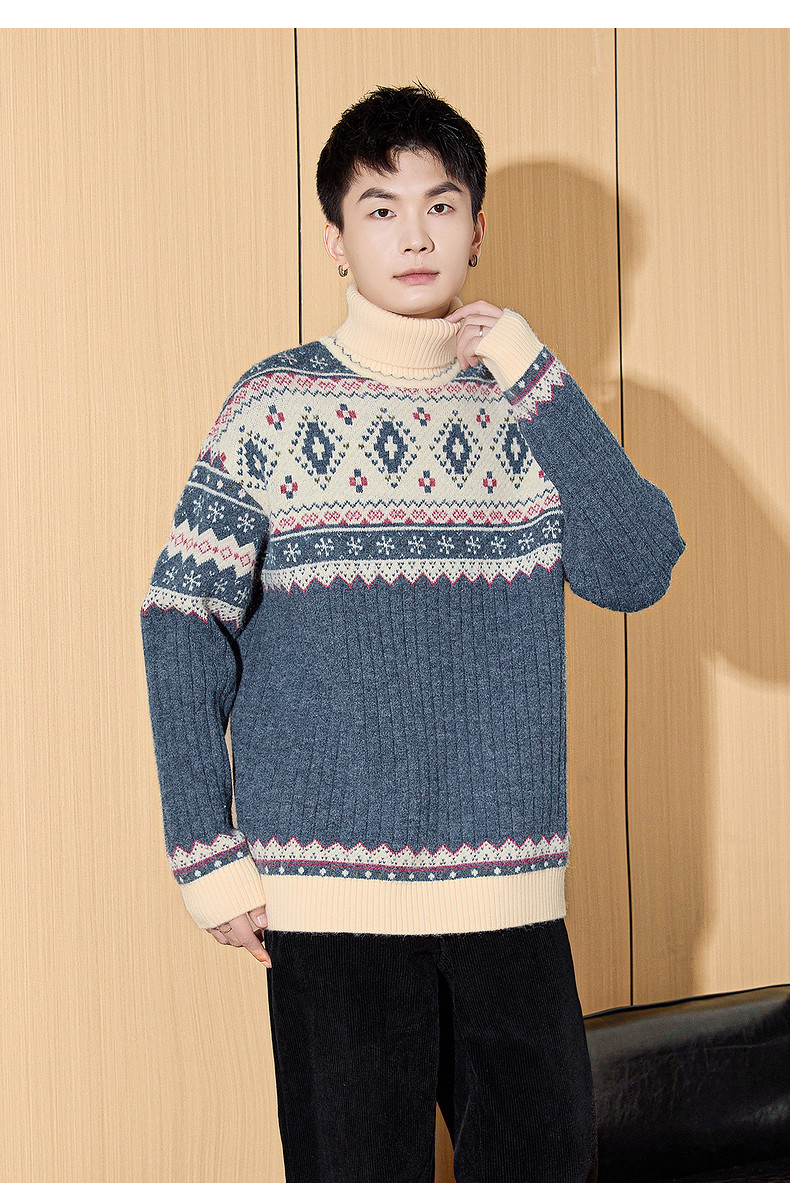 唐狮2024冬季新款高领男士毛衣复古费尔岛提花针织衫上衣男装毛衫