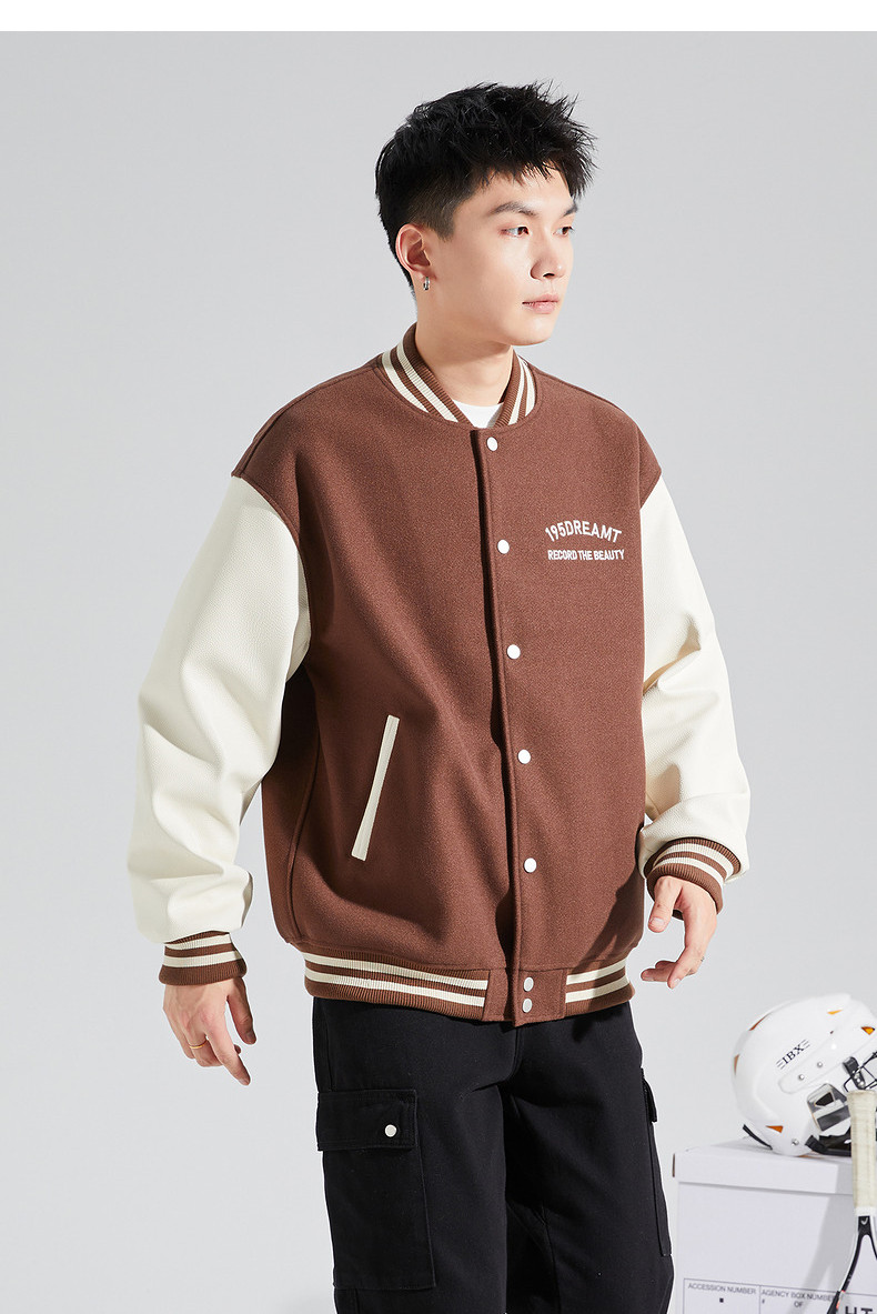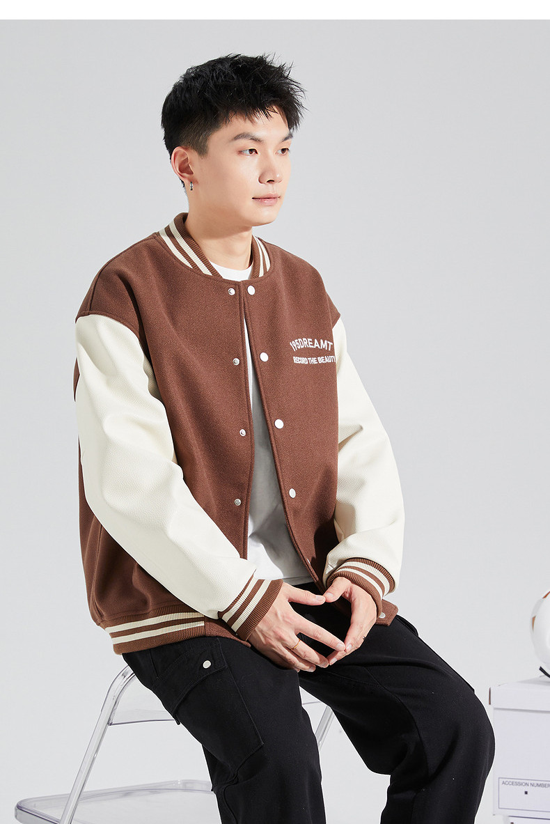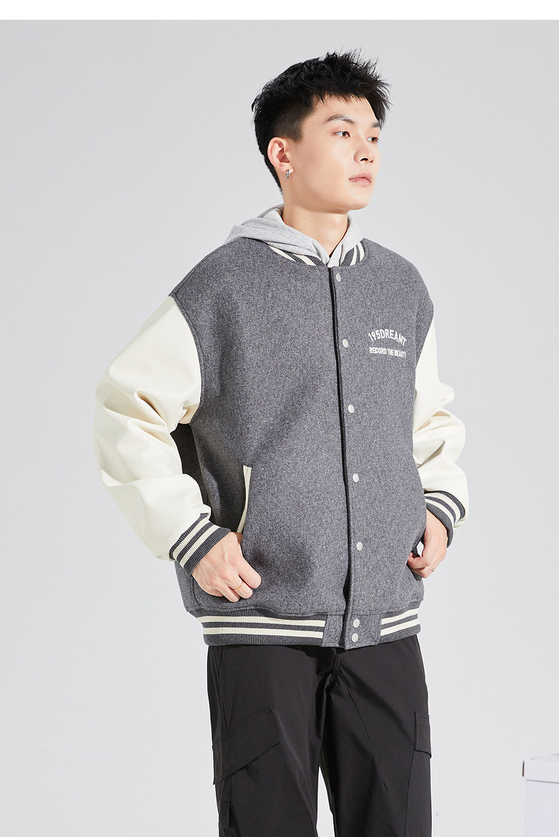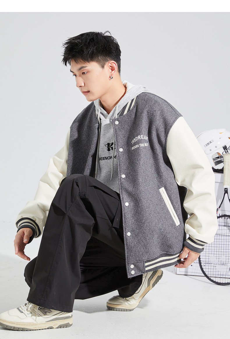 唐狮2024秋冬新款棒球服男拼接美式棒球领呢拼PU皮短款外套男夹克