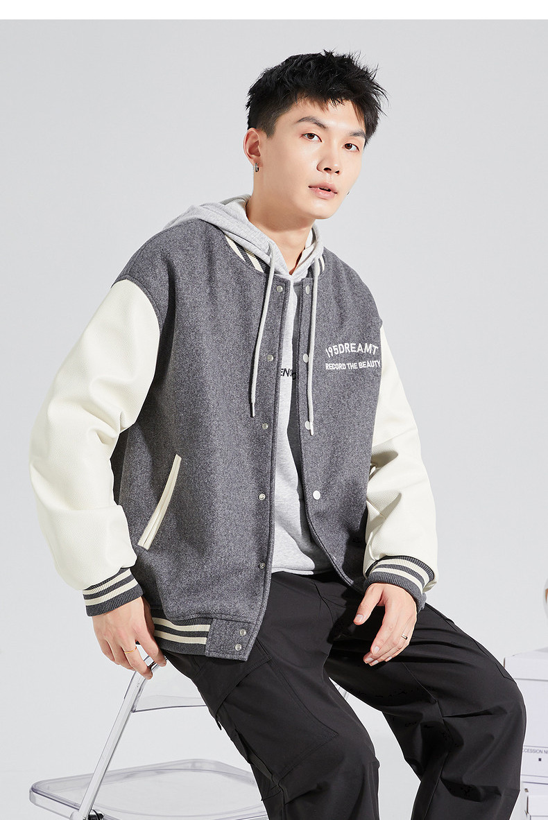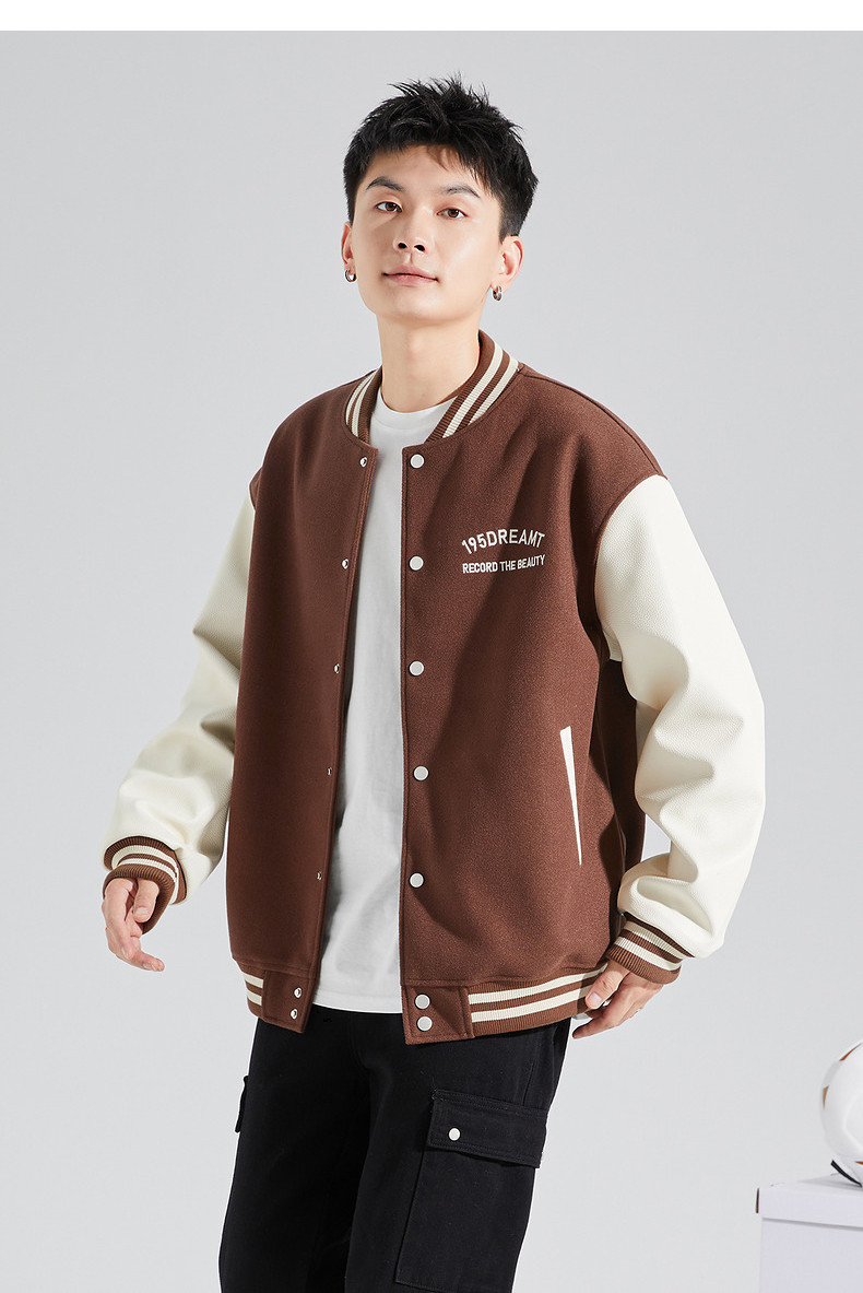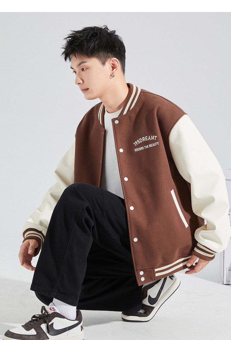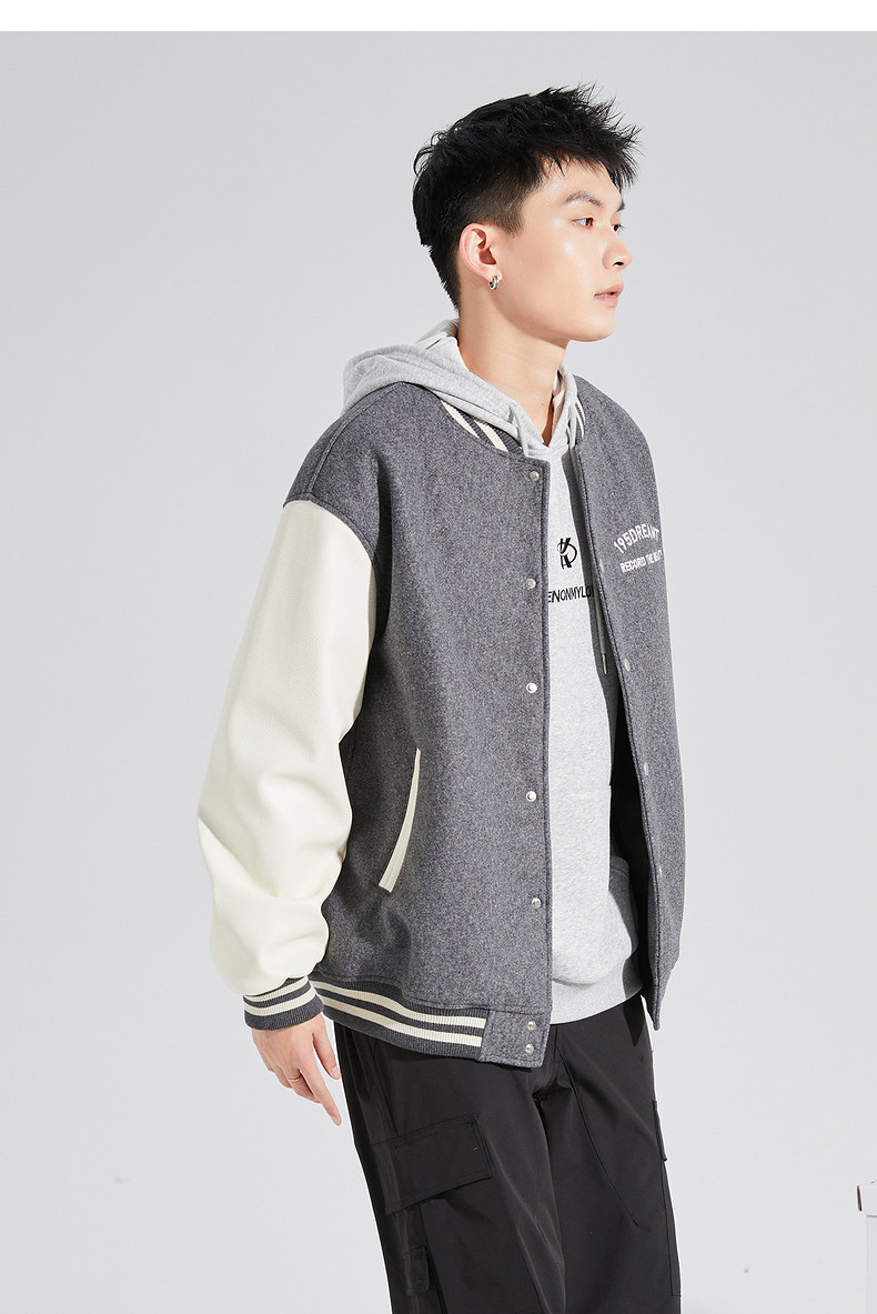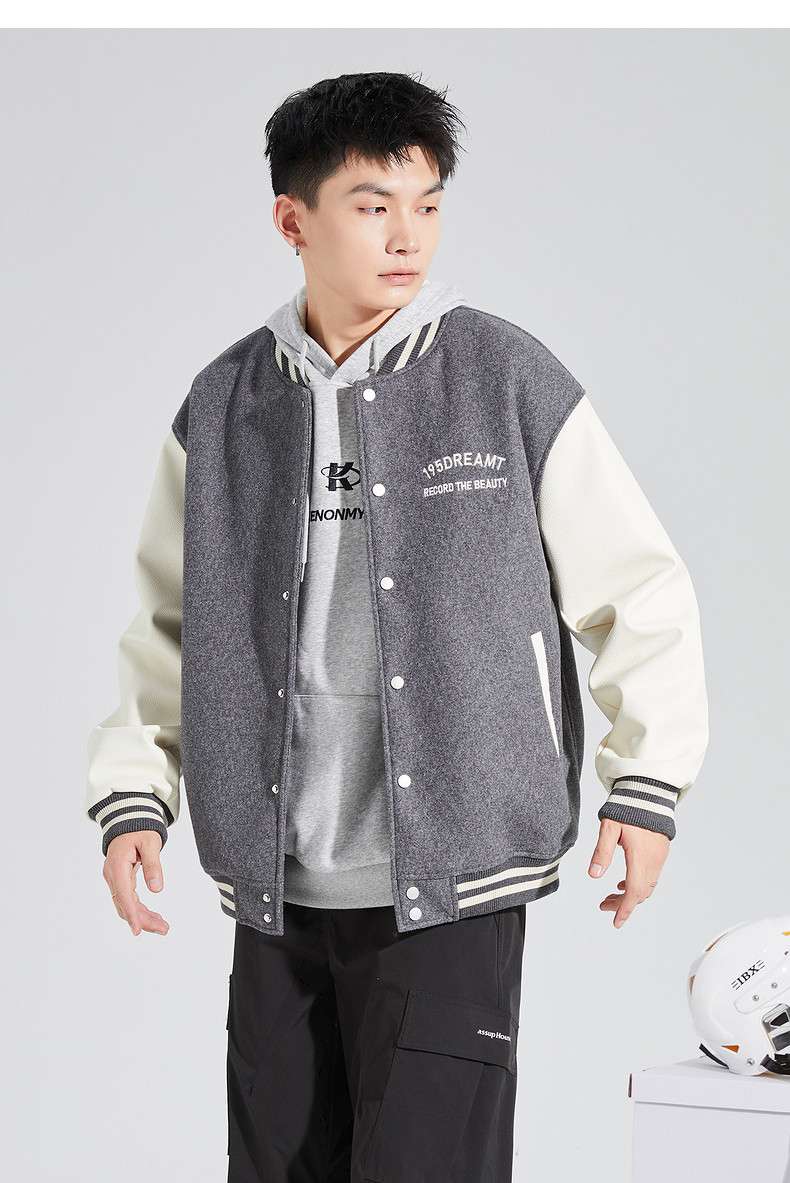 唐狮2024秋冬新款棒球服男拼接美式棒球领呢拼PU皮短款外套男夹克
