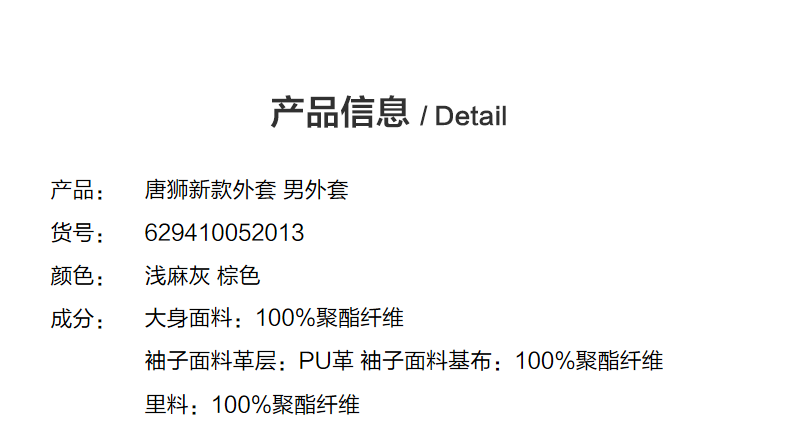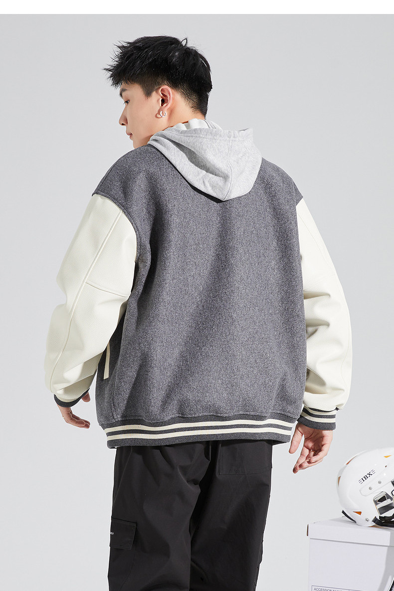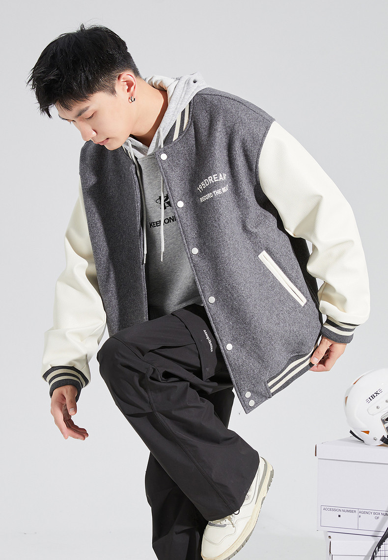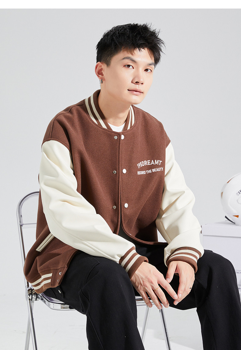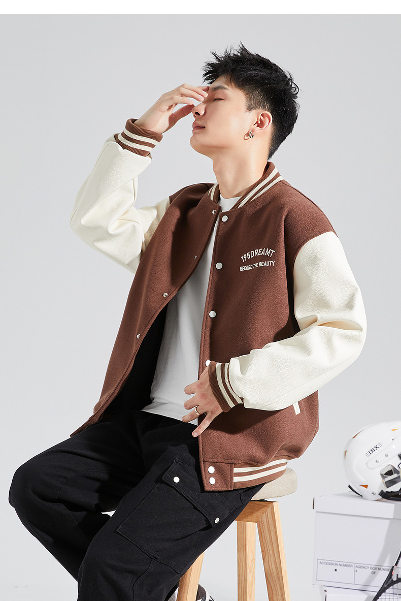 唐狮2024秋冬新款棒球服男拼接美式棒球领呢拼PU皮短款外套男夹克