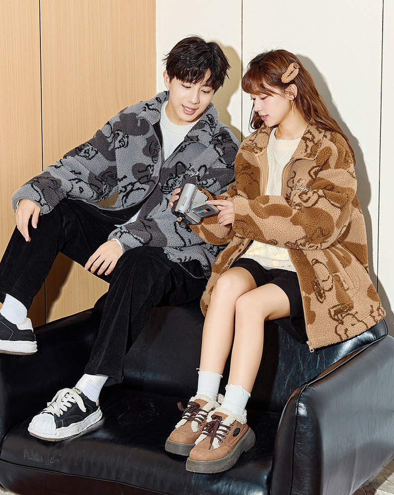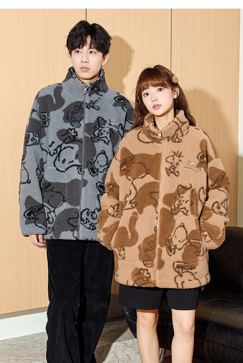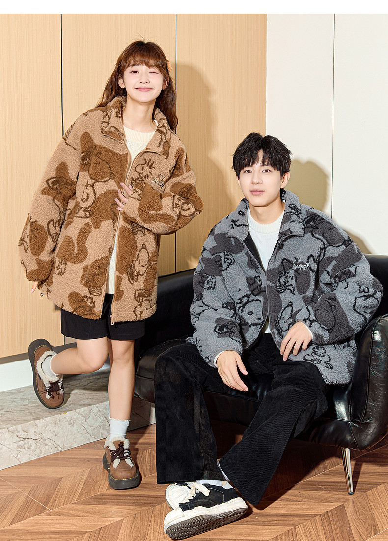 [史努比联名]唐狮2024冬季新款情侣仿羊羔毛外套迷彩满印保暖夹克