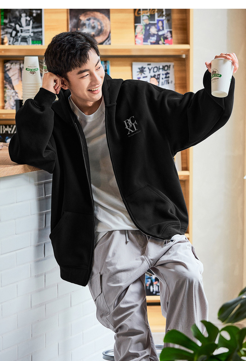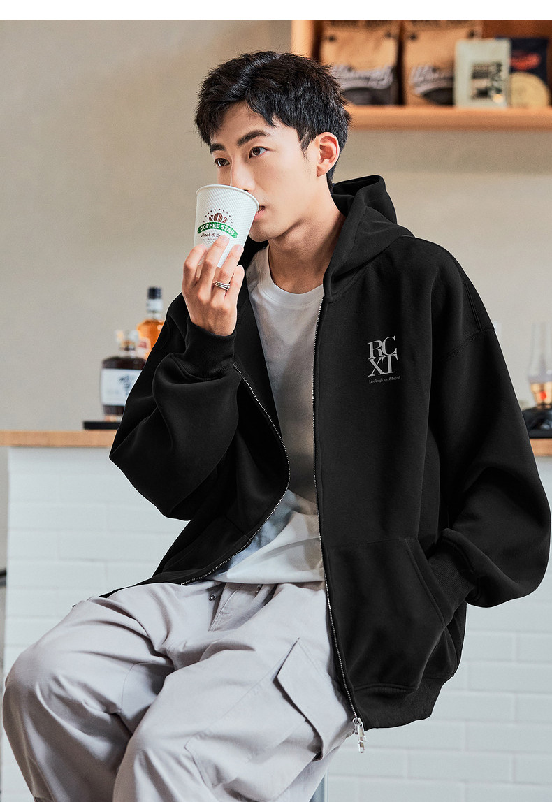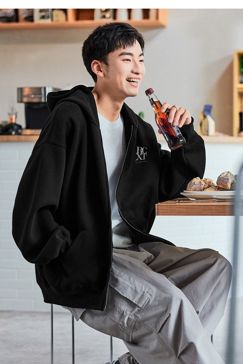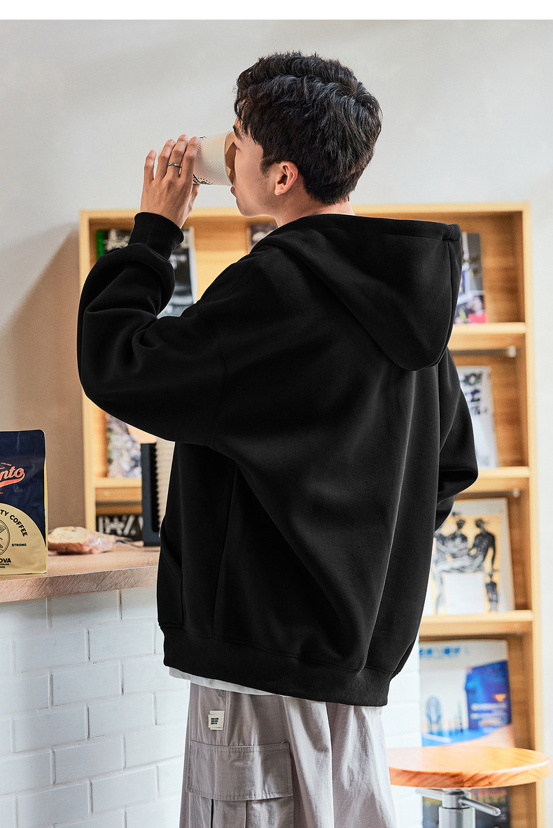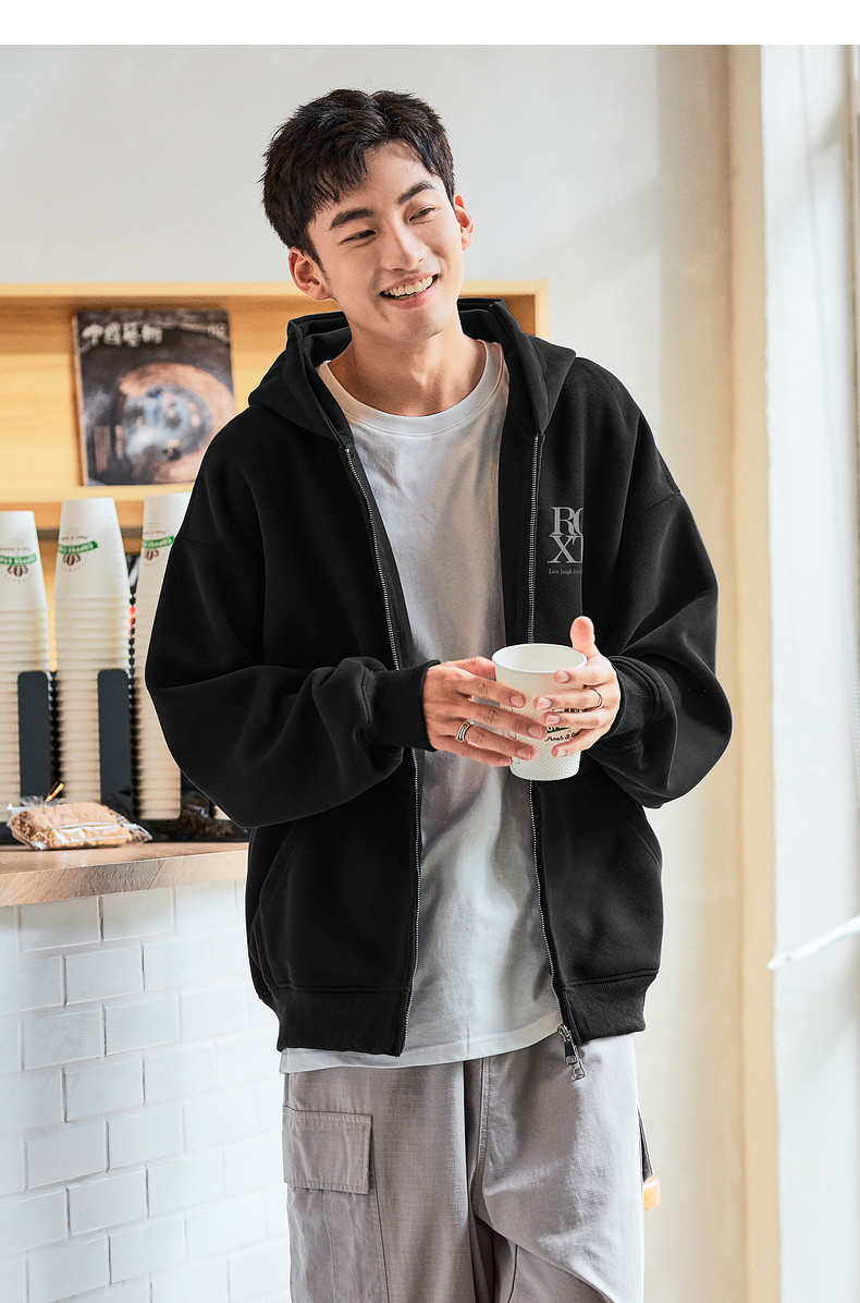 唐狮2024春秋季新款连帽开衫卫衣男士美式日常休闲黑色上衣外套潮