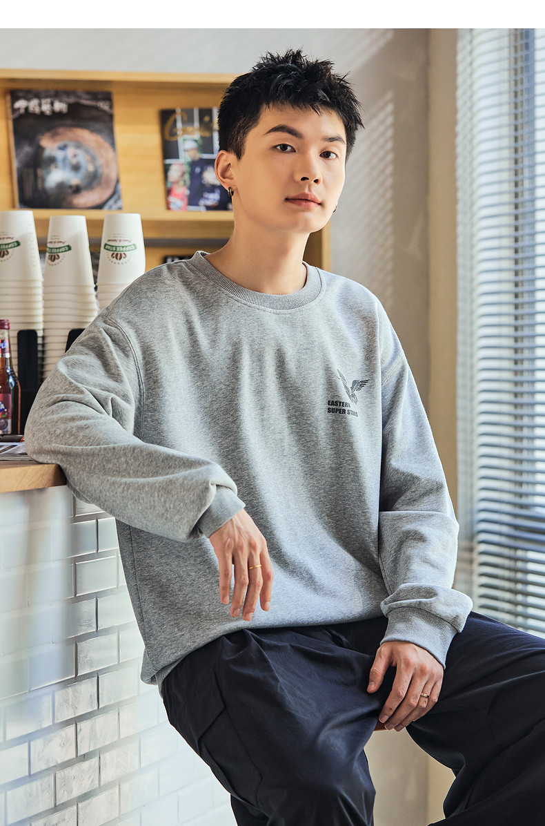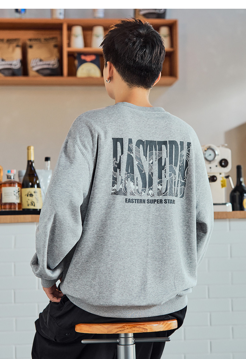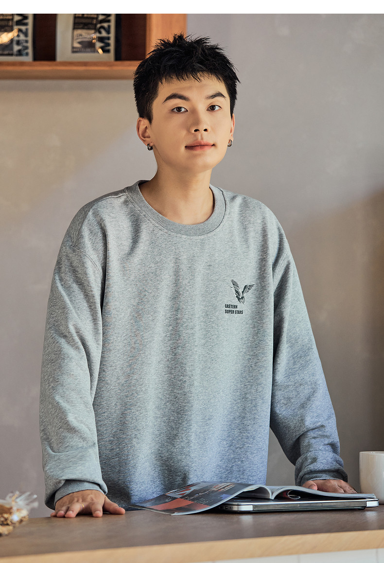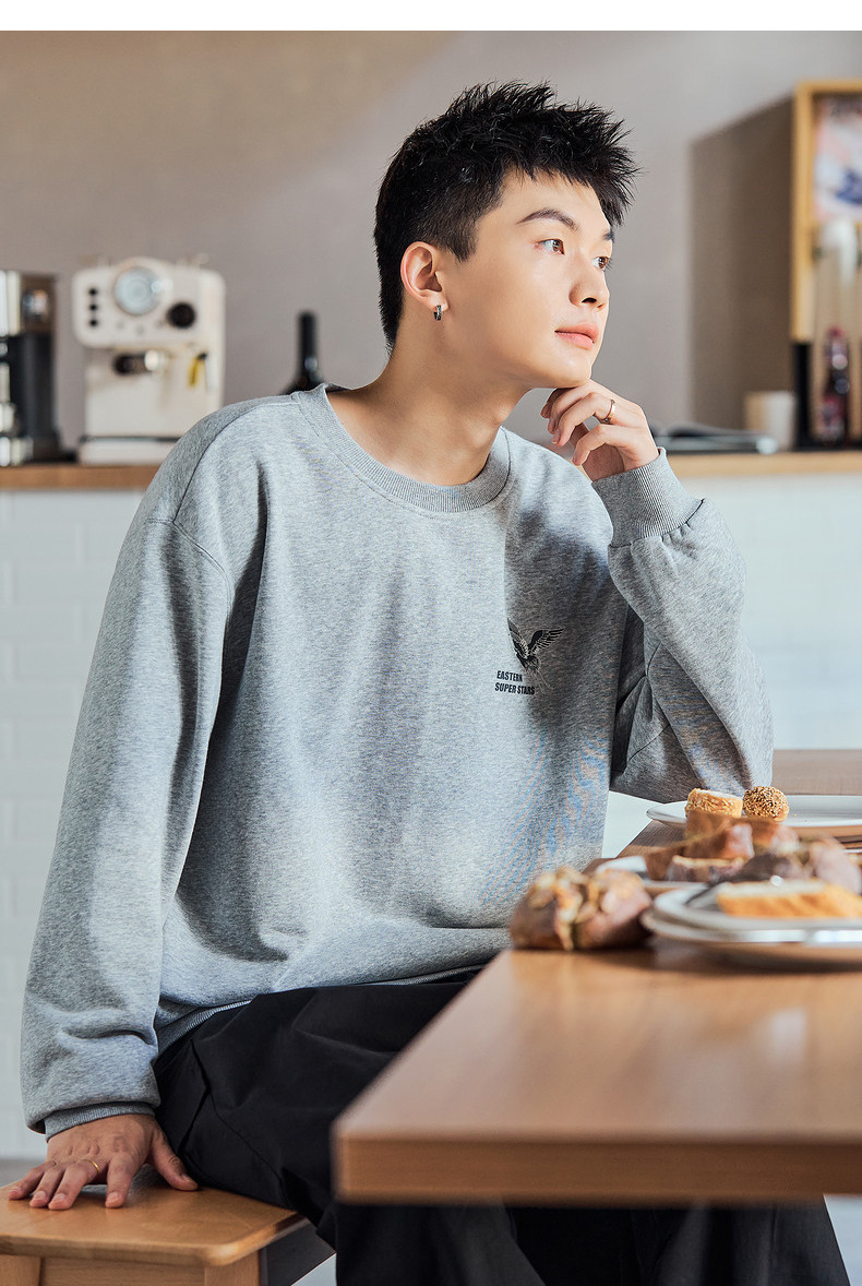 唐狮2024春秋季新款圆领卫衣男士休闲灰色无帽衫痞帅长袖上衣潮牌