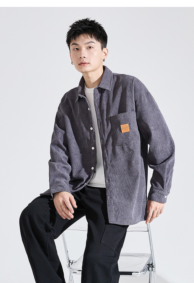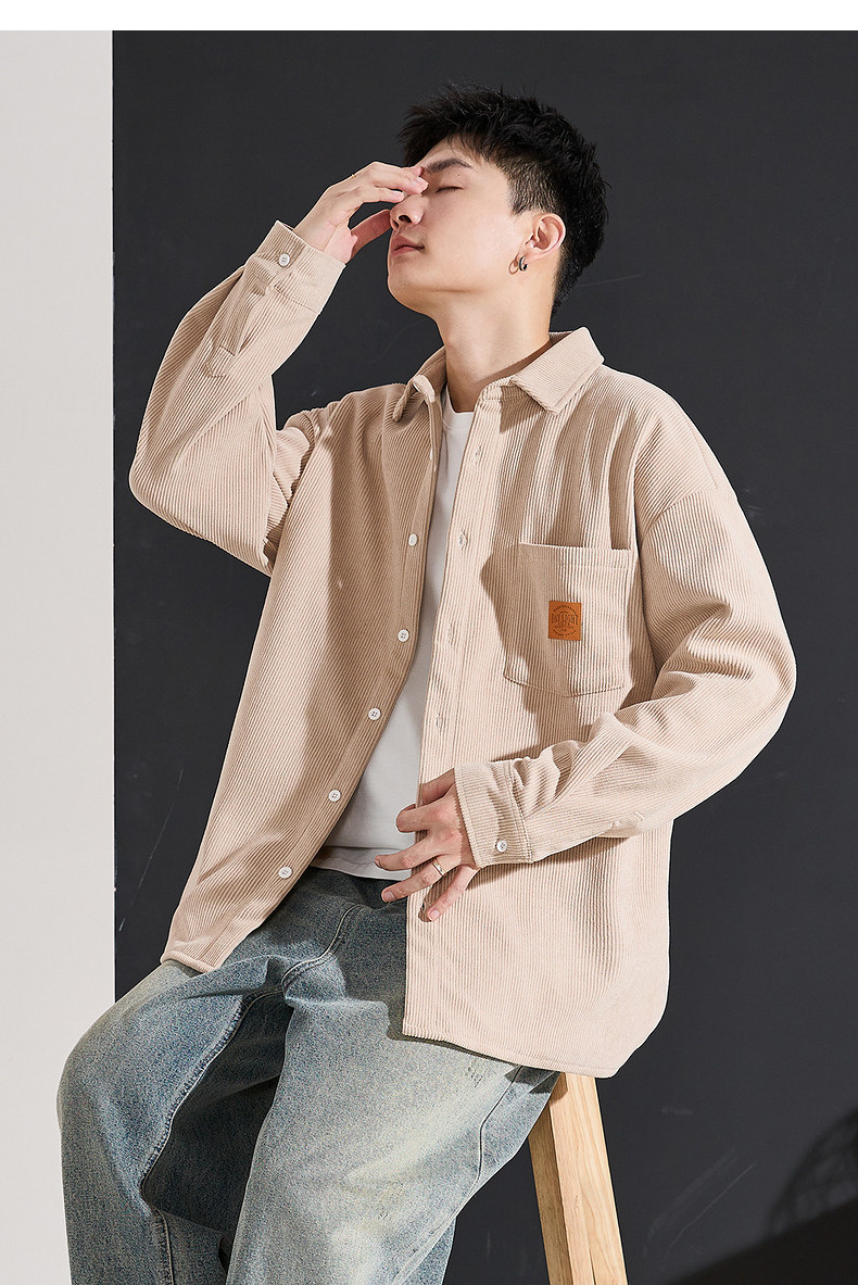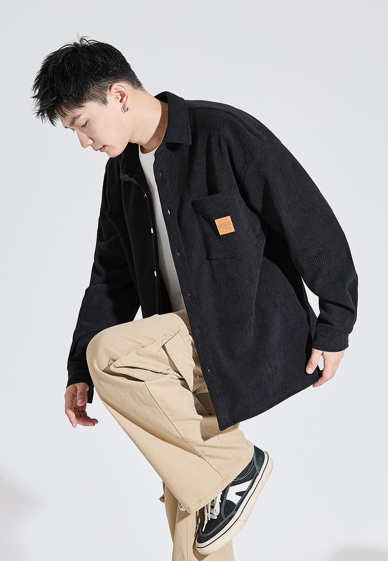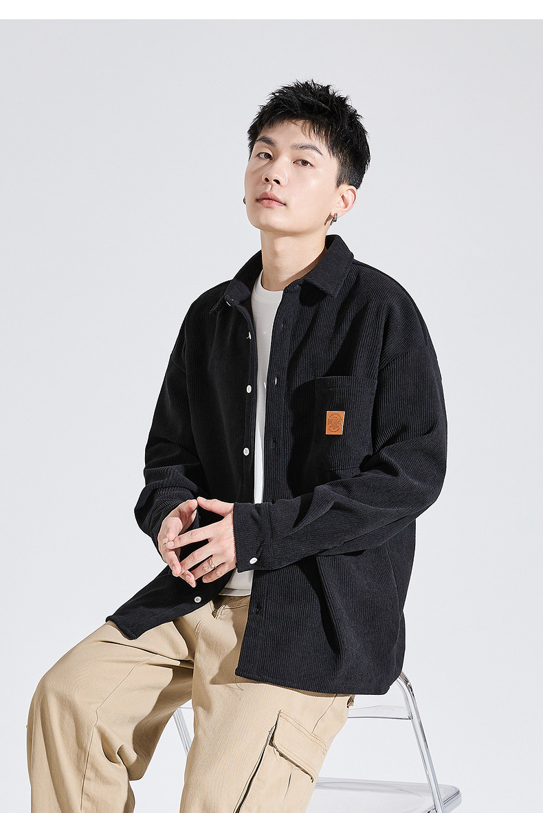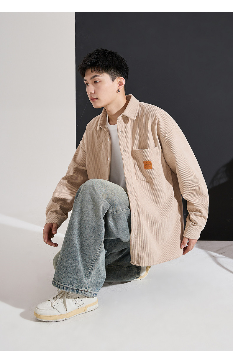 唐狮2024秋季新款男翻领前胸单口袋皮标长袖衬衫宽松日常休闲外套