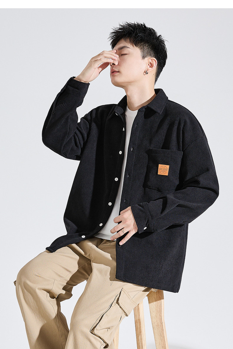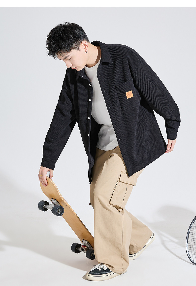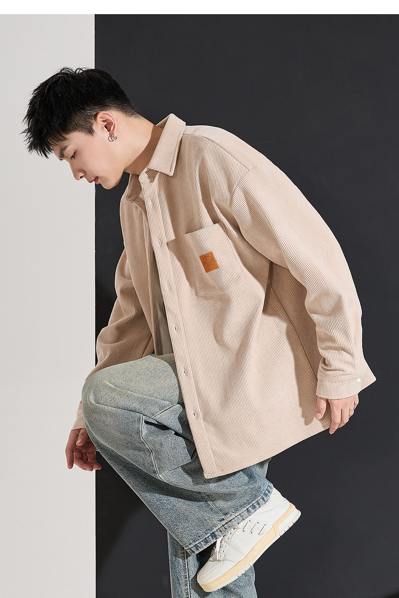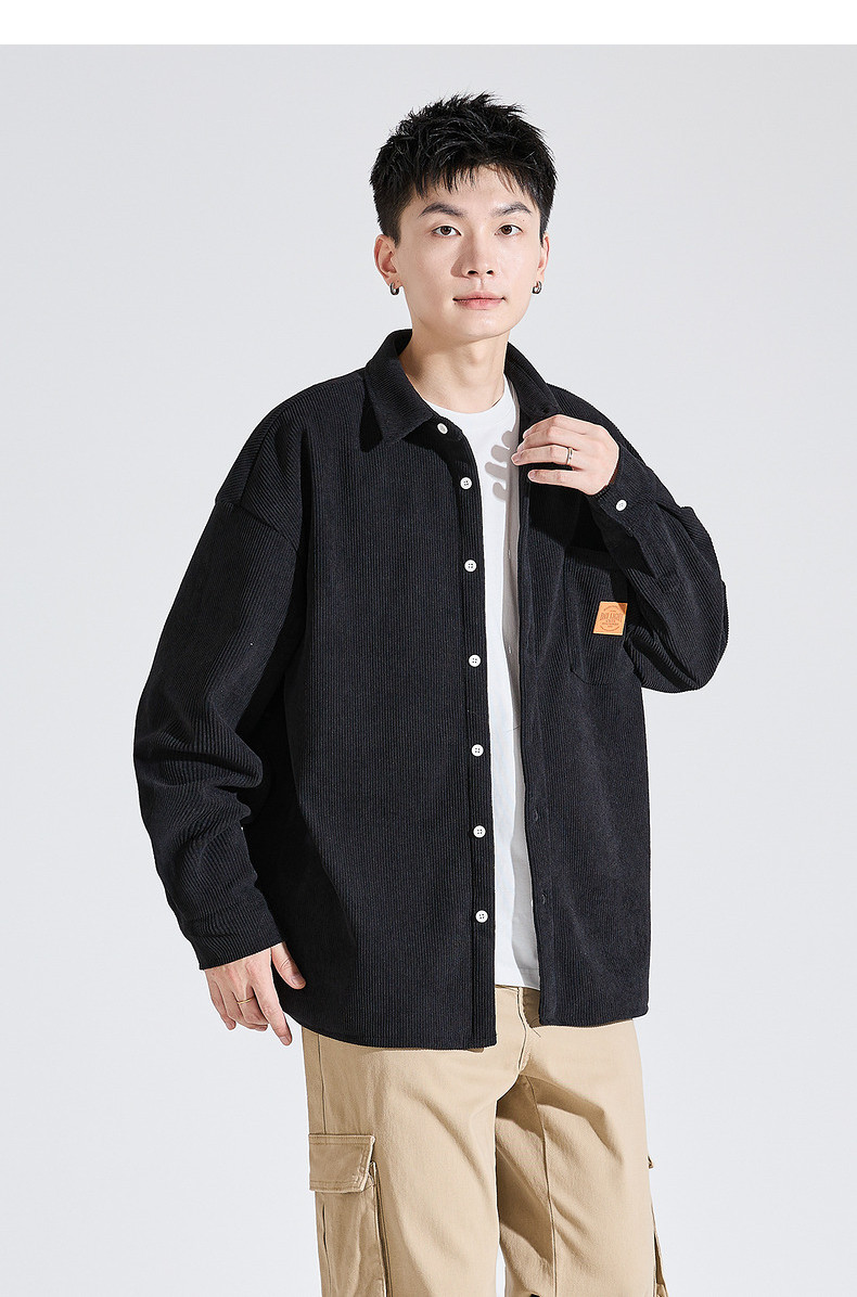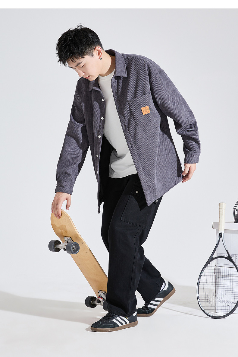 唐狮2024秋季新款男翻领前胸单口袋皮标长袖衬衫宽松日常休闲外套