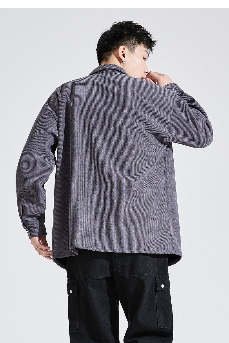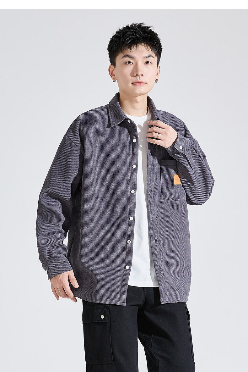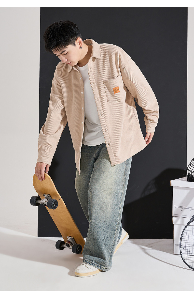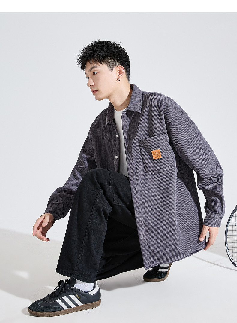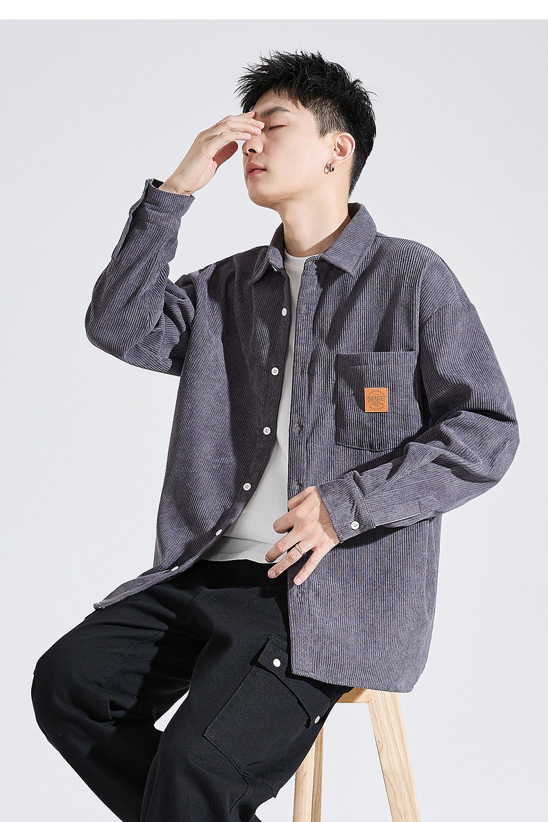 唐狮2024秋季新款男翻领前胸单口袋皮标长袖衬衫宽松日常休闲外套
