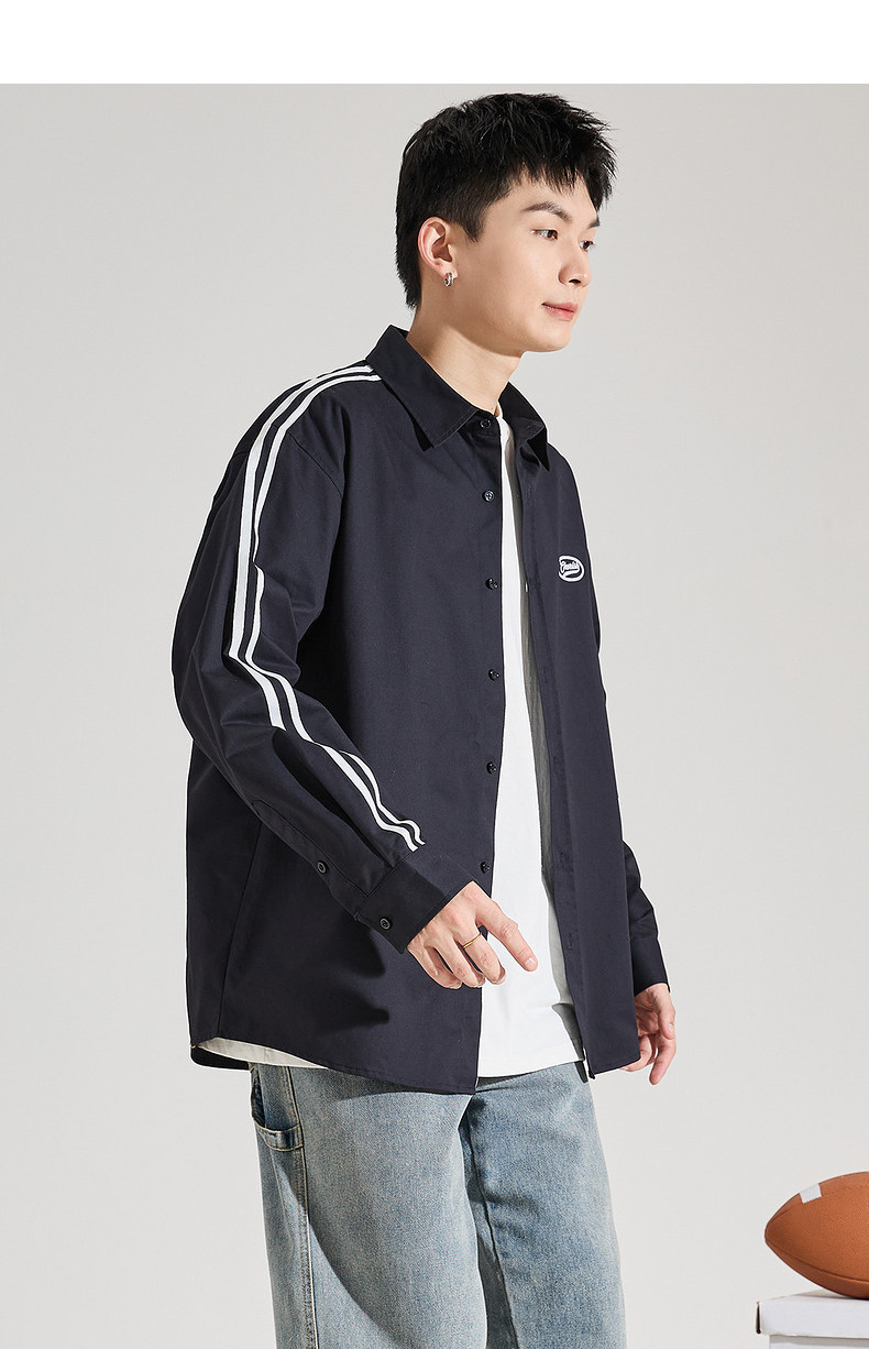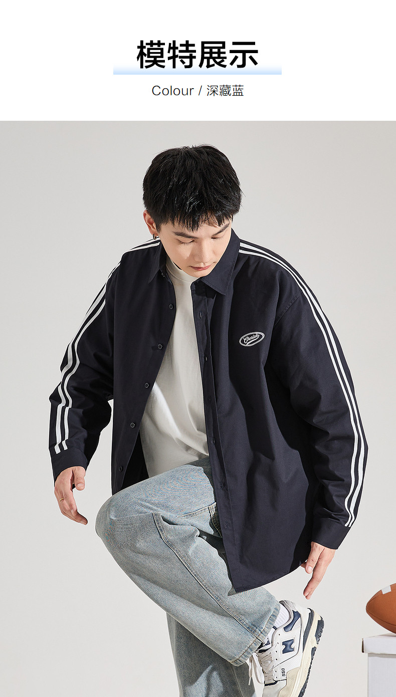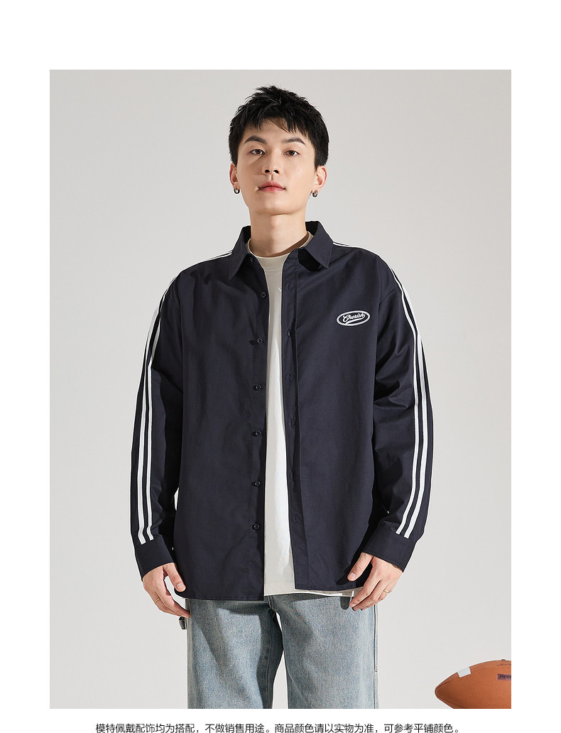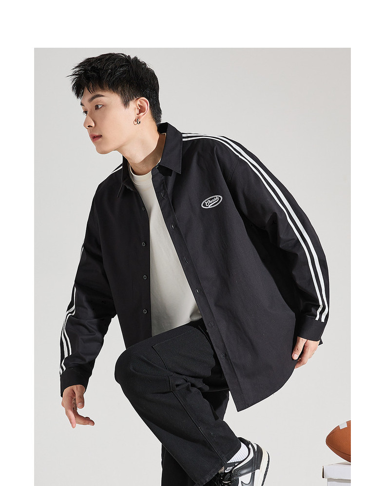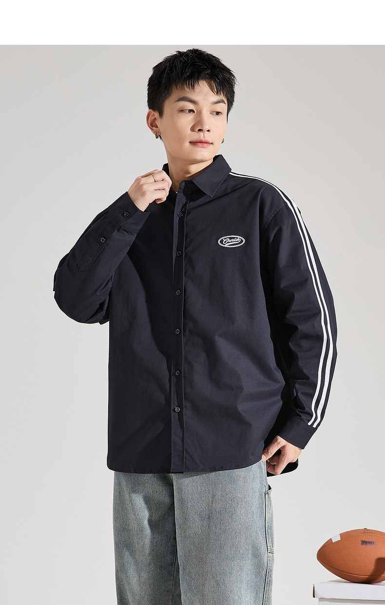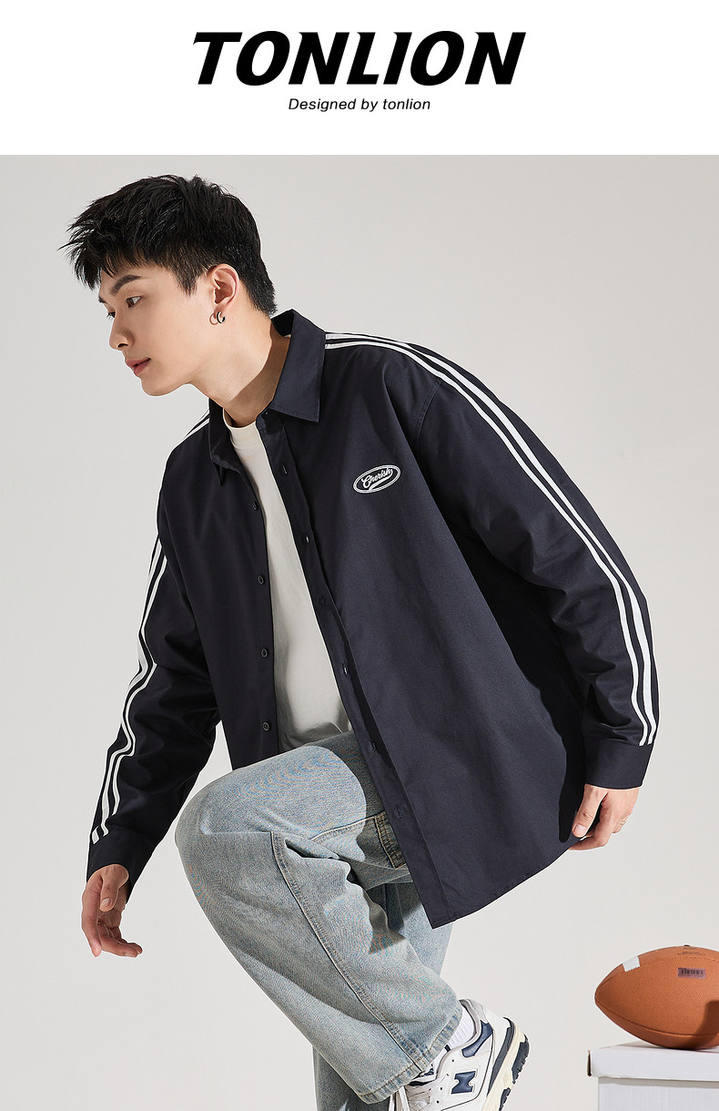 唐狮2024秋新款男翻领三条杠文字绣花长袖运动宽松休闲百搭衬衫男