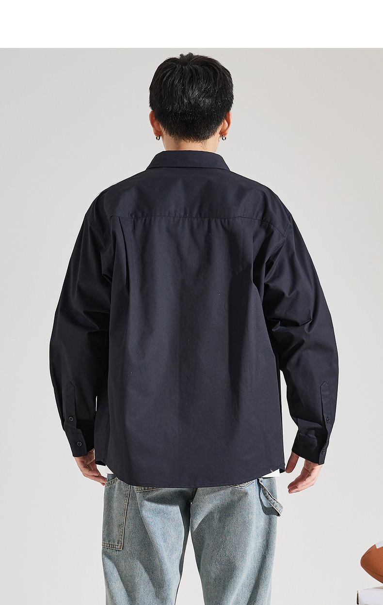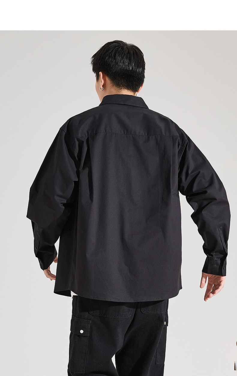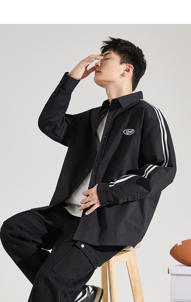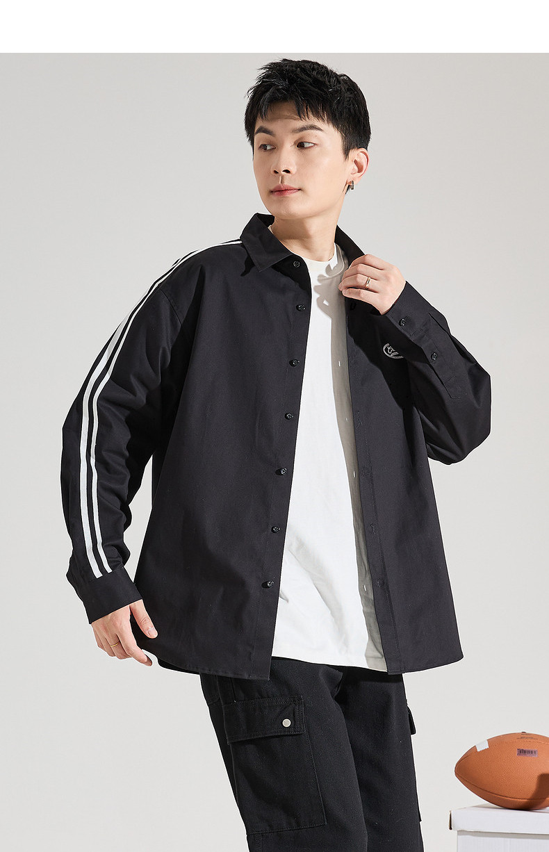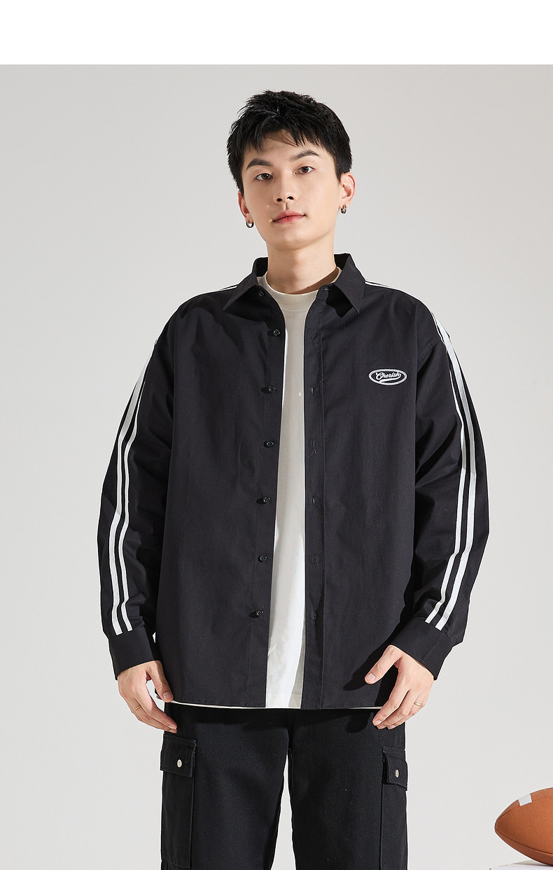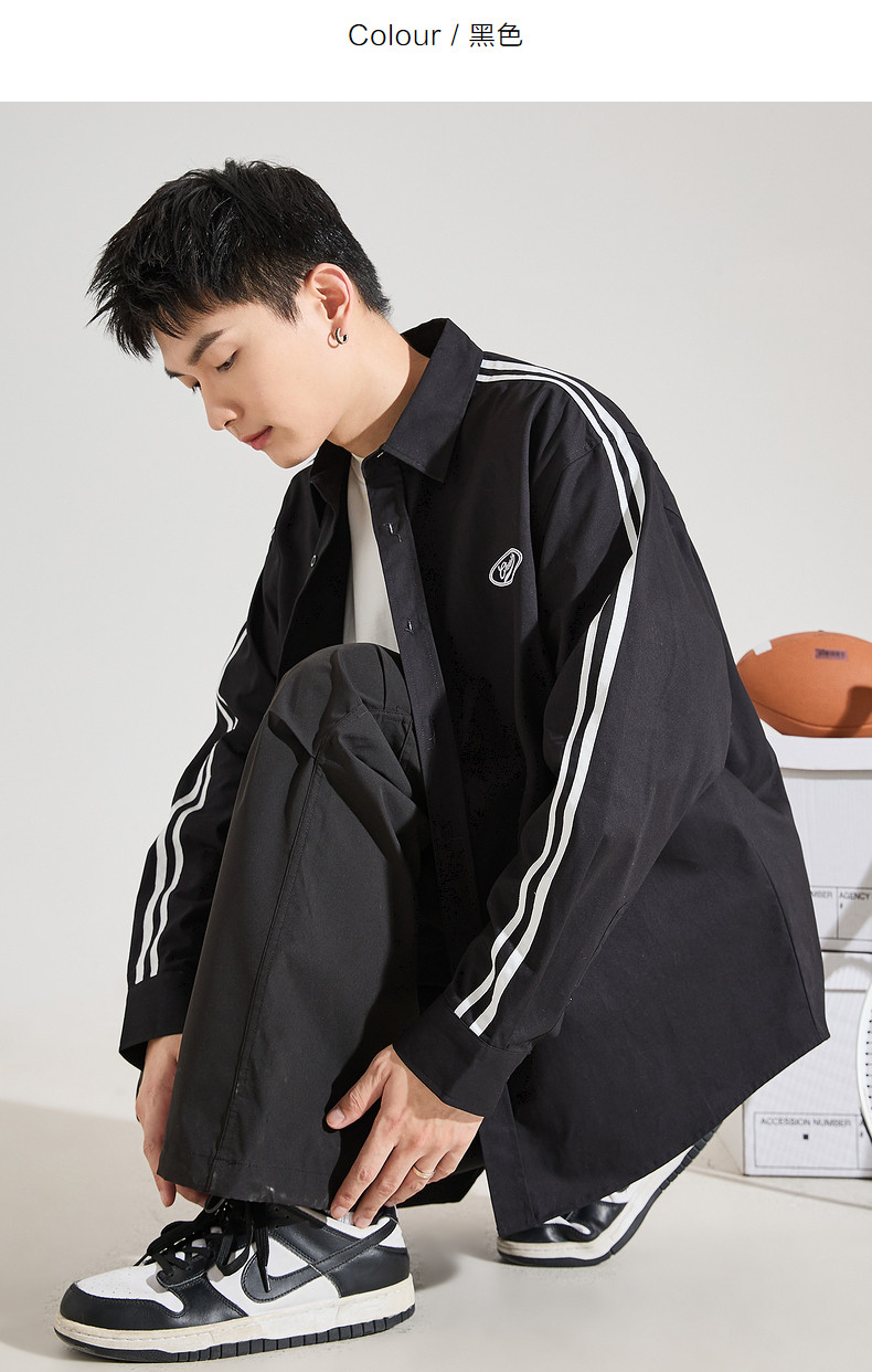 唐狮2024秋新款男翻领三条杠文字绣花长袖运动宽松休闲百搭衬衫男