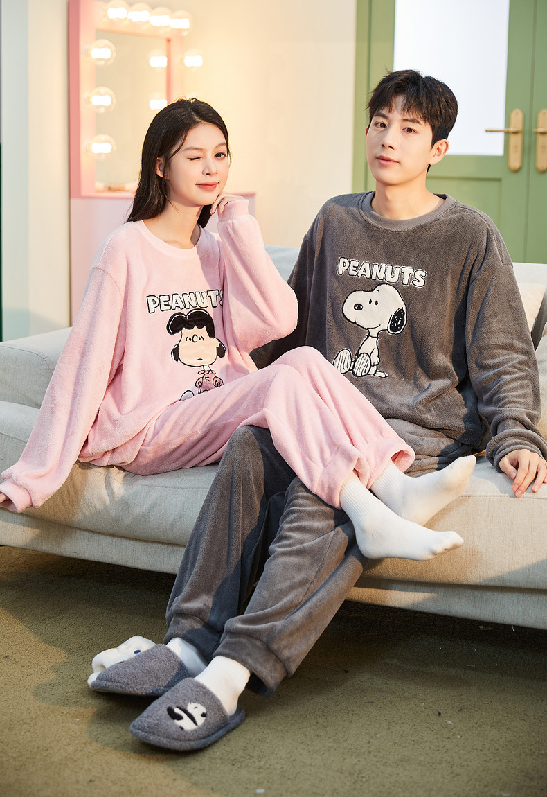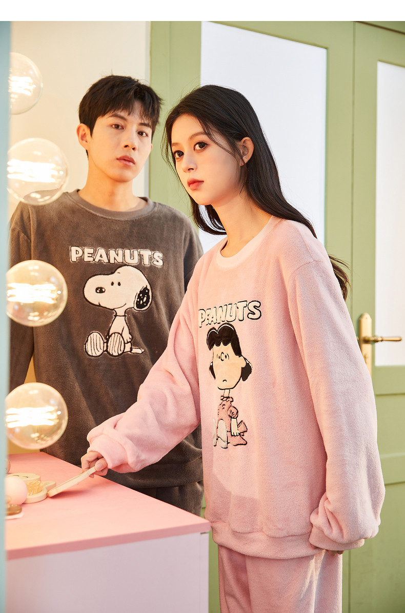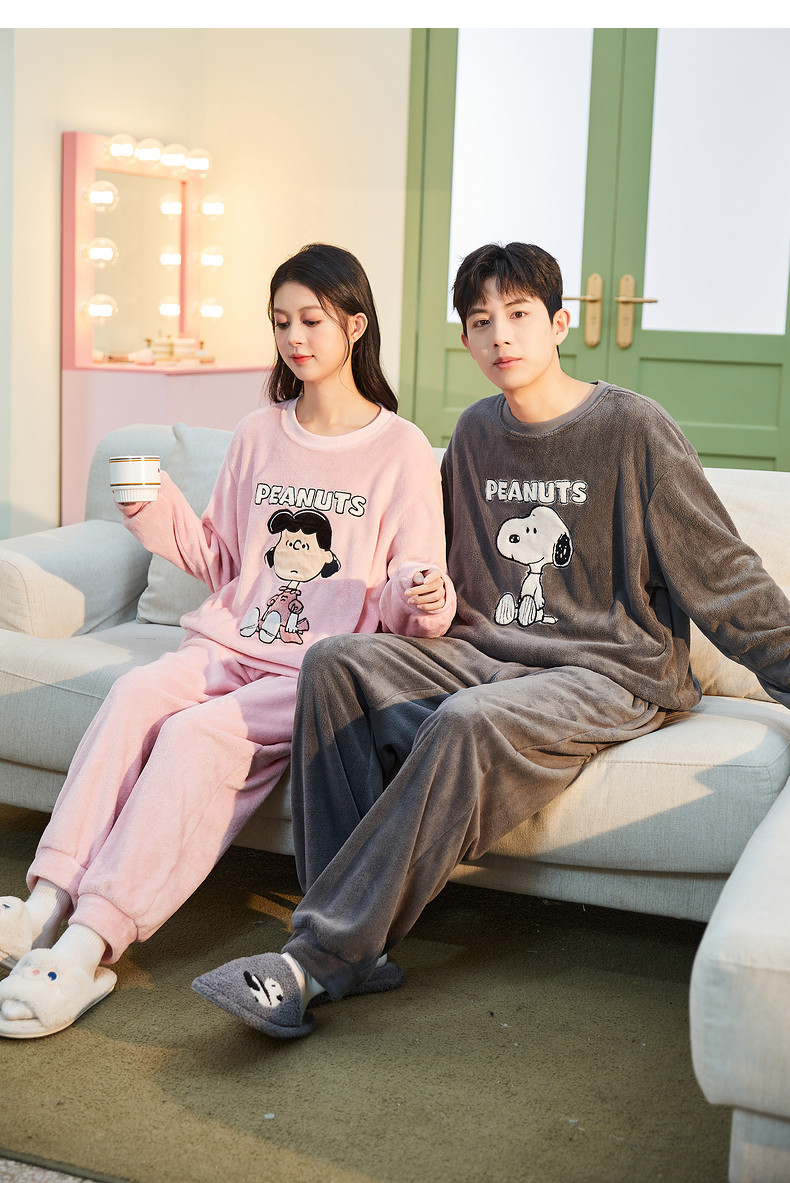 唐狮史努比情侣睡衣女冬季加厚珊瑚绒可外穿家居服大码男保暖套装