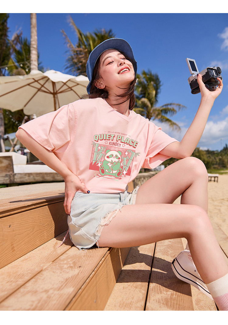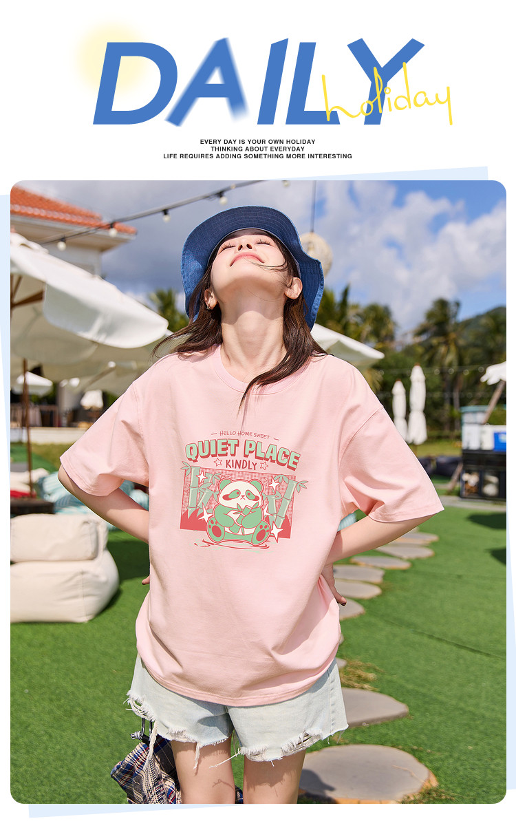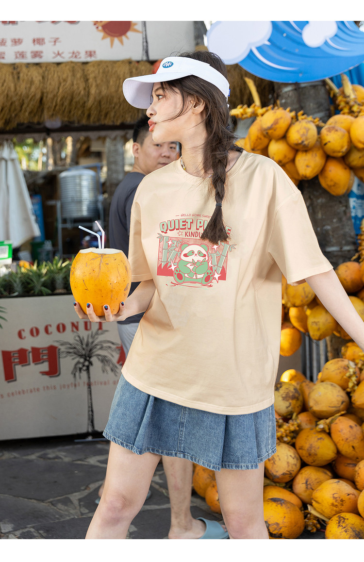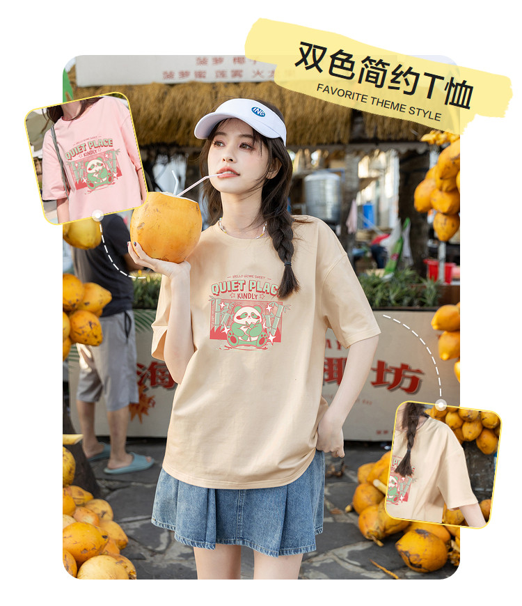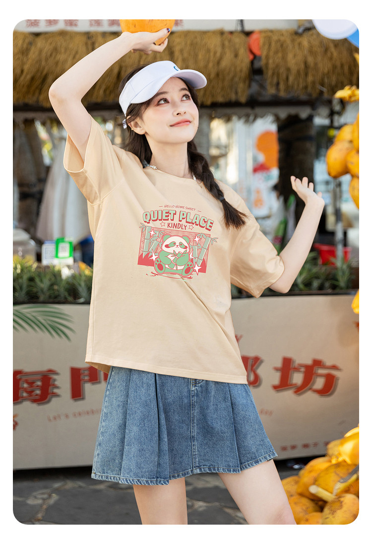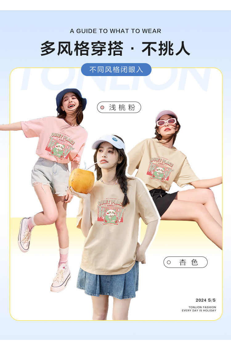 [功夫熊猫联名]唐狮撞色圆领短袖T恤女2024新款夏季纯棉上衣潮sz