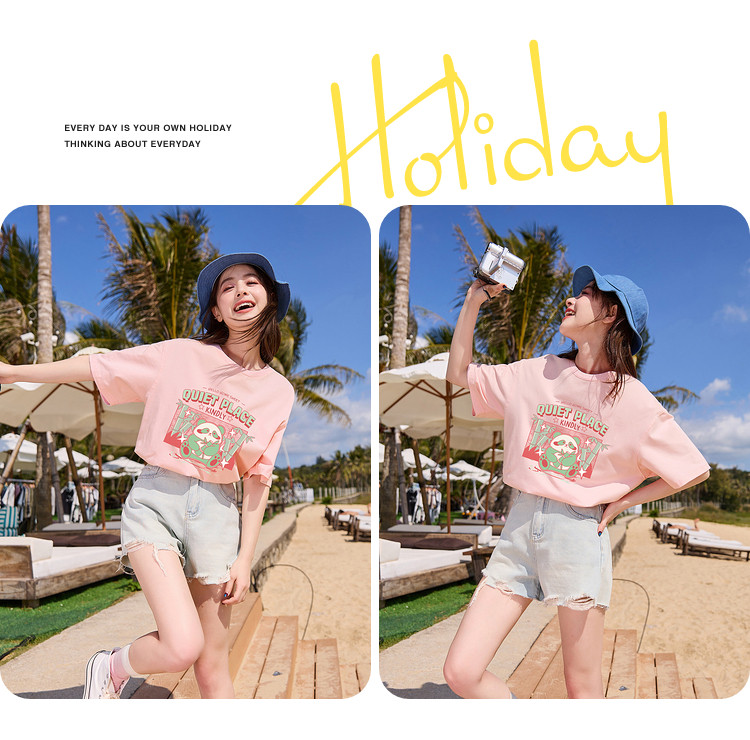 唐狮前胸大图案短袖T恤女2024新款夏季可爱圆领纯棉宽松t恤sz