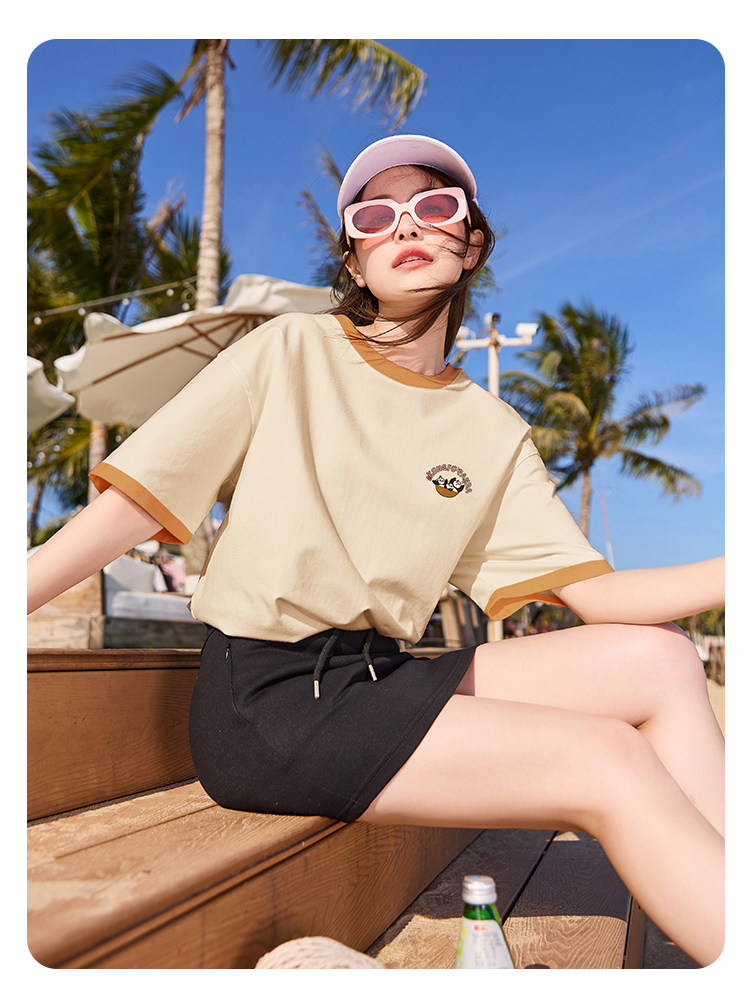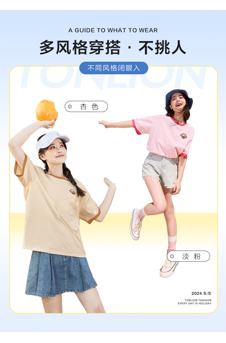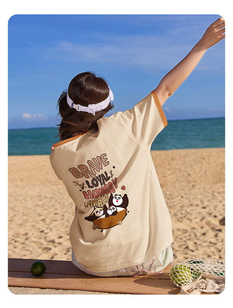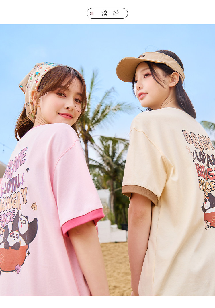 [功夫熊猫联名]唐狮撞色圆领短袖T恤女2024新款夏季纯棉上衣潮sz