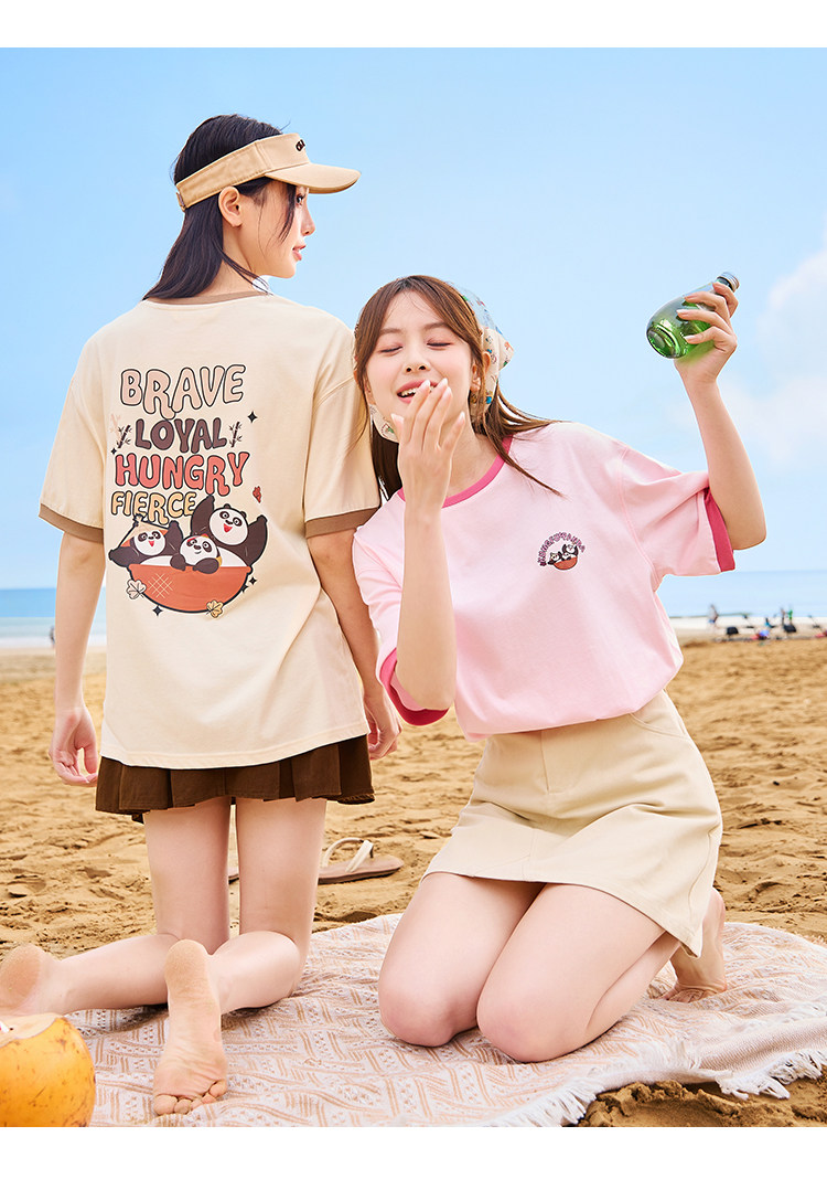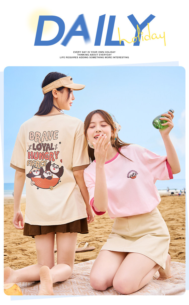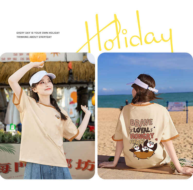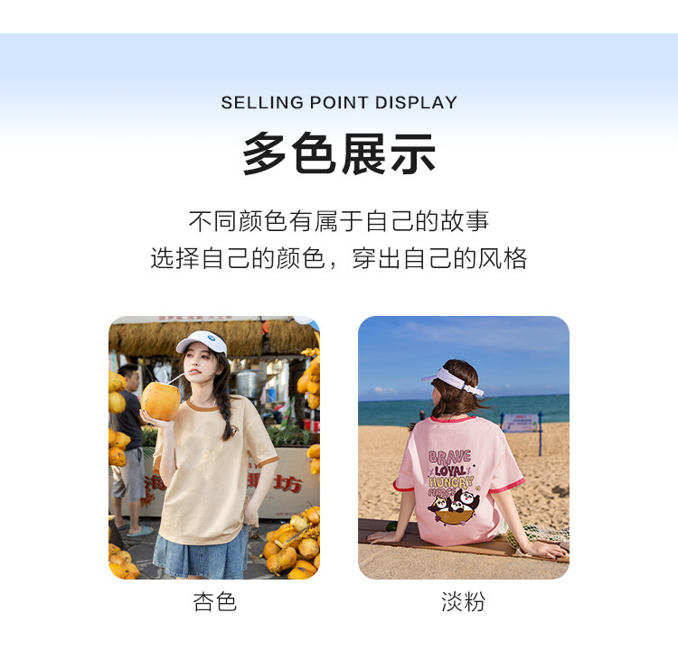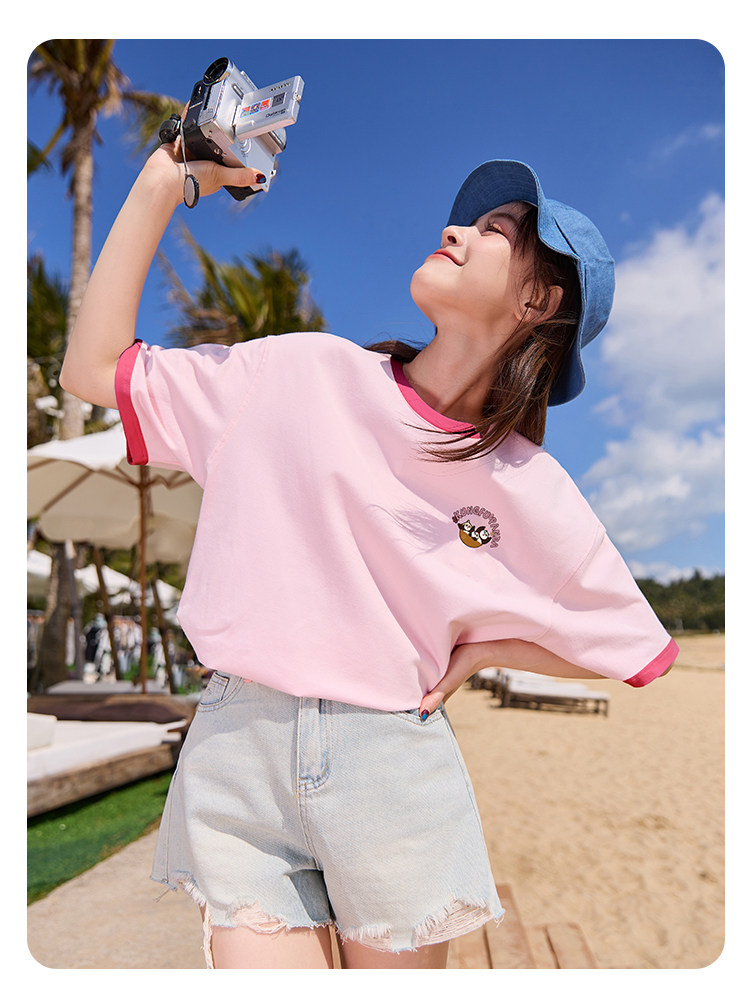 [功夫熊猫联名]唐狮撞色圆领短袖T恤女2024新款夏季纯棉上衣潮sz