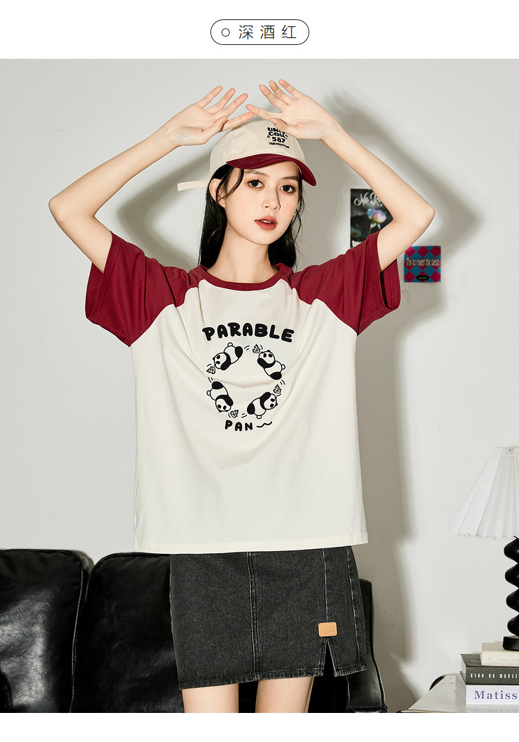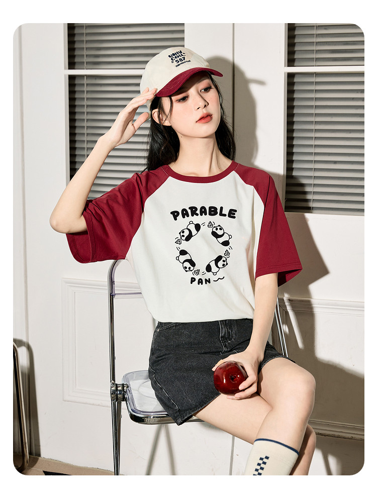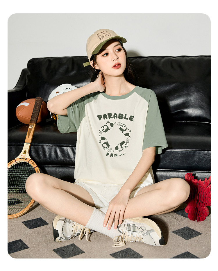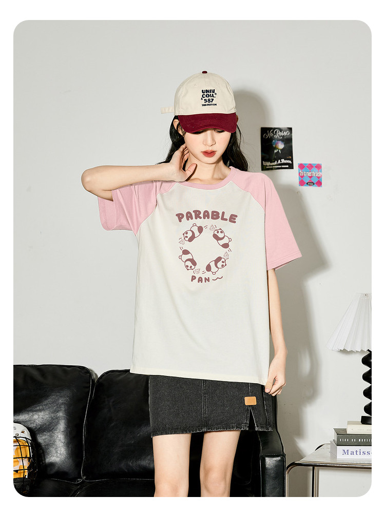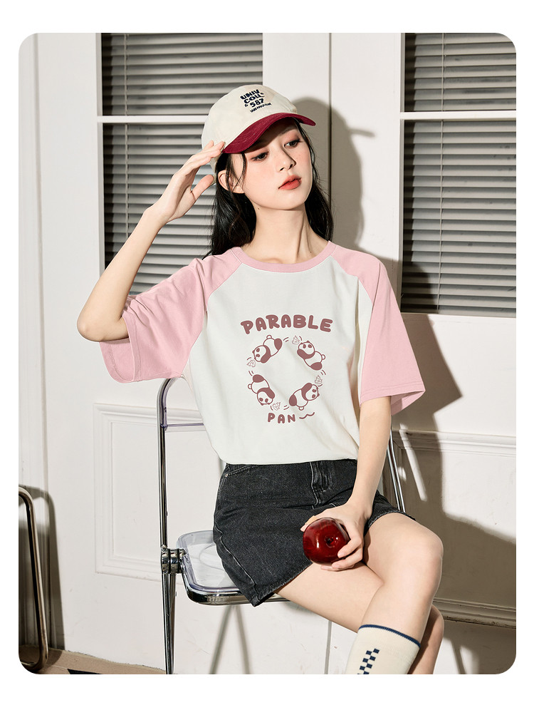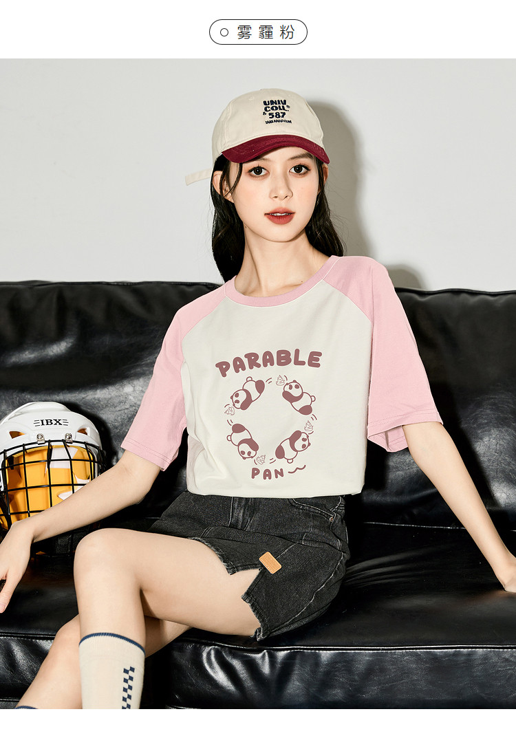 唐狮2024夏新款短袖T恤女宽松插肩袖撞色熊猫趣味印花别致上衣sz