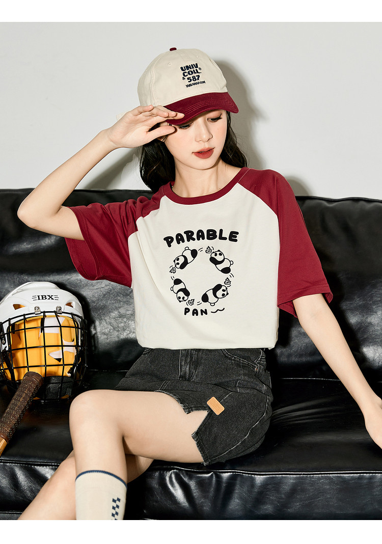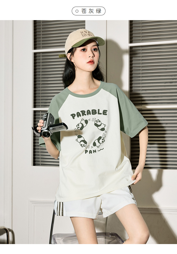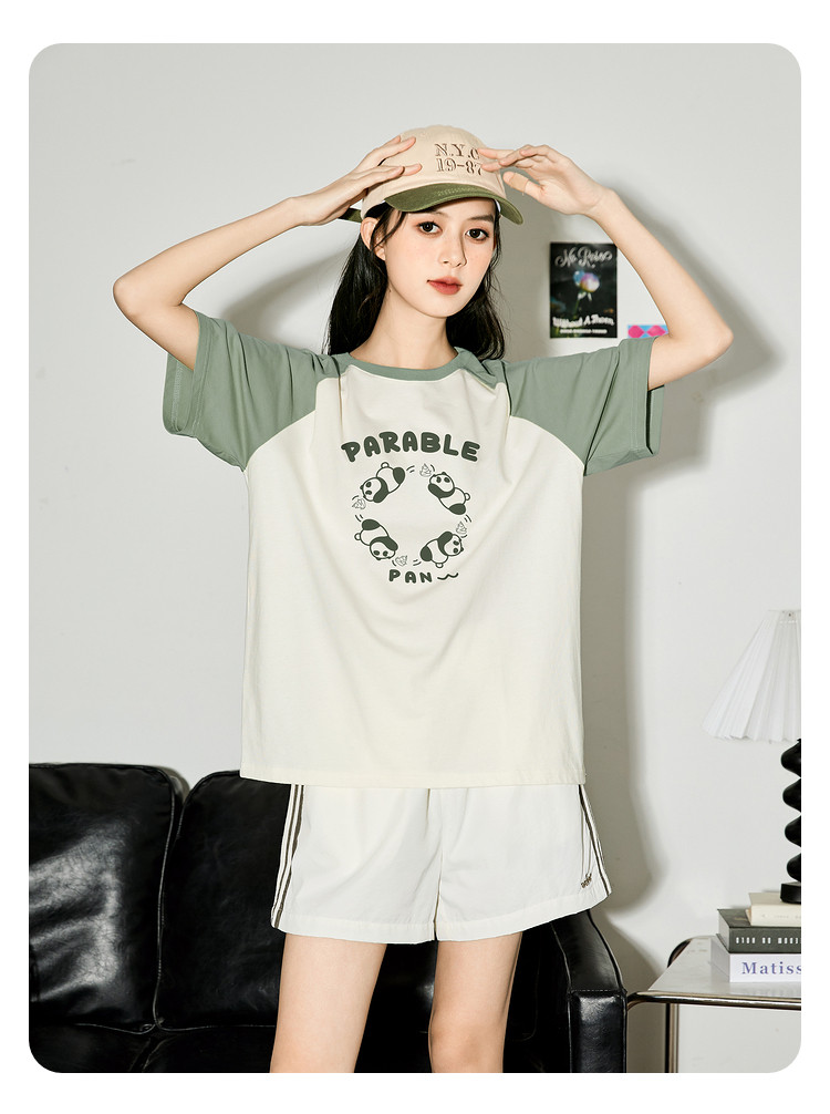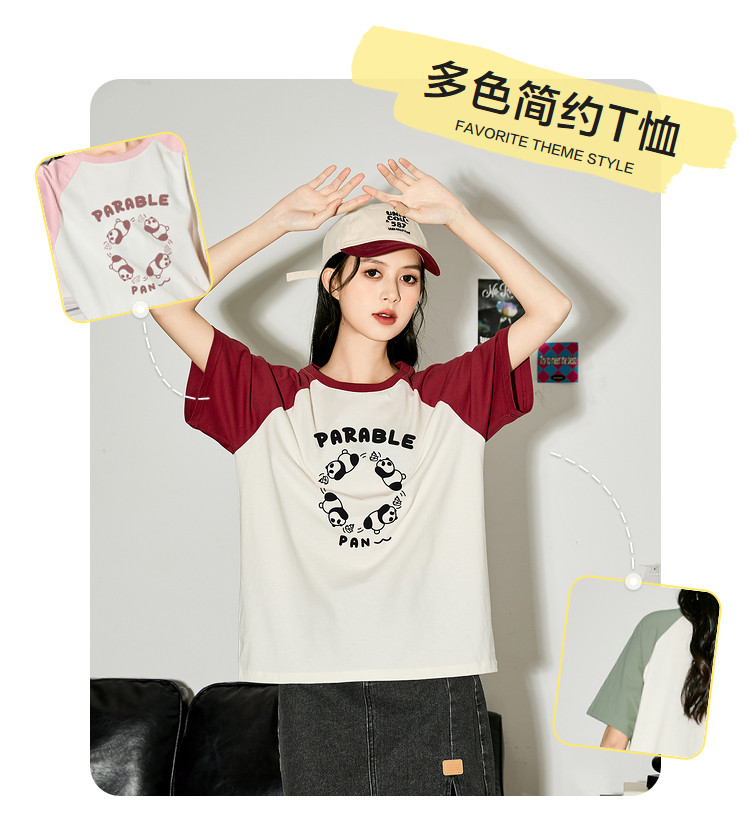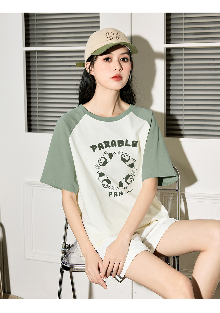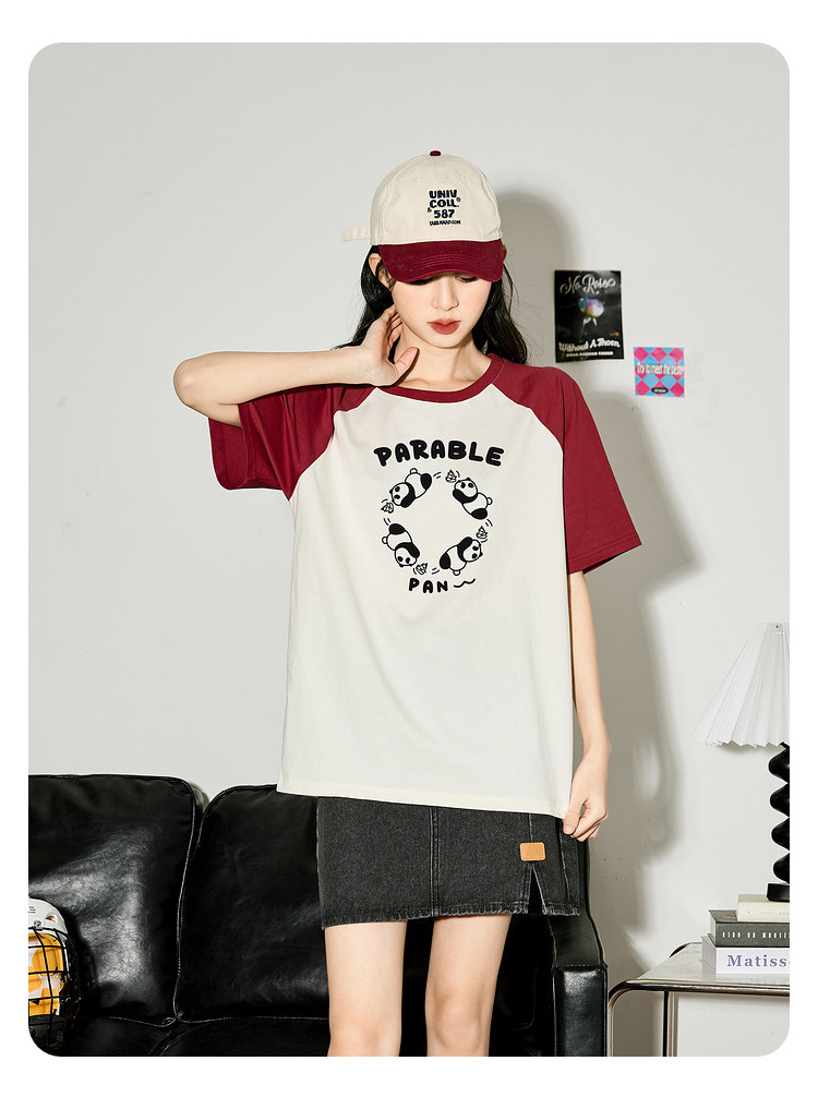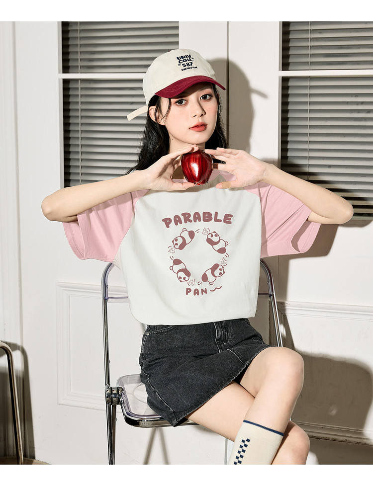 唐狮2024夏新款短袖T恤女宽松插肩袖撞色熊猫趣味印花别致上衣sz