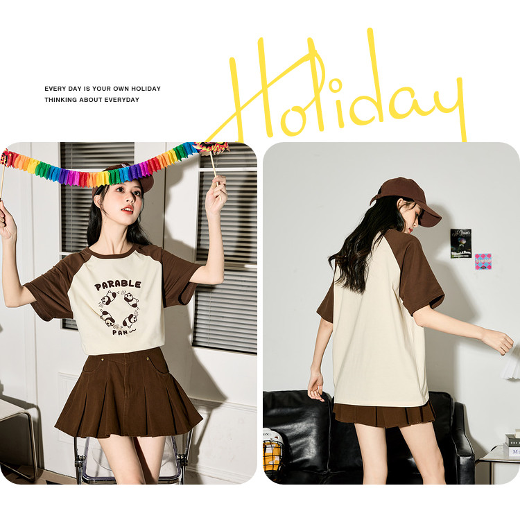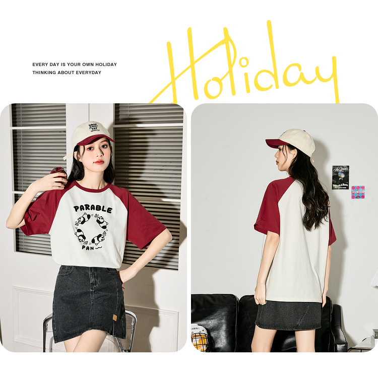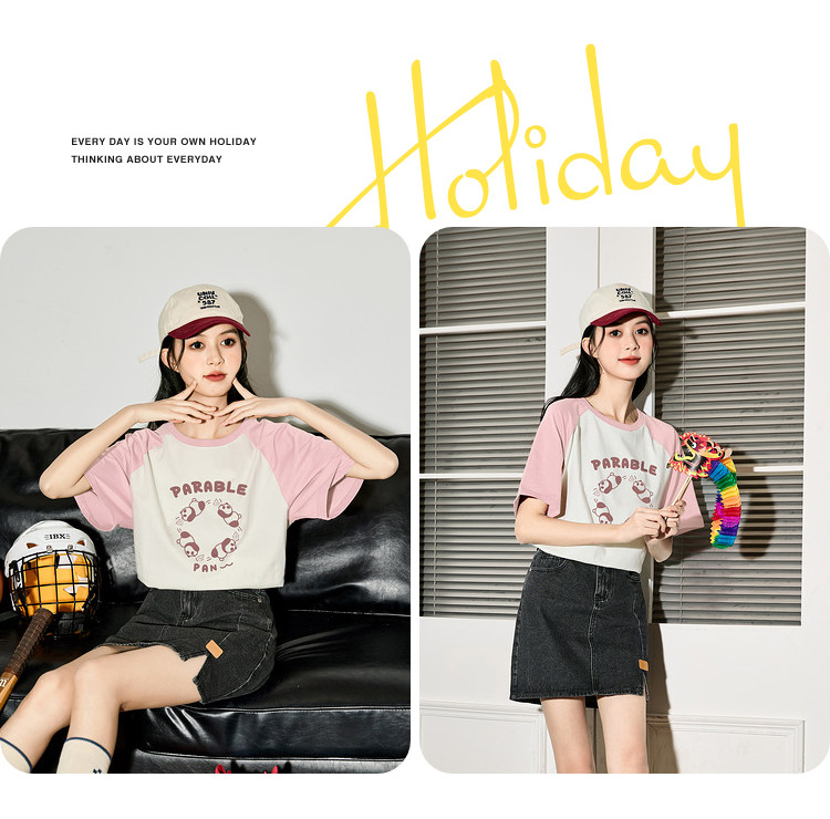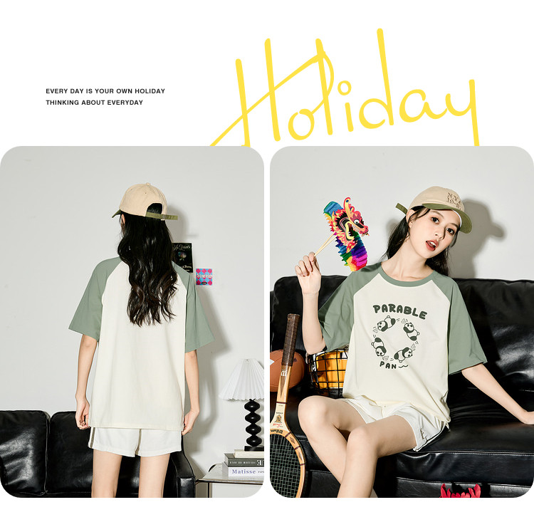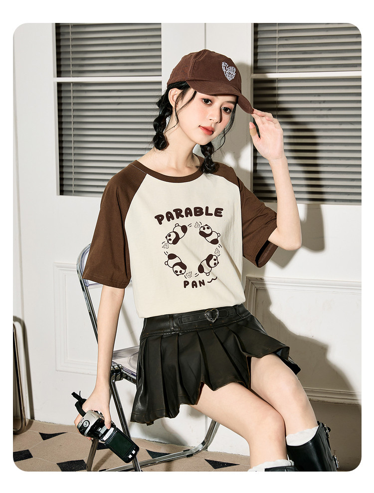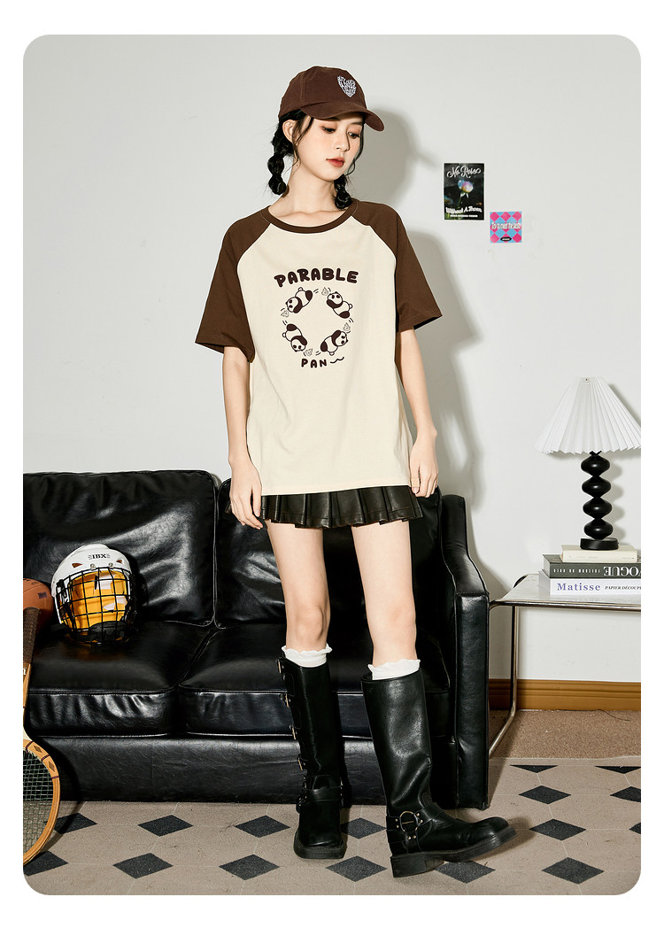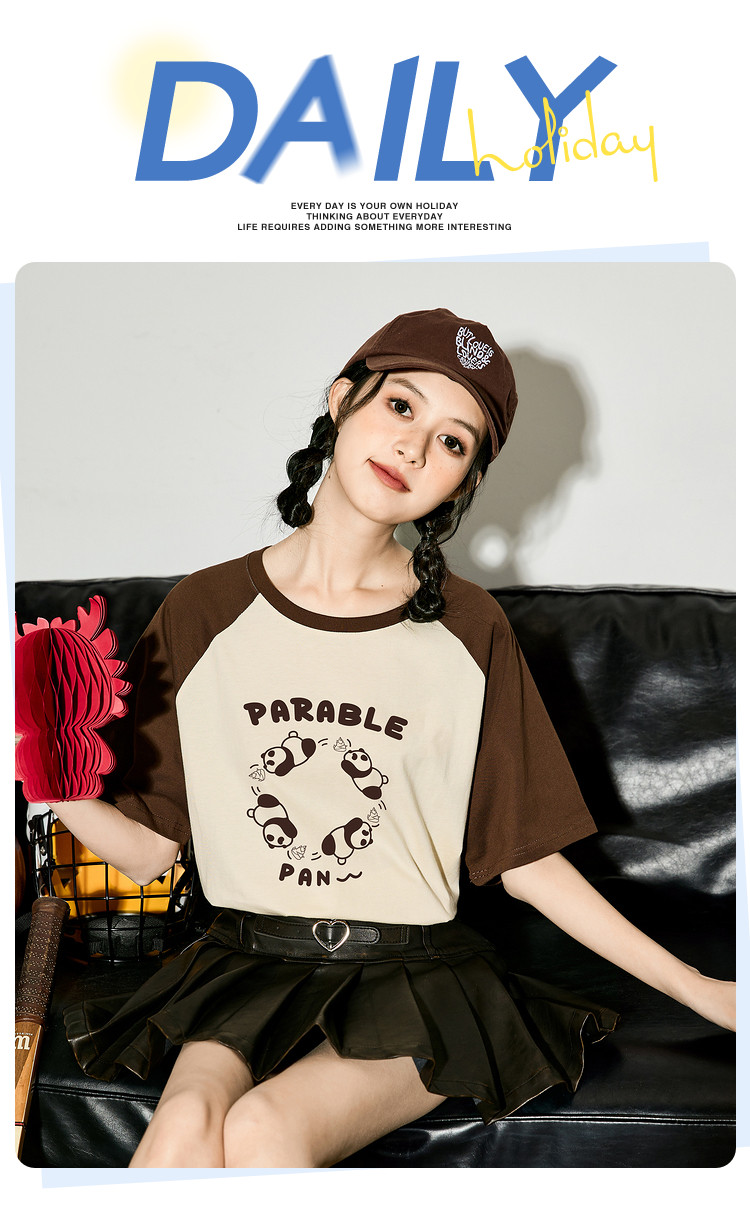 唐狮2024夏新款短袖T恤女宽松插肩袖撞色熊猫趣味印花别致上衣sz