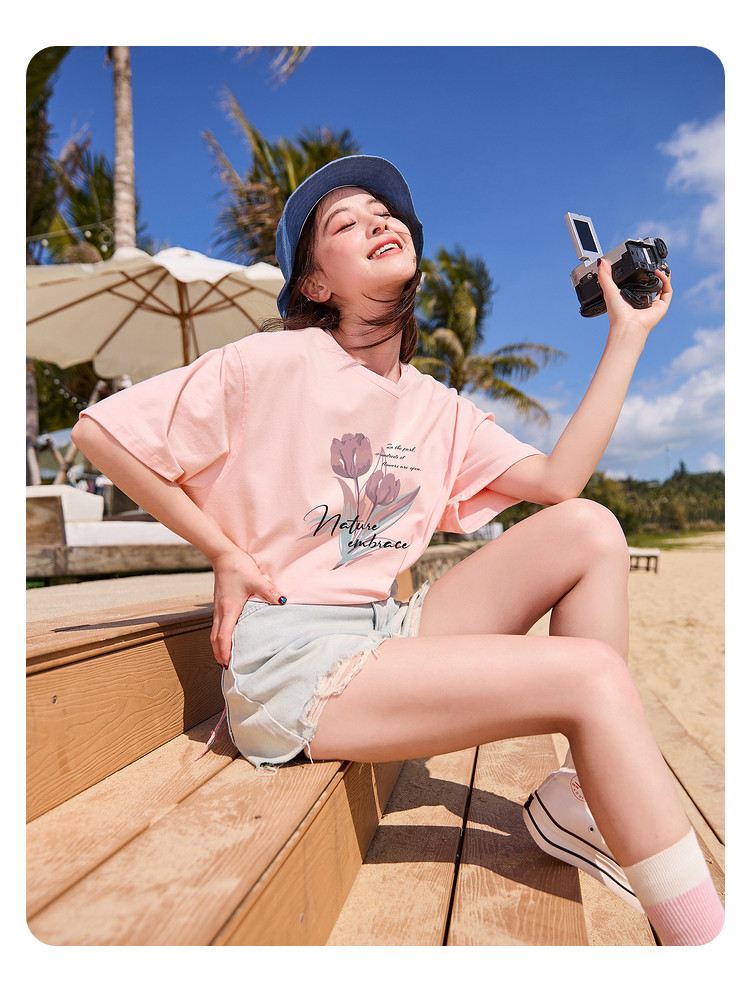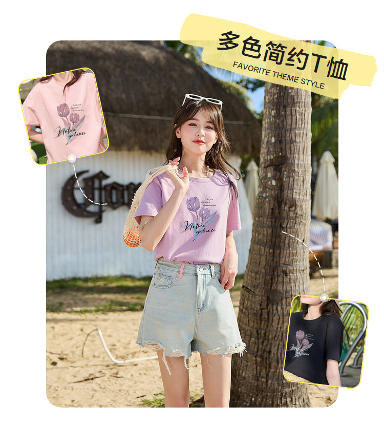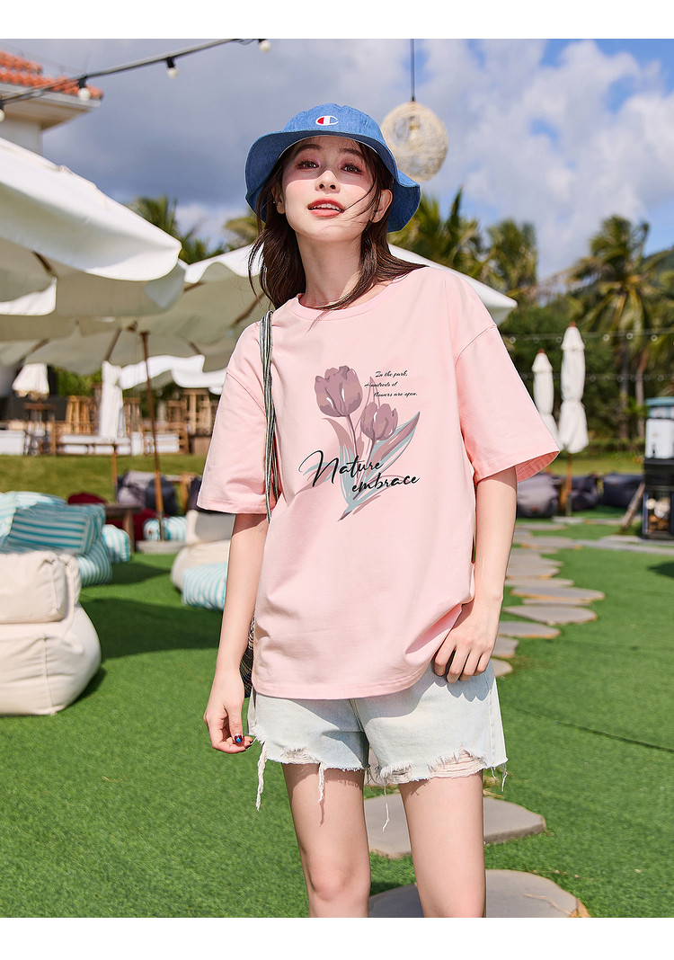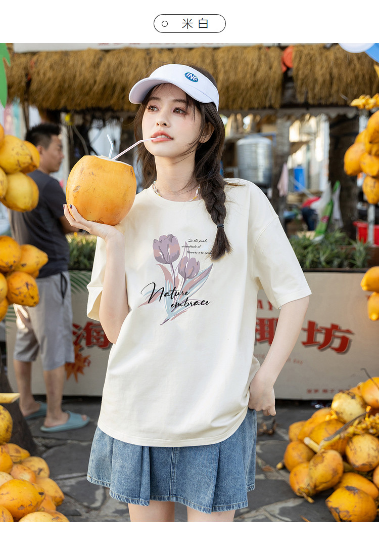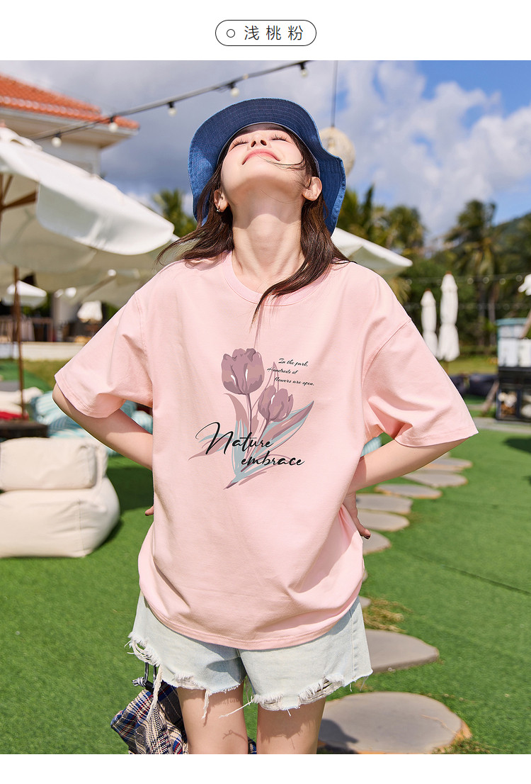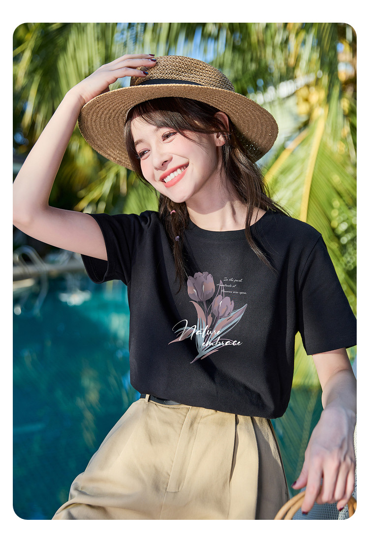 唐狮2024新款夏季水彩花卉短袖女T恤女甜美独特别致宽松上衣sz