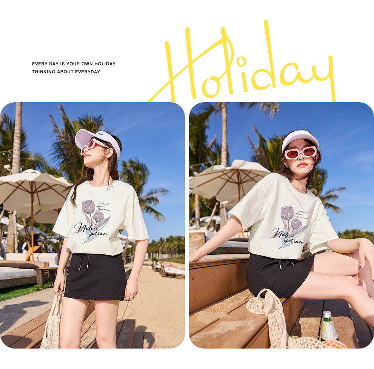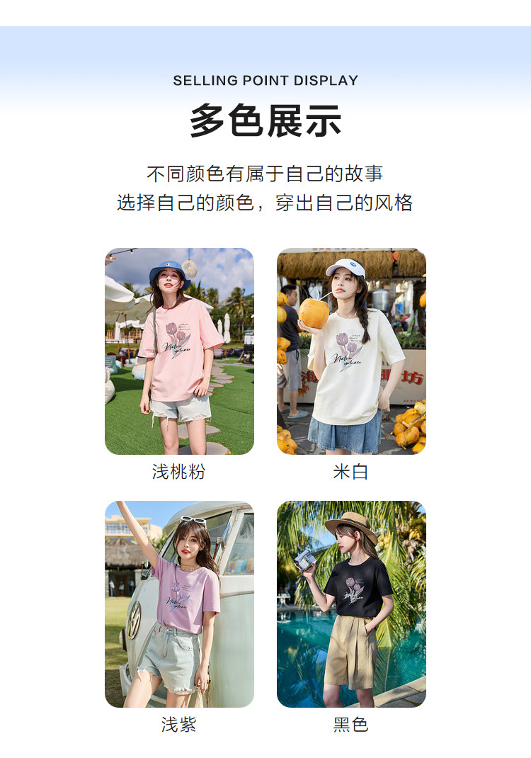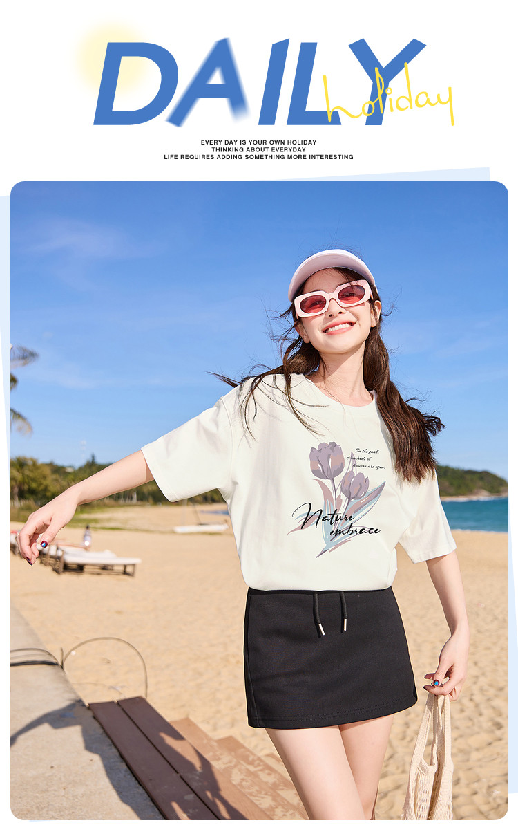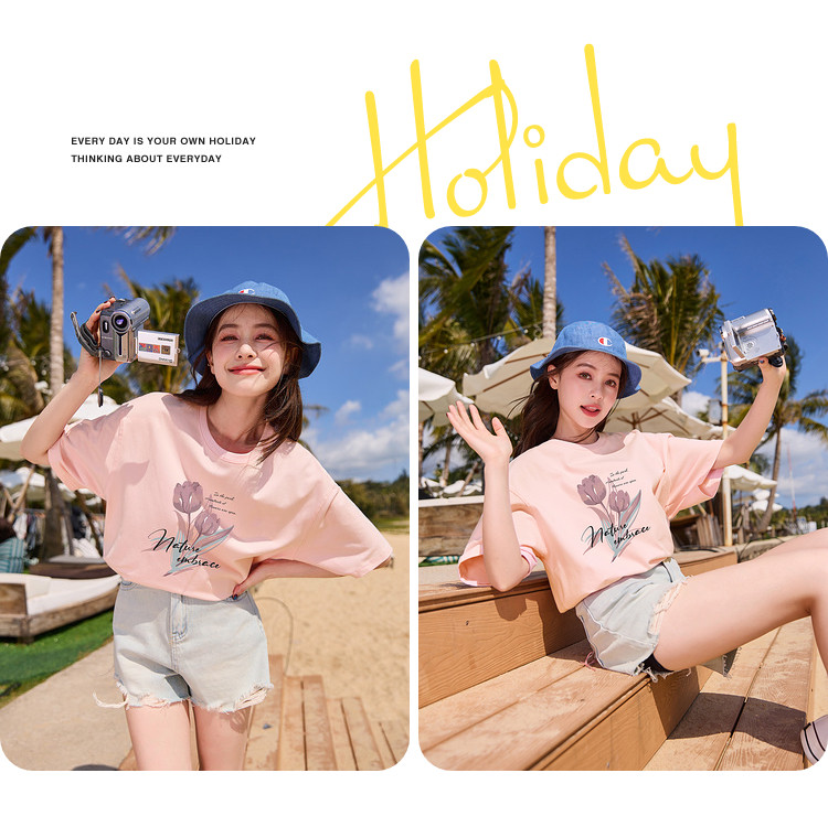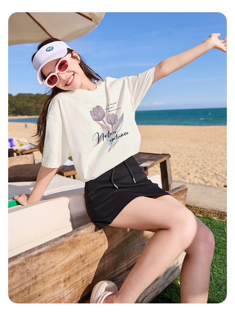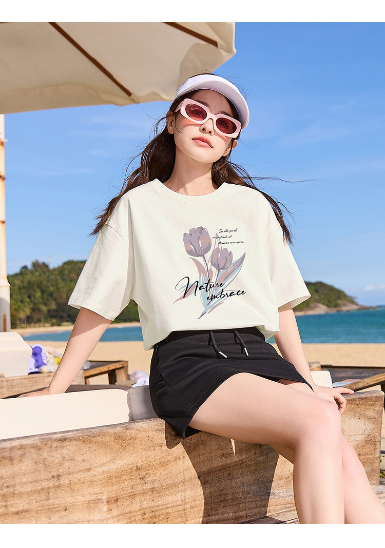唐狮2024新款夏季水彩花卉短袖女T恤女甜美独特别致宽松上衣sz