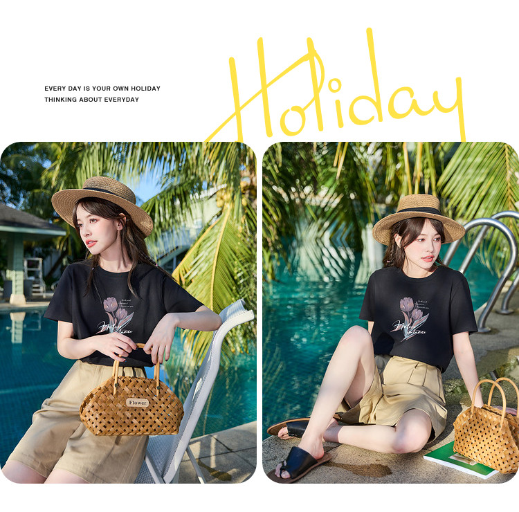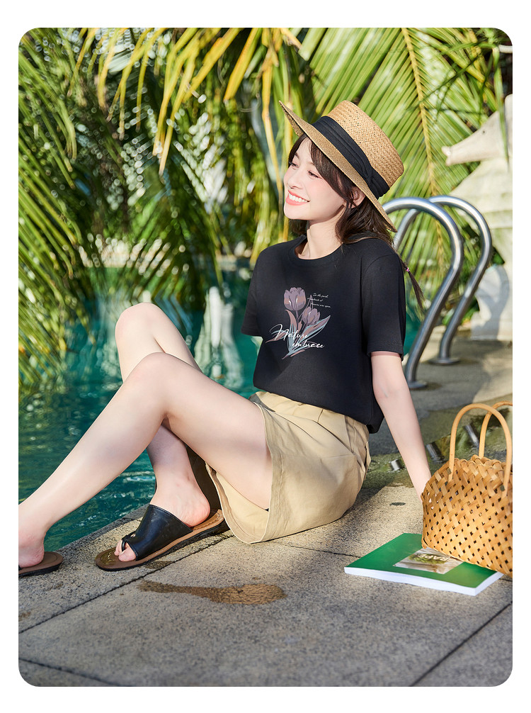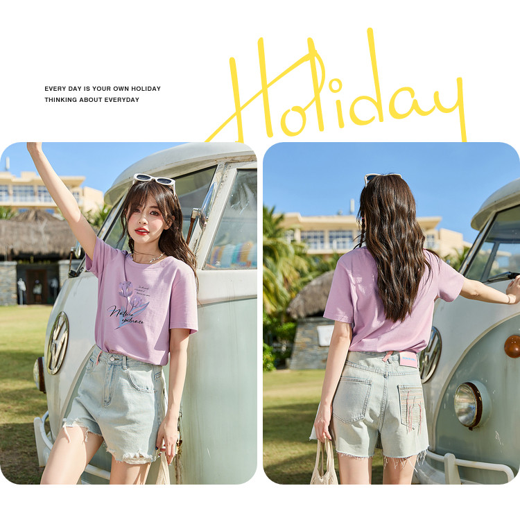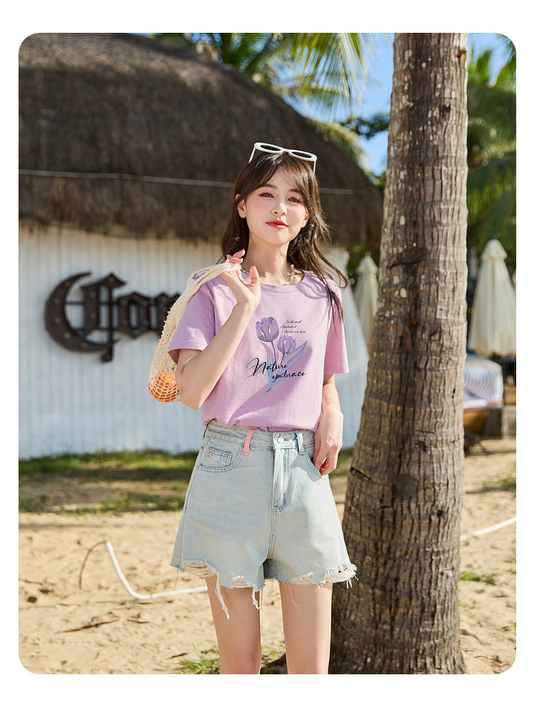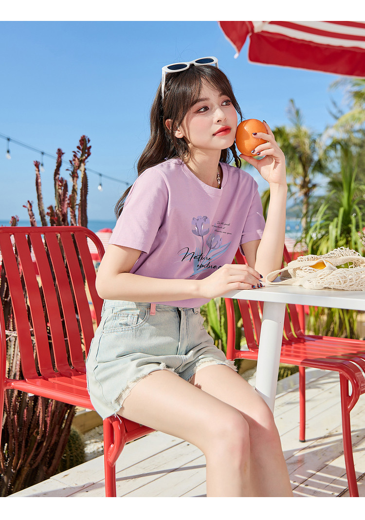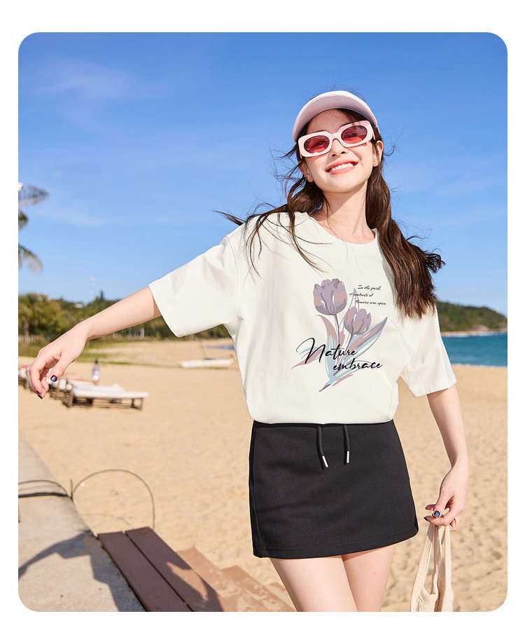 唐狮2024新款夏季水彩花卉短袖女T恤女甜美独特别致宽松上衣sz