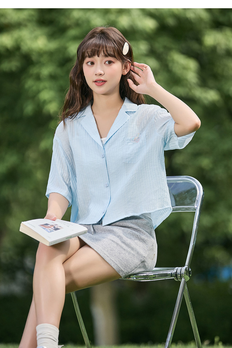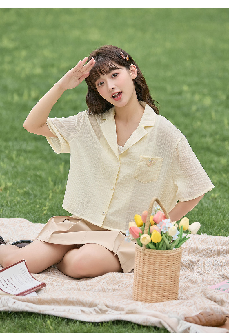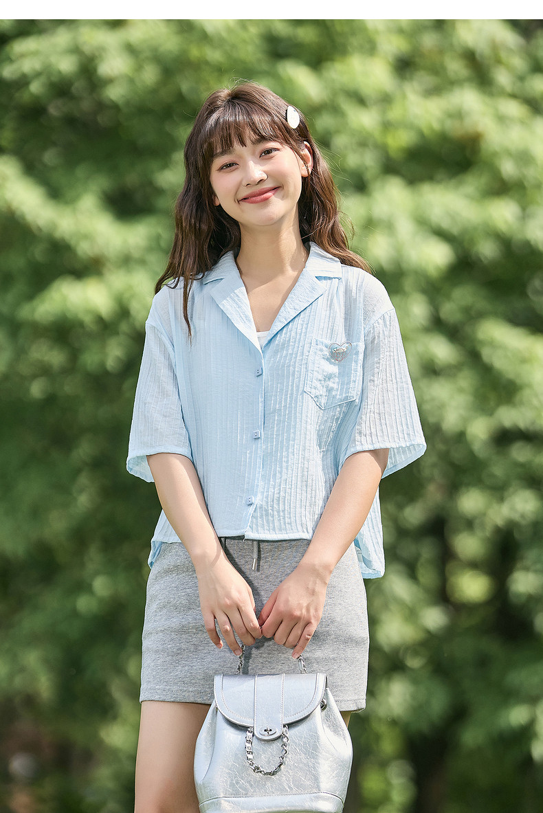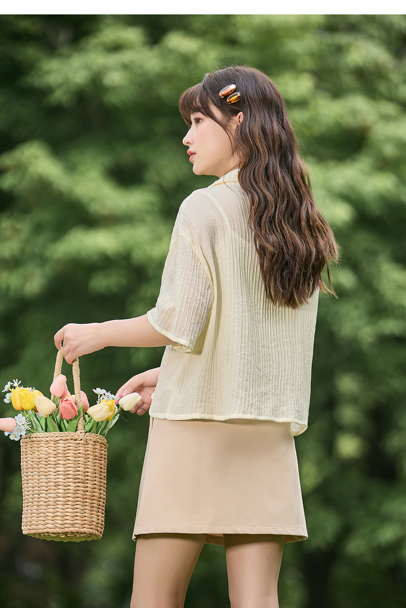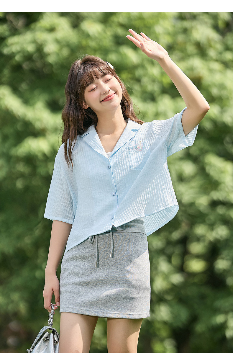 唐狮2024春夏新款短袖衬衫女肌理感轻薄短款衬衣宽松开衫正肩上衣