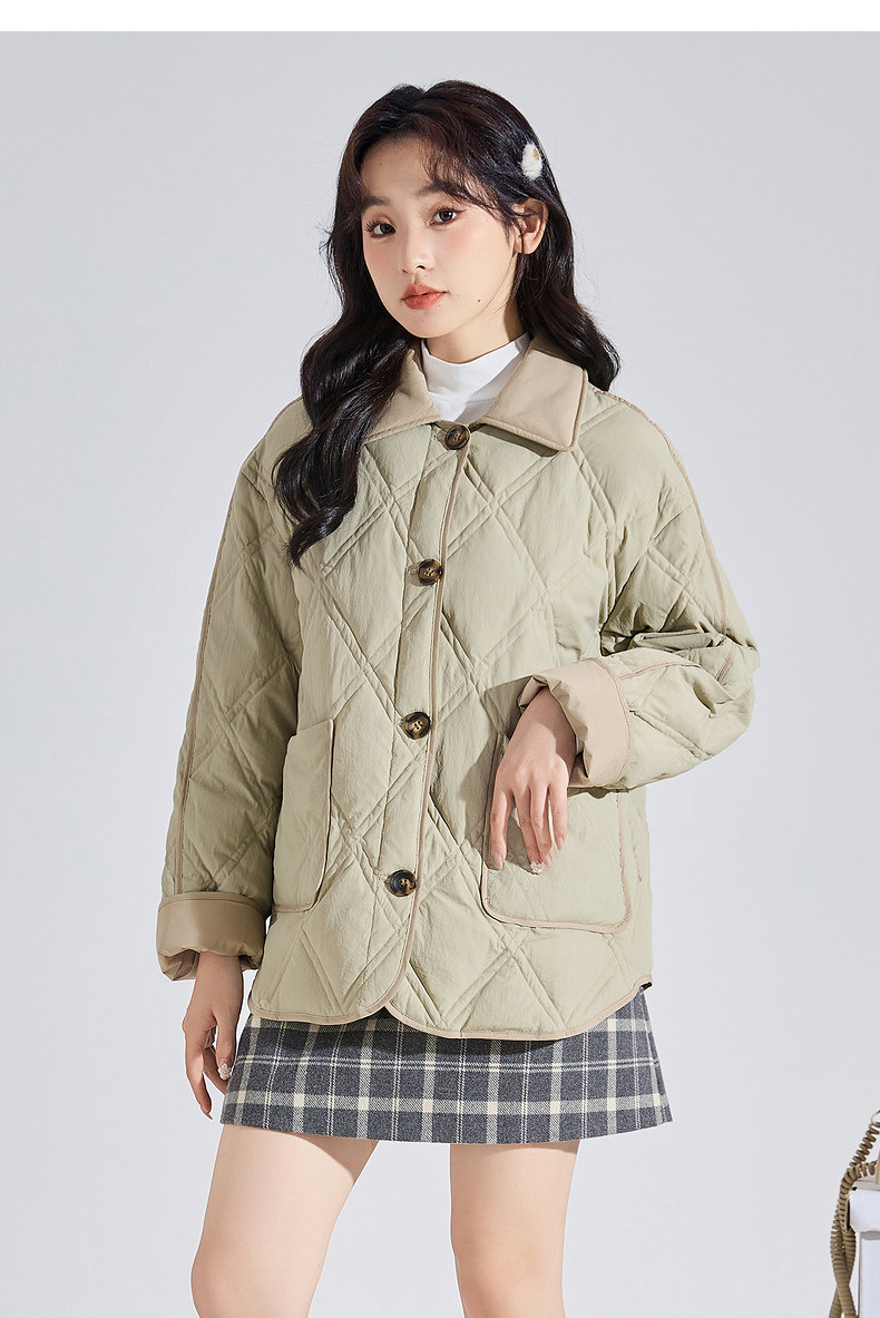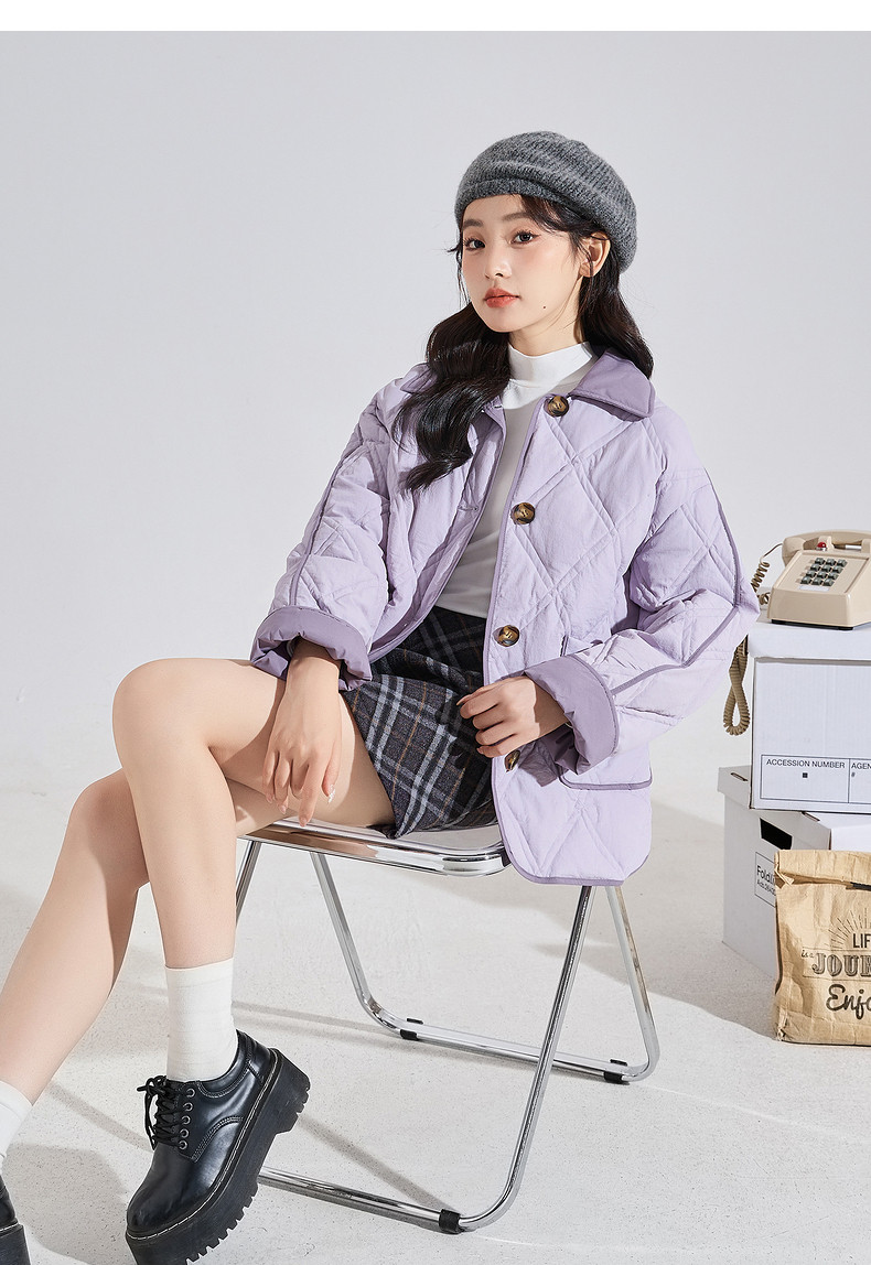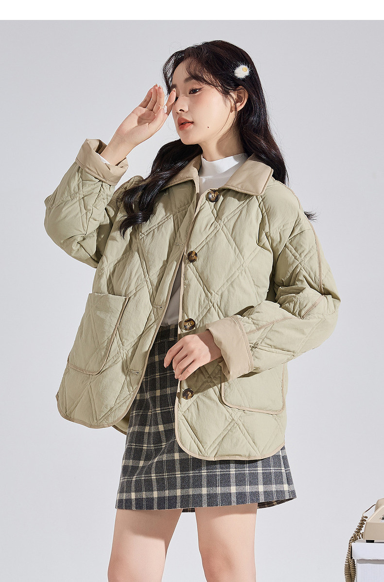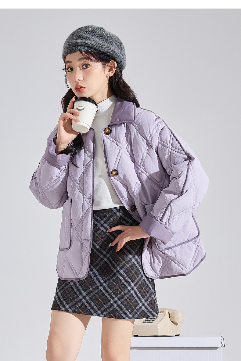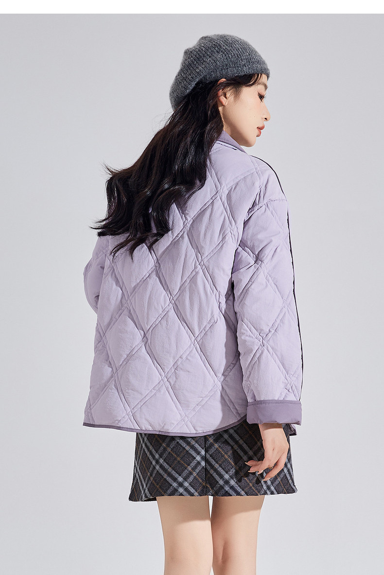 2024冬季女无领菱形格短款羽绒服简约百搭韩版休闲慵懒风时尚