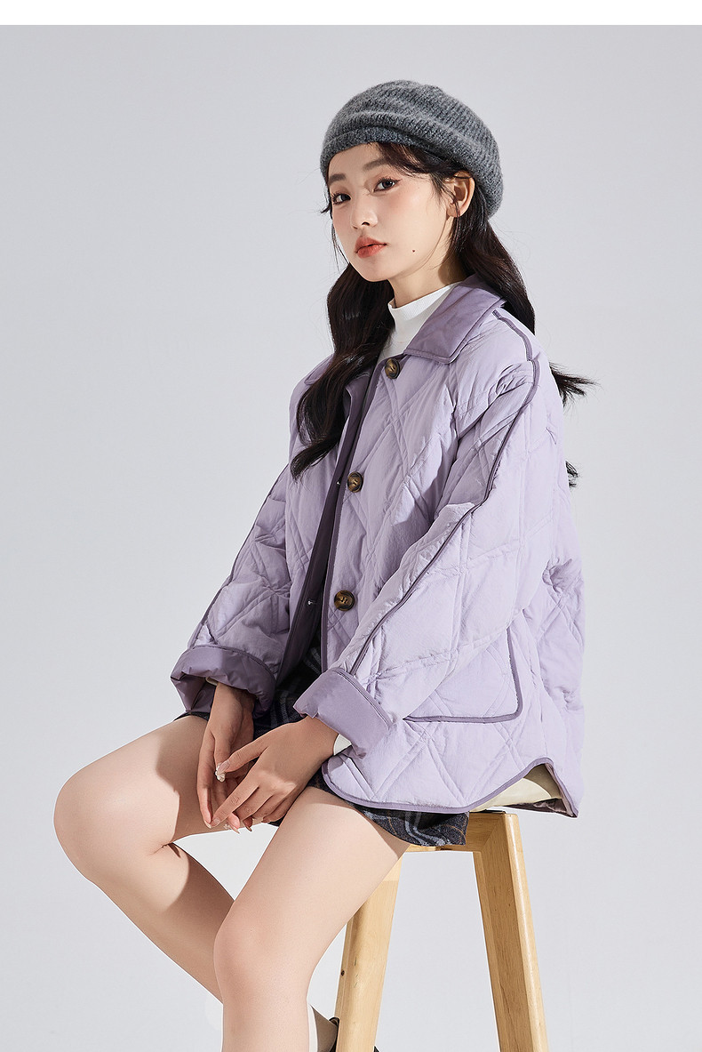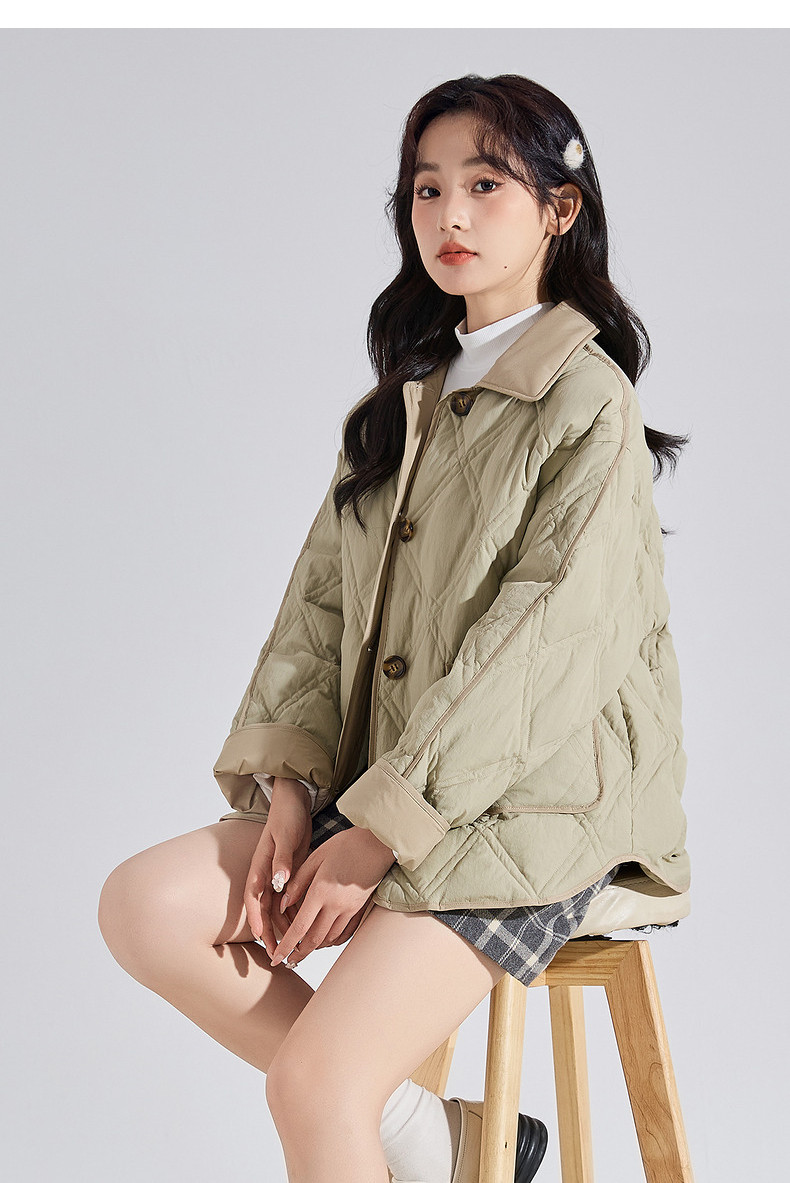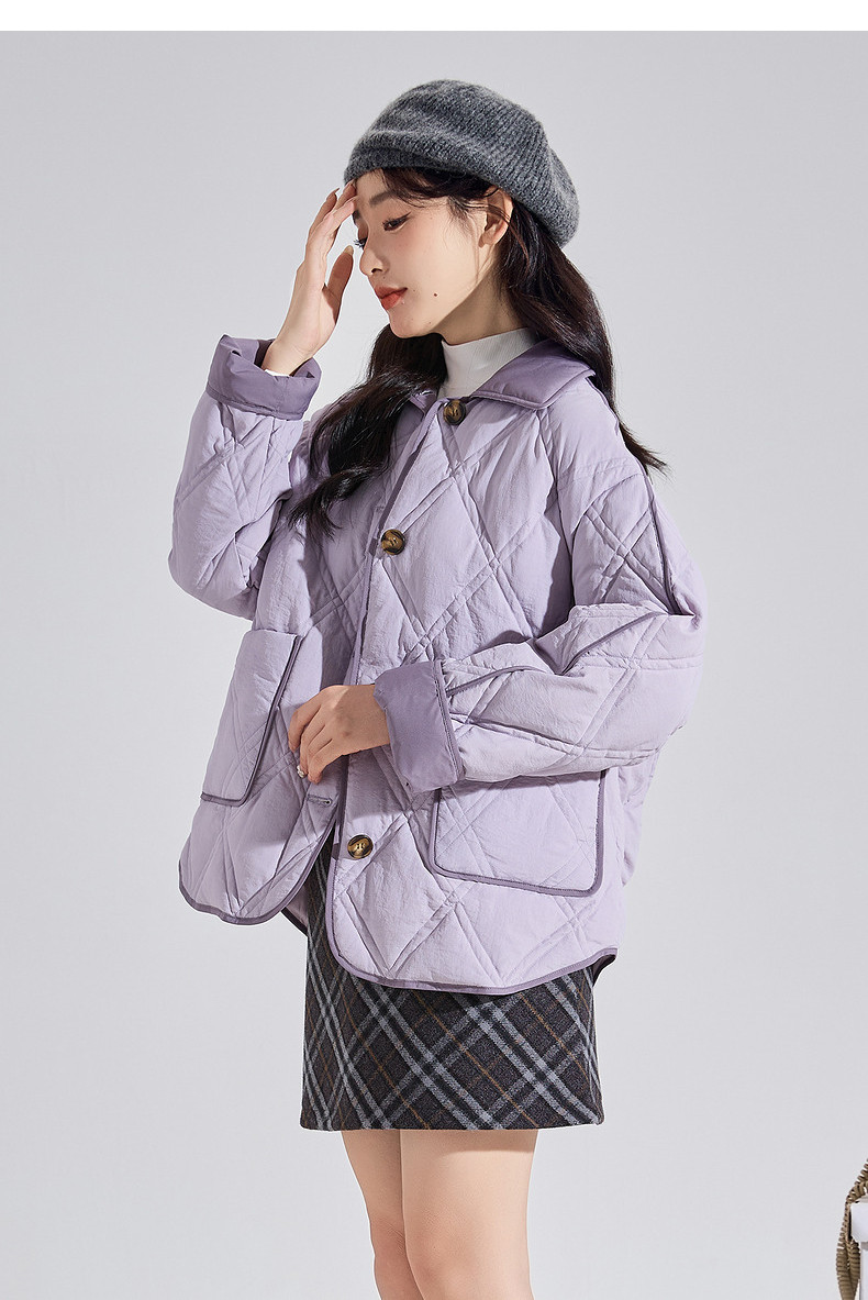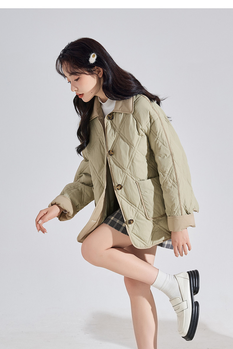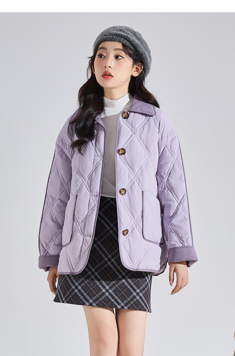 2024冬季女无领菱形格短款羽绒服简约百搭韩版休闲慵懒风时尚