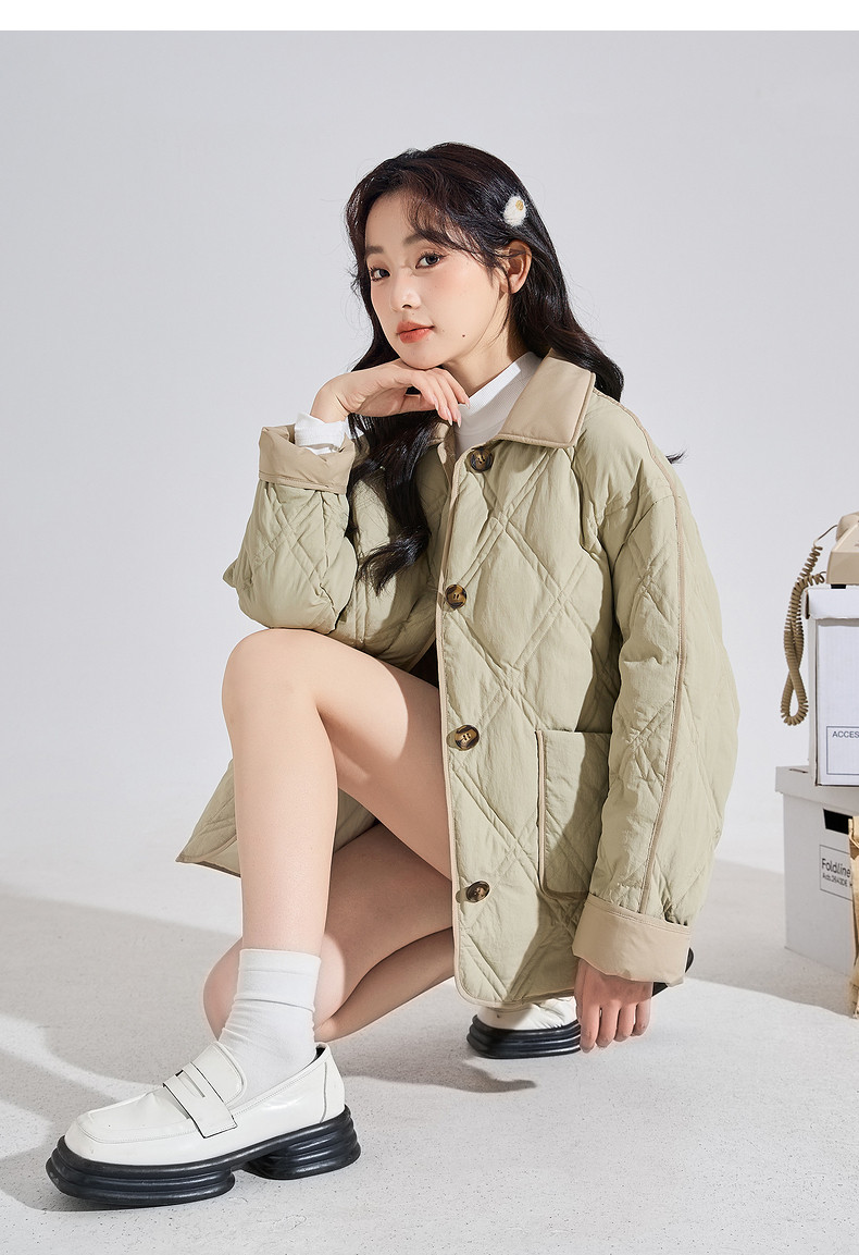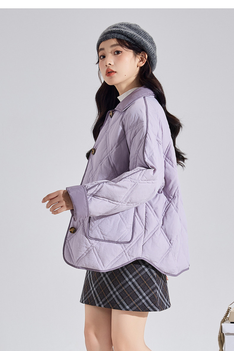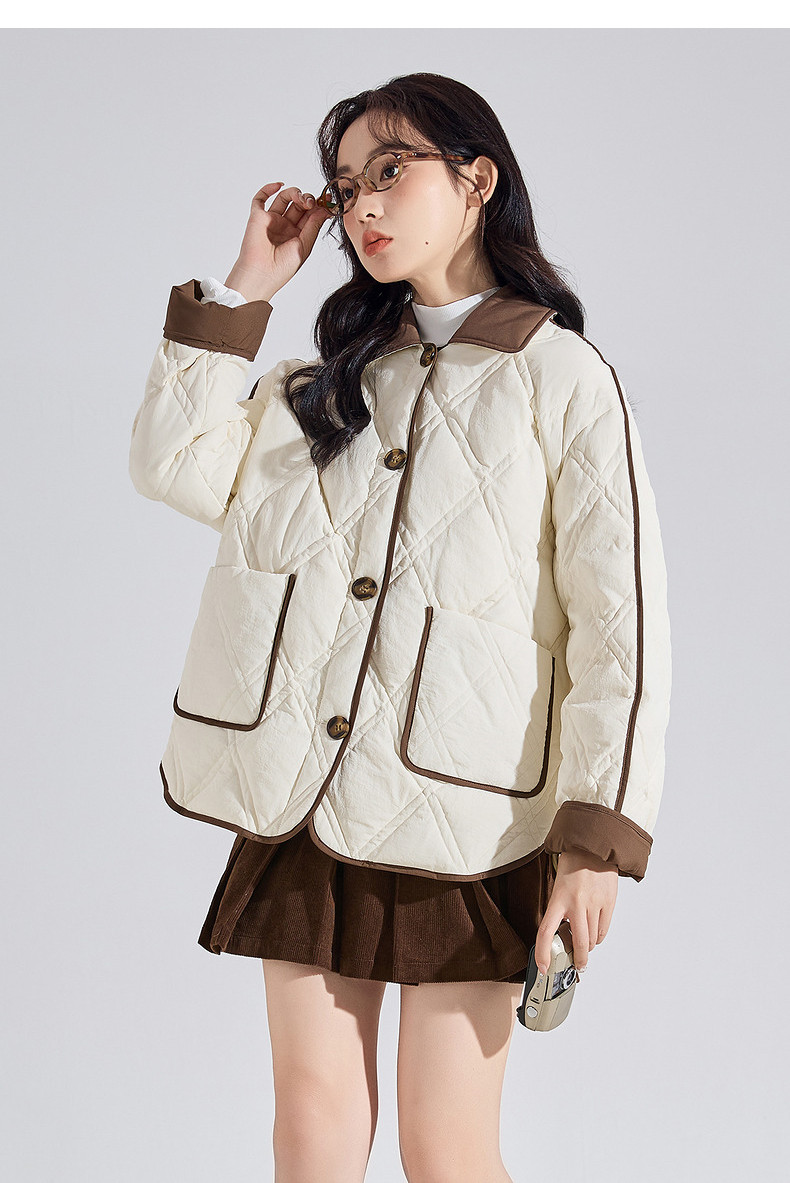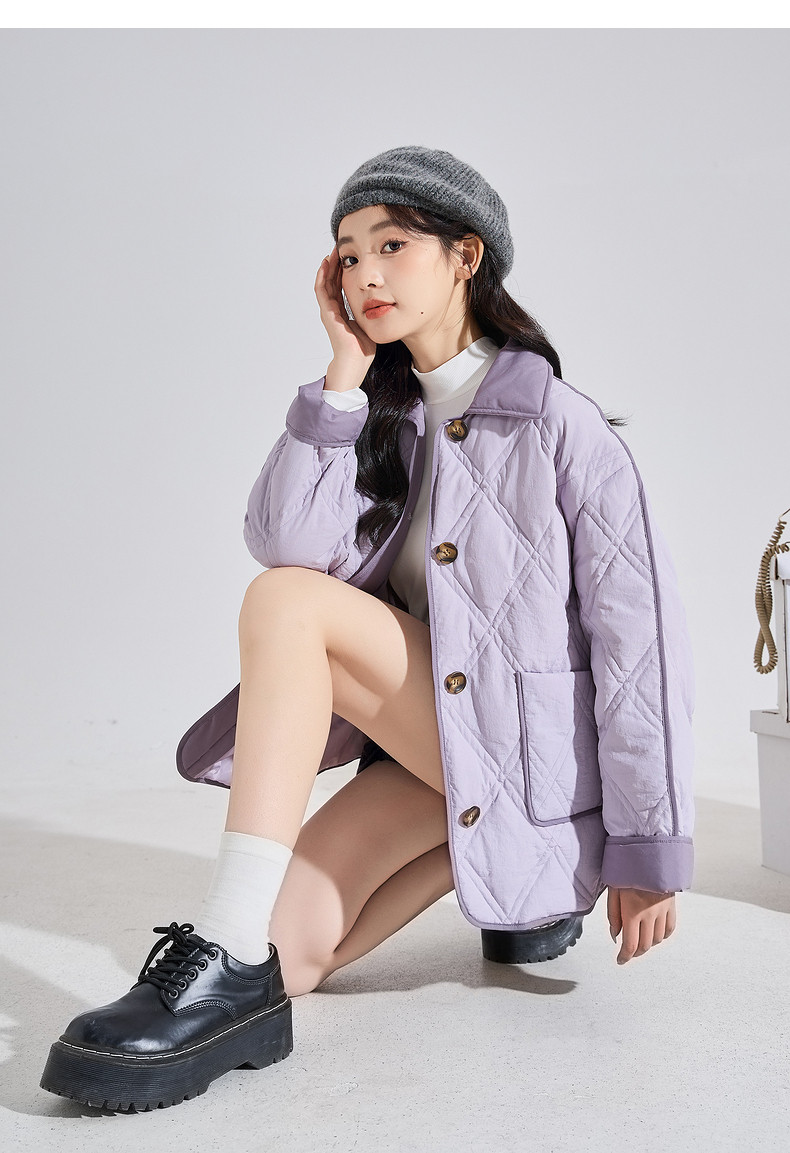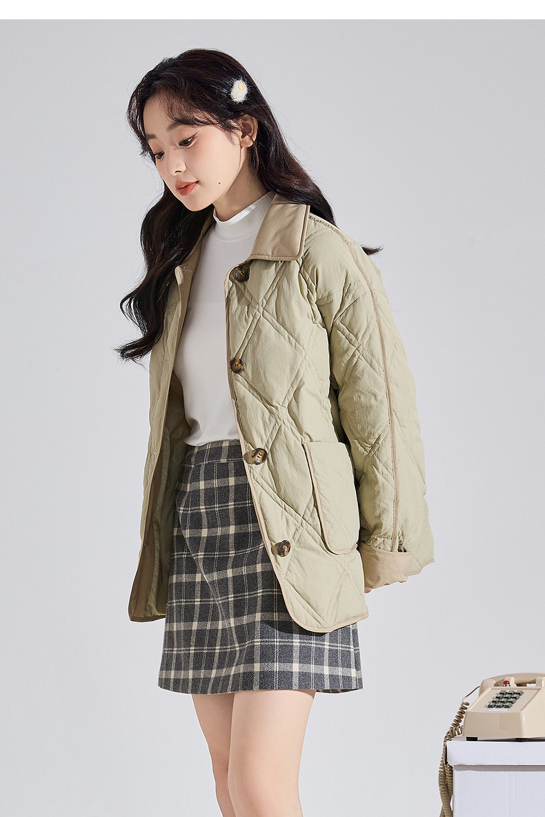2024冬季女无领菱形格短款羽绒服简约百搭韩版休闲慵懒风时尚