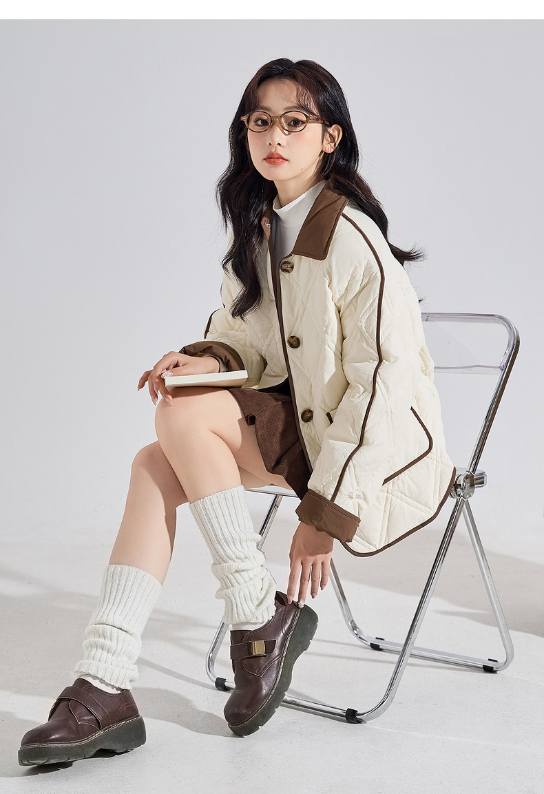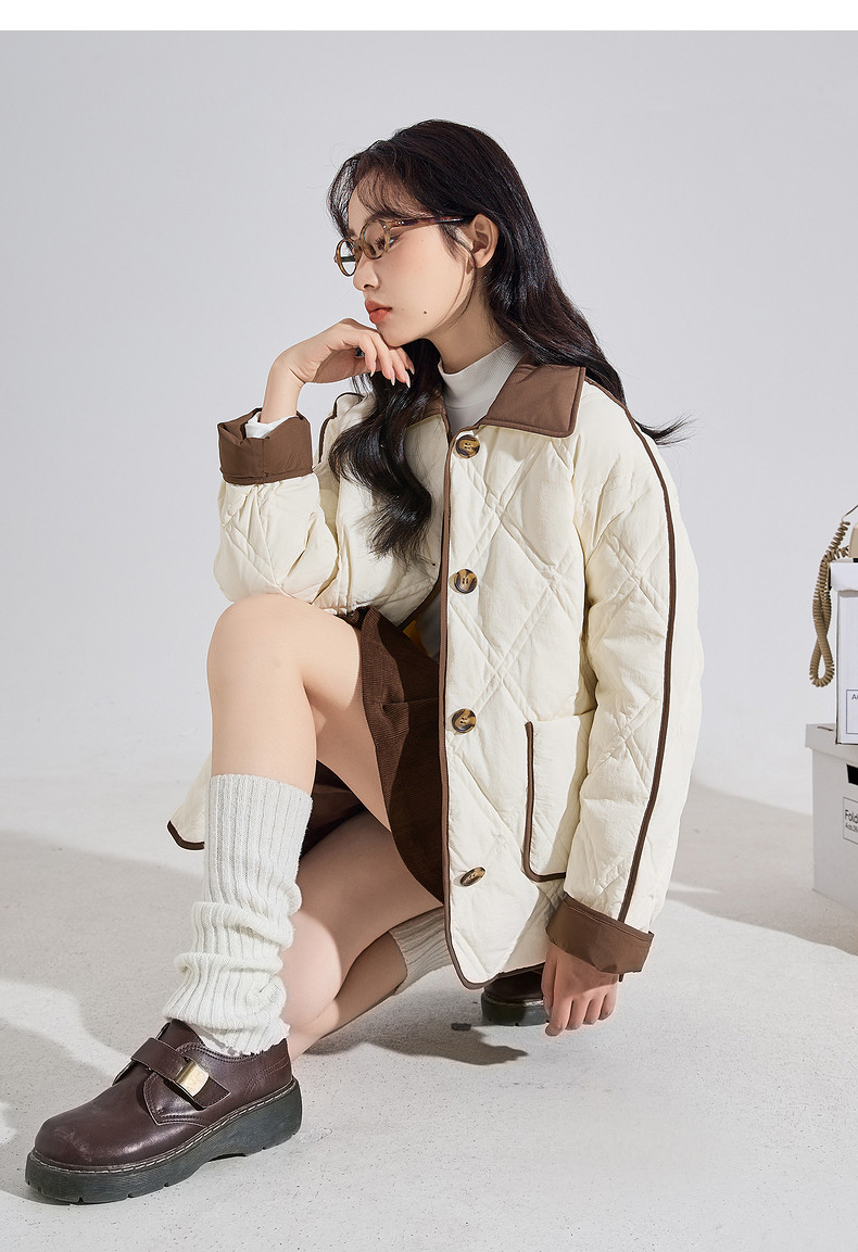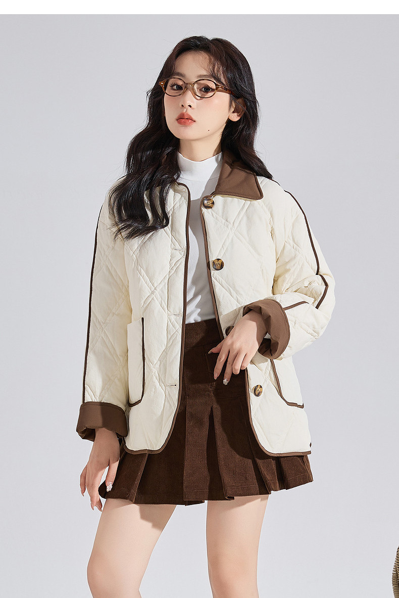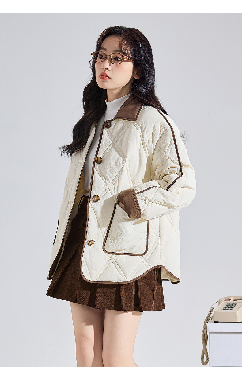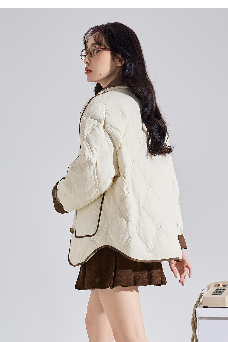 2024冬季女无领菱形格短款羽绒服简约百搭韩版休闲慵懒风时尚